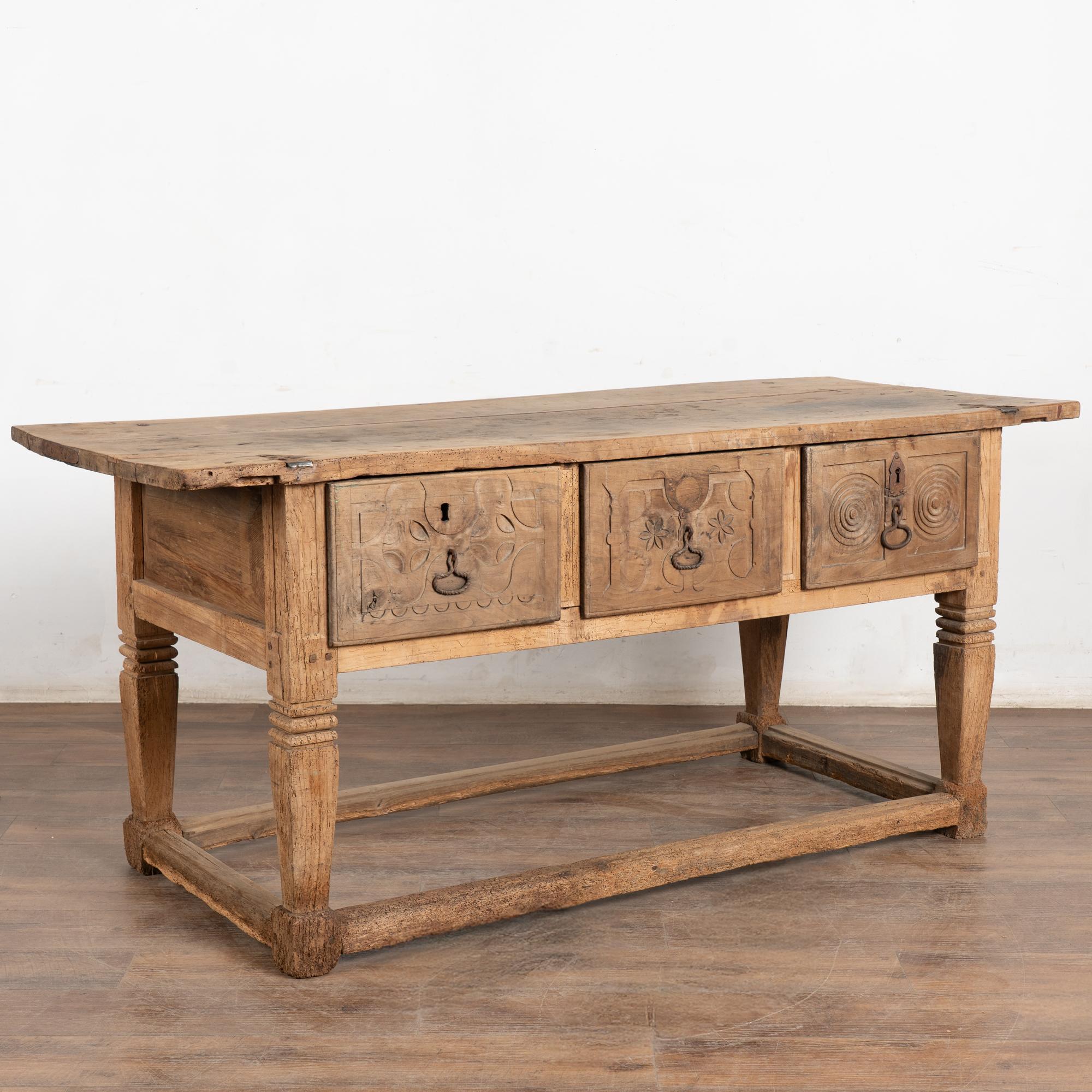 This handsome chestnut table has rustic appeal with three large carved drawers resting on stretcher base.