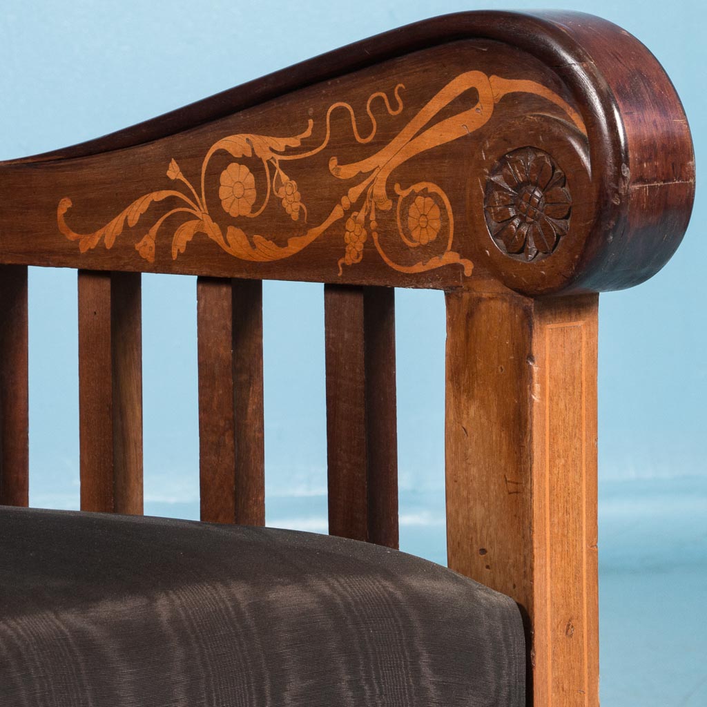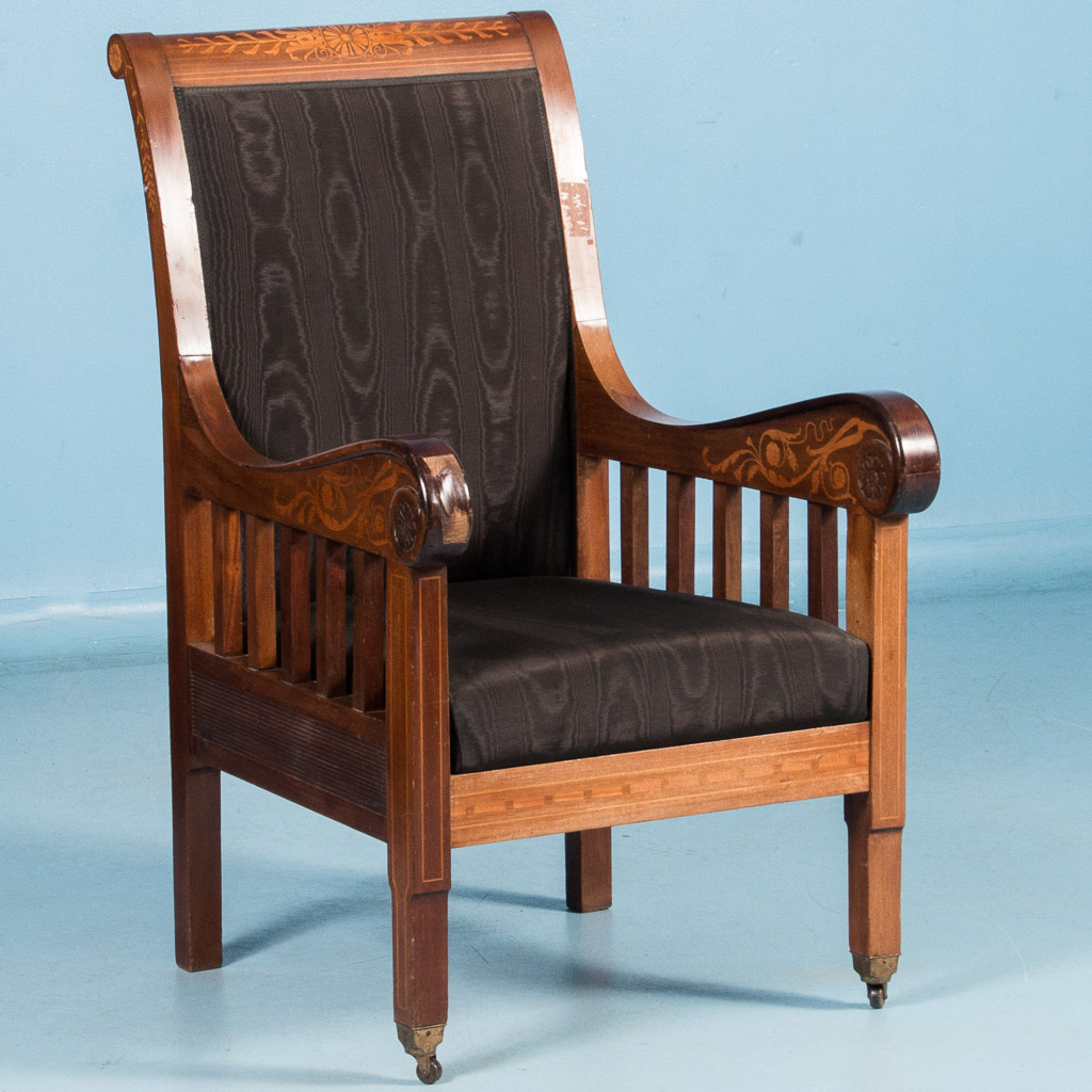 Large mahogany armchair from Denmark, circa 1910, with upholstered seat and back. The mahogany is inlaid with a lighter birch on the curved arm rests, the back and front rail.