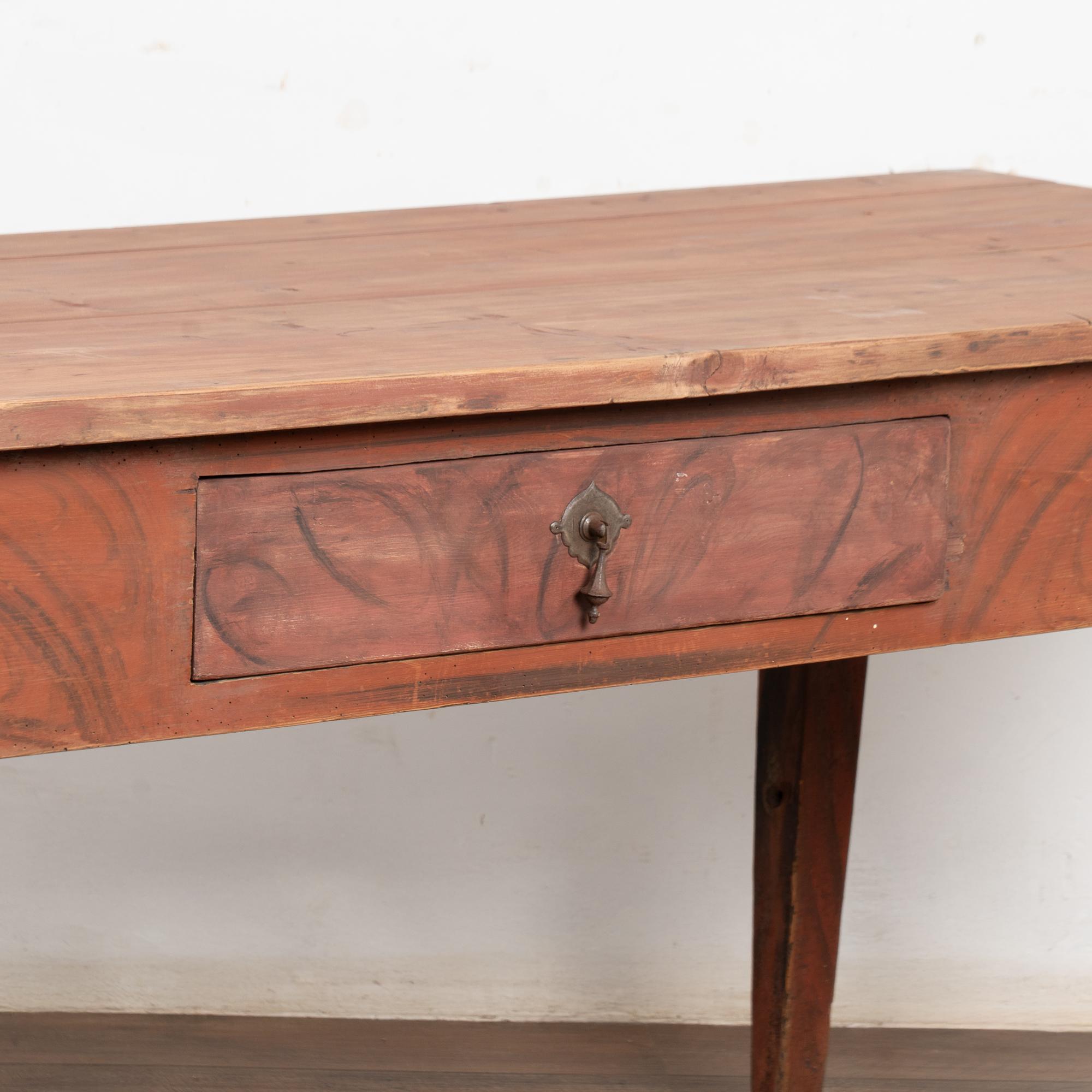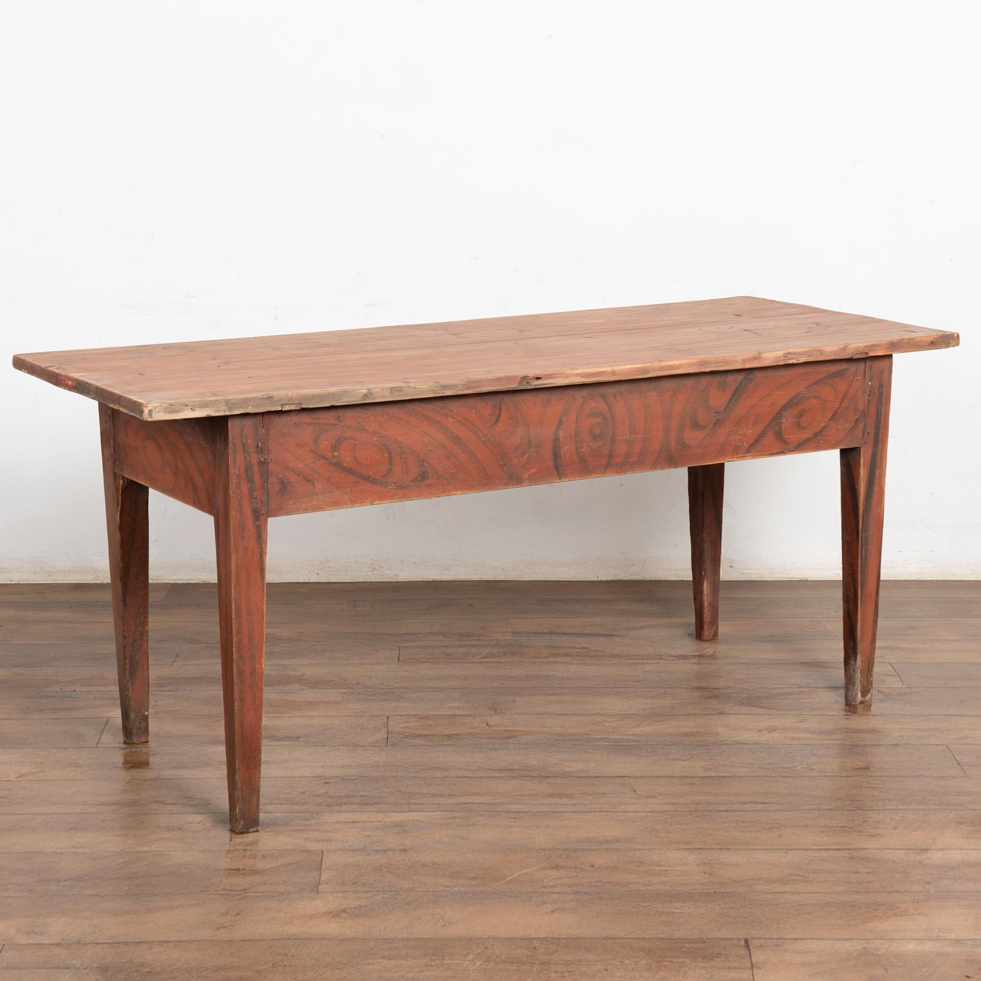19th-century Swedish pine farm table retaining its original red painted surface and traditional country form. The table features tapered legs and a single drawer fitted with a drop pull. The brick red painted base displays a faux wood/marbling technique that was a traditional folk art motif of the era.