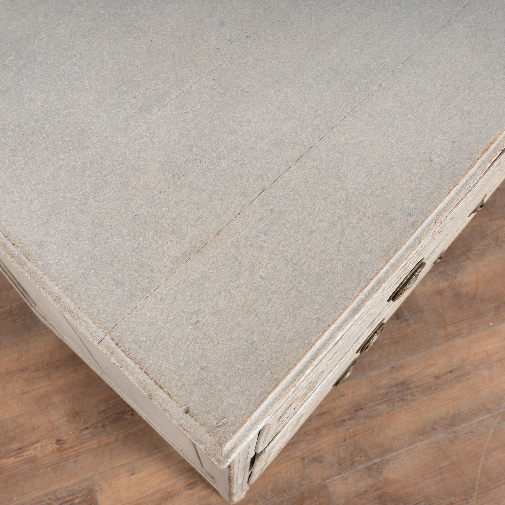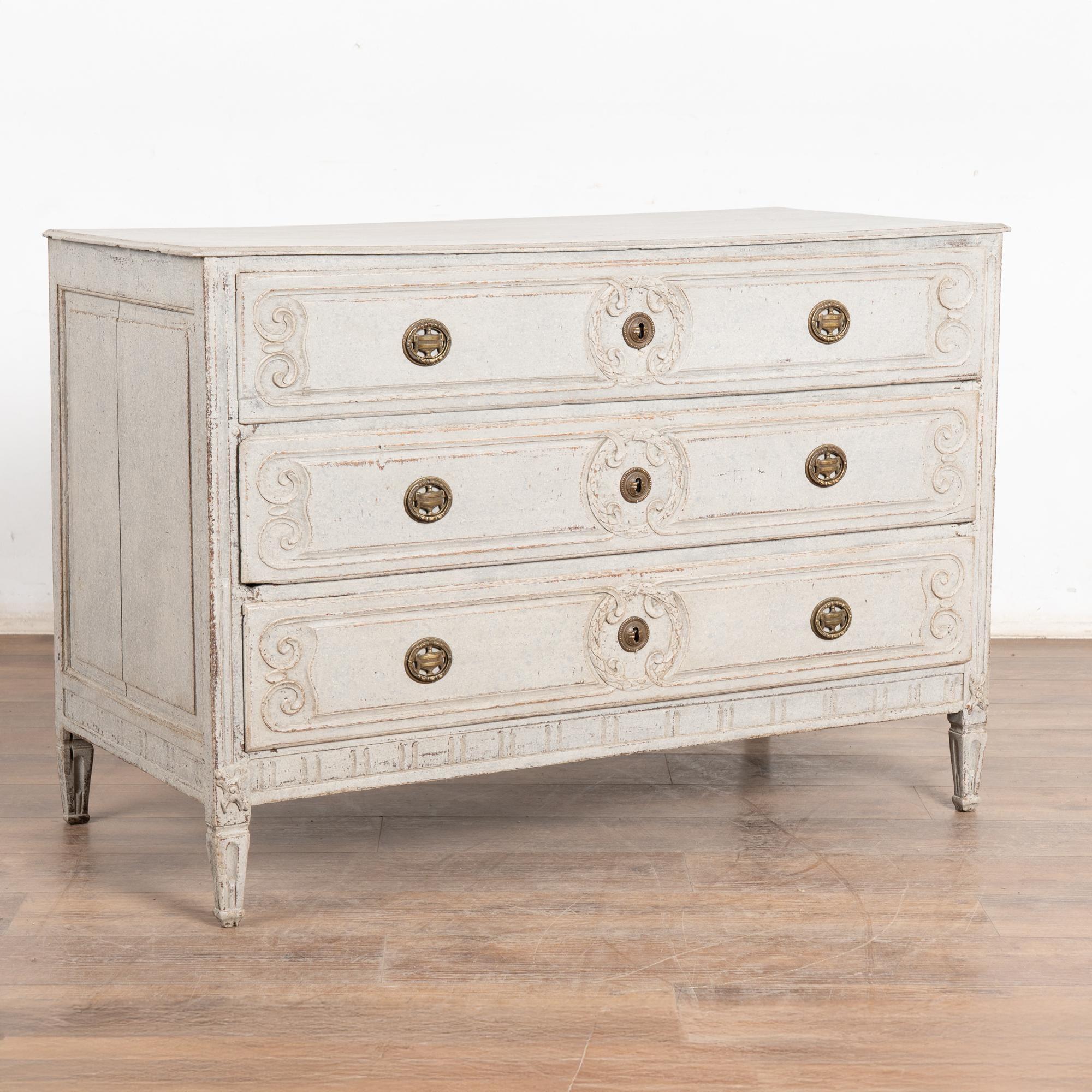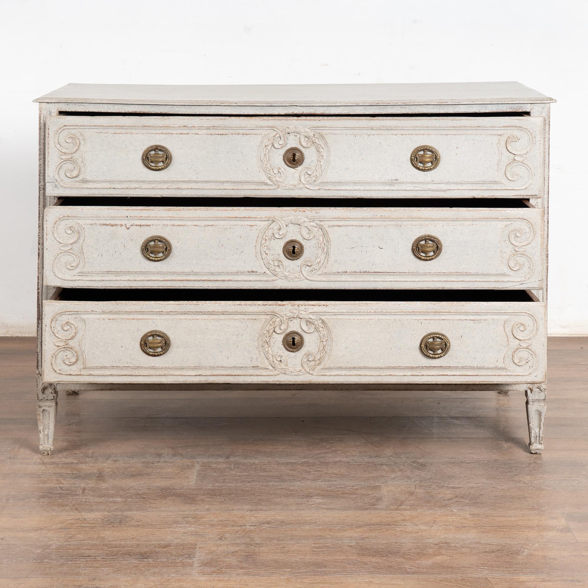 Early 19th-century French oak chest of three drawers with newer professionally layered painted finish in tones of gray, blue, and antique white blended for a soft, mottled effect.