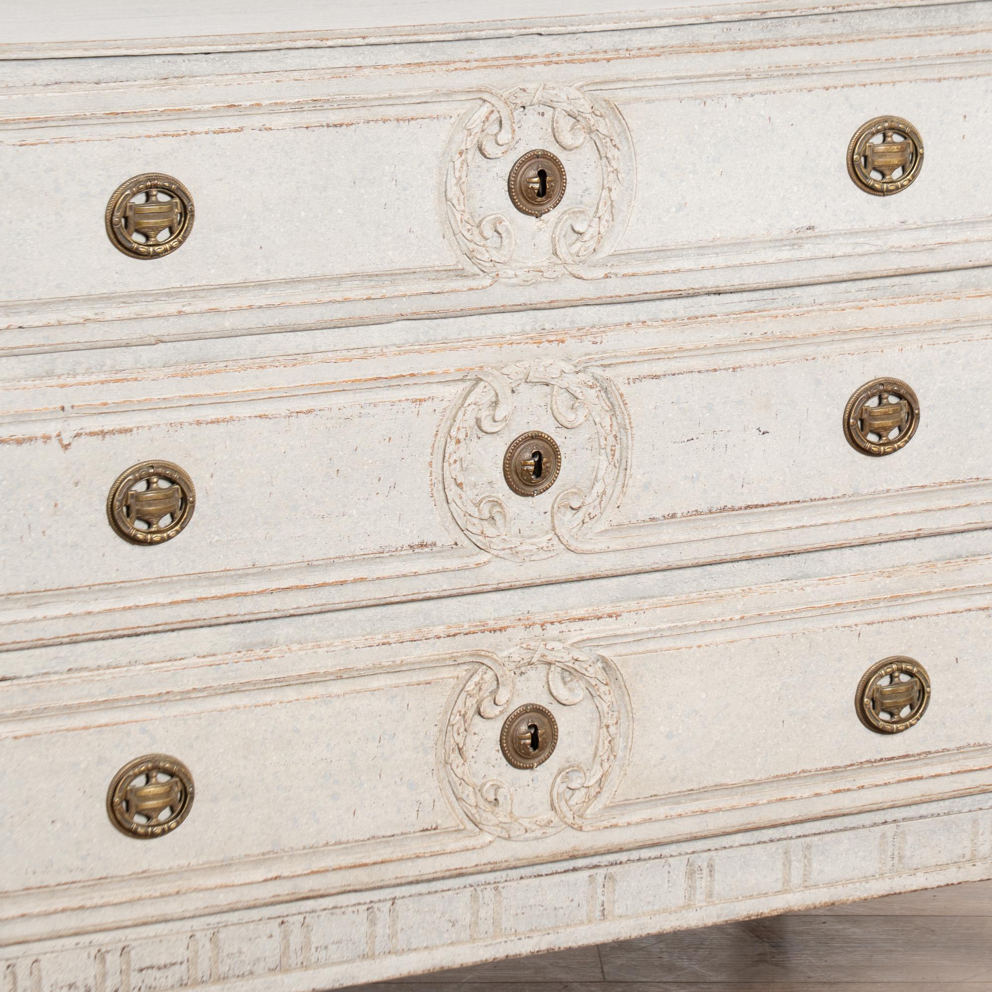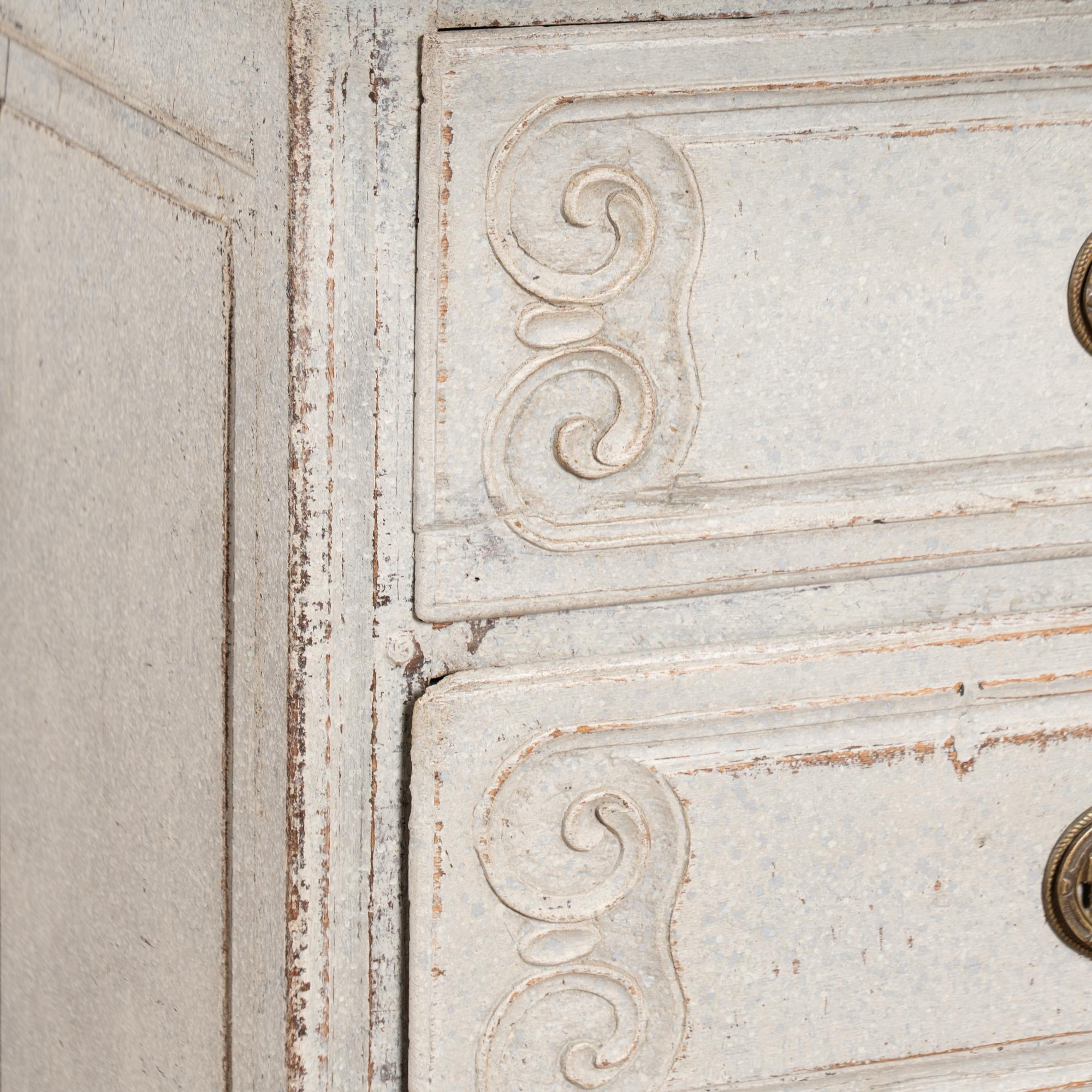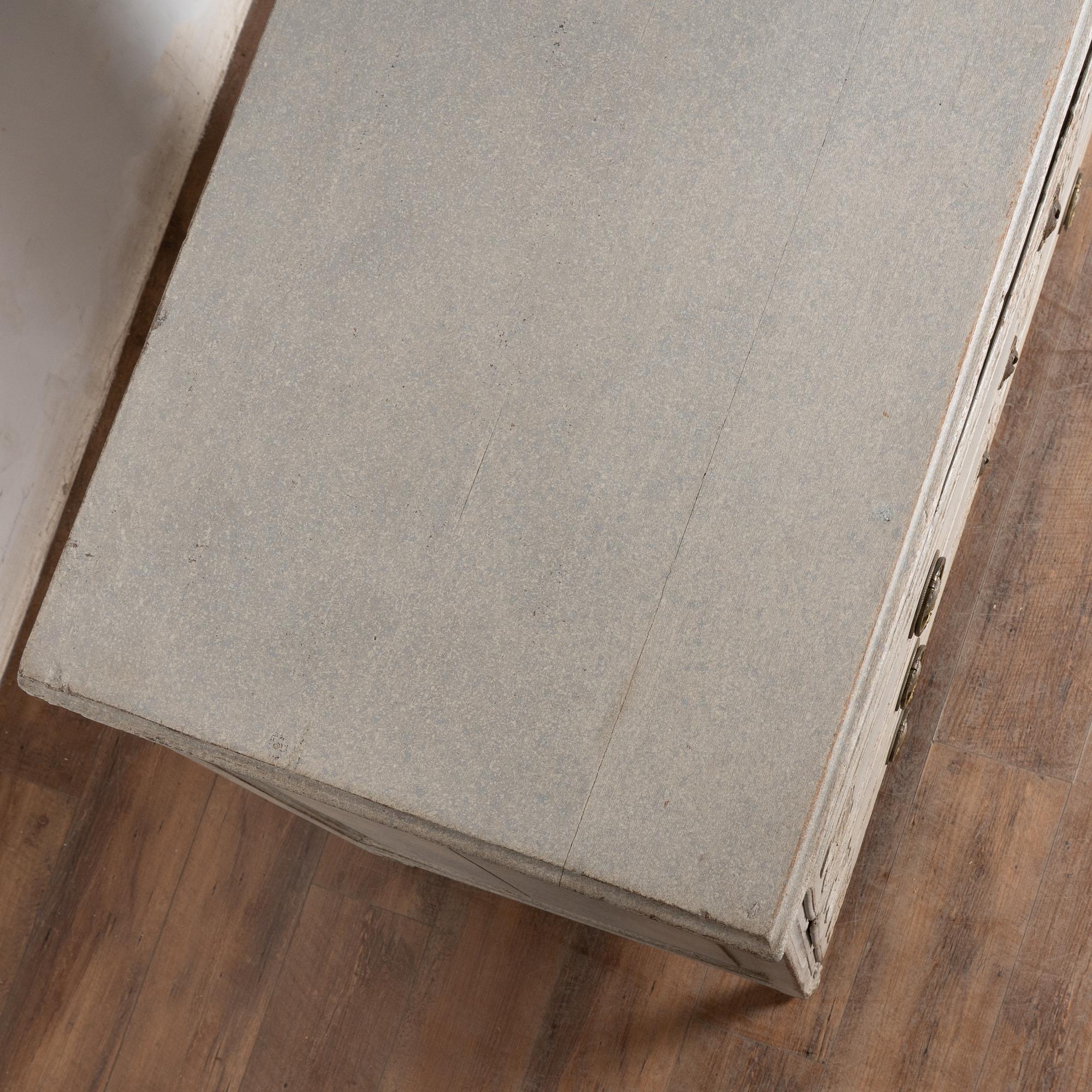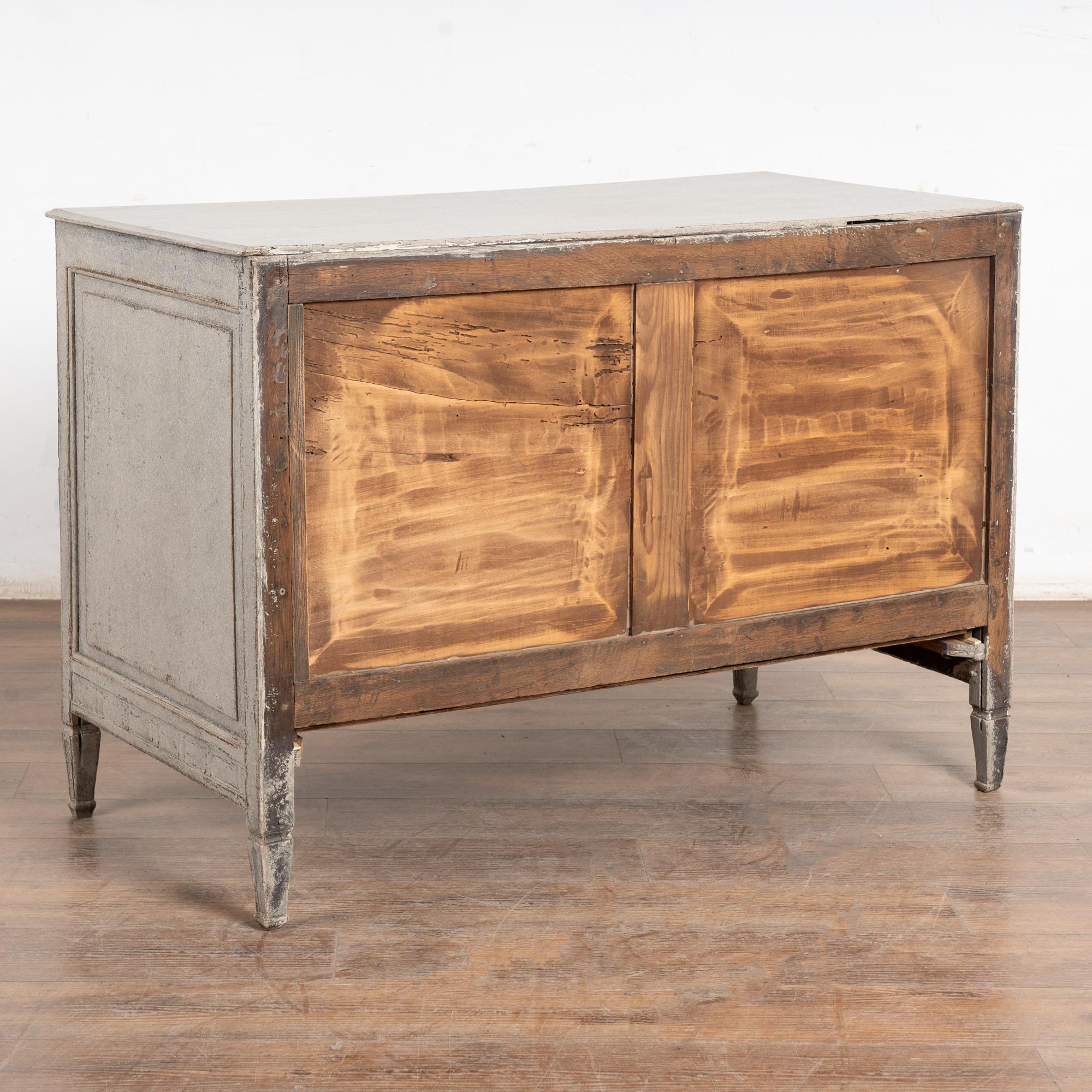 Early 19th-century French oak chest of three drawers with newer professionally layered painted finish in tones of gray, blue, and antique white blended for a soft, mottled effect.