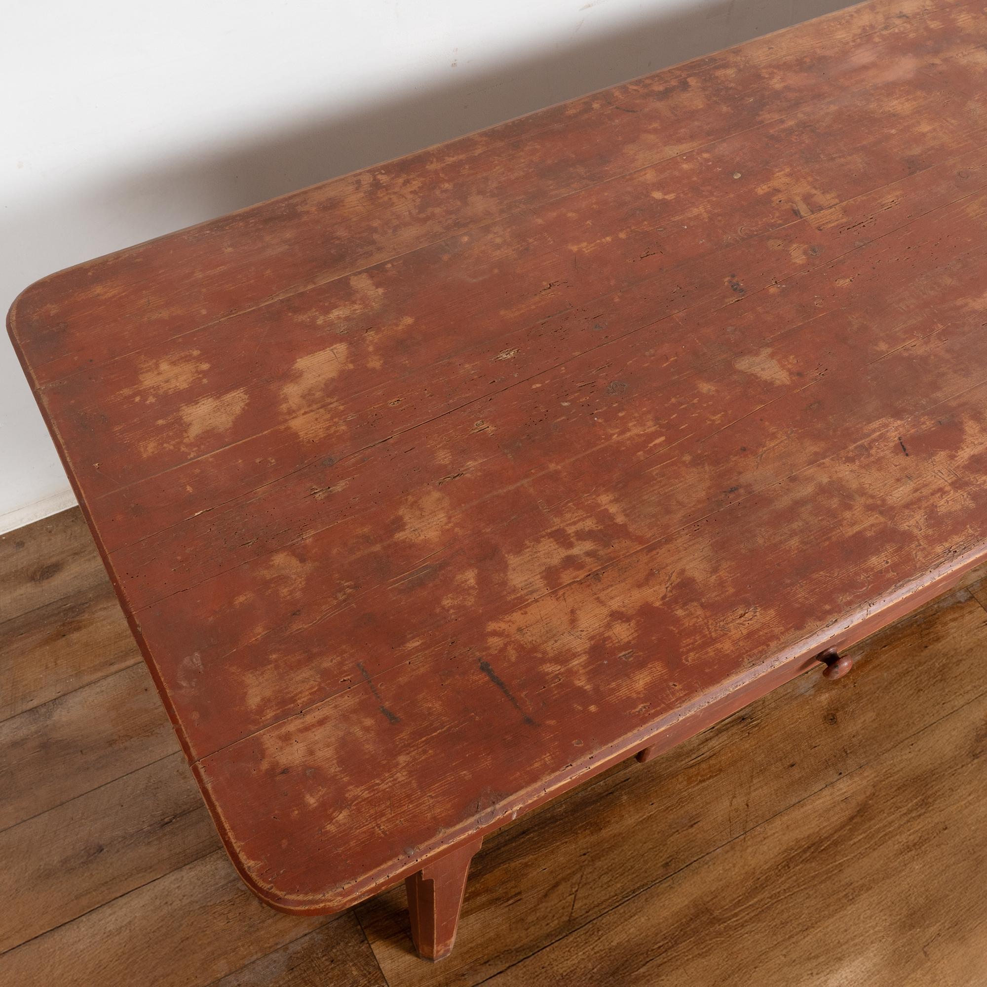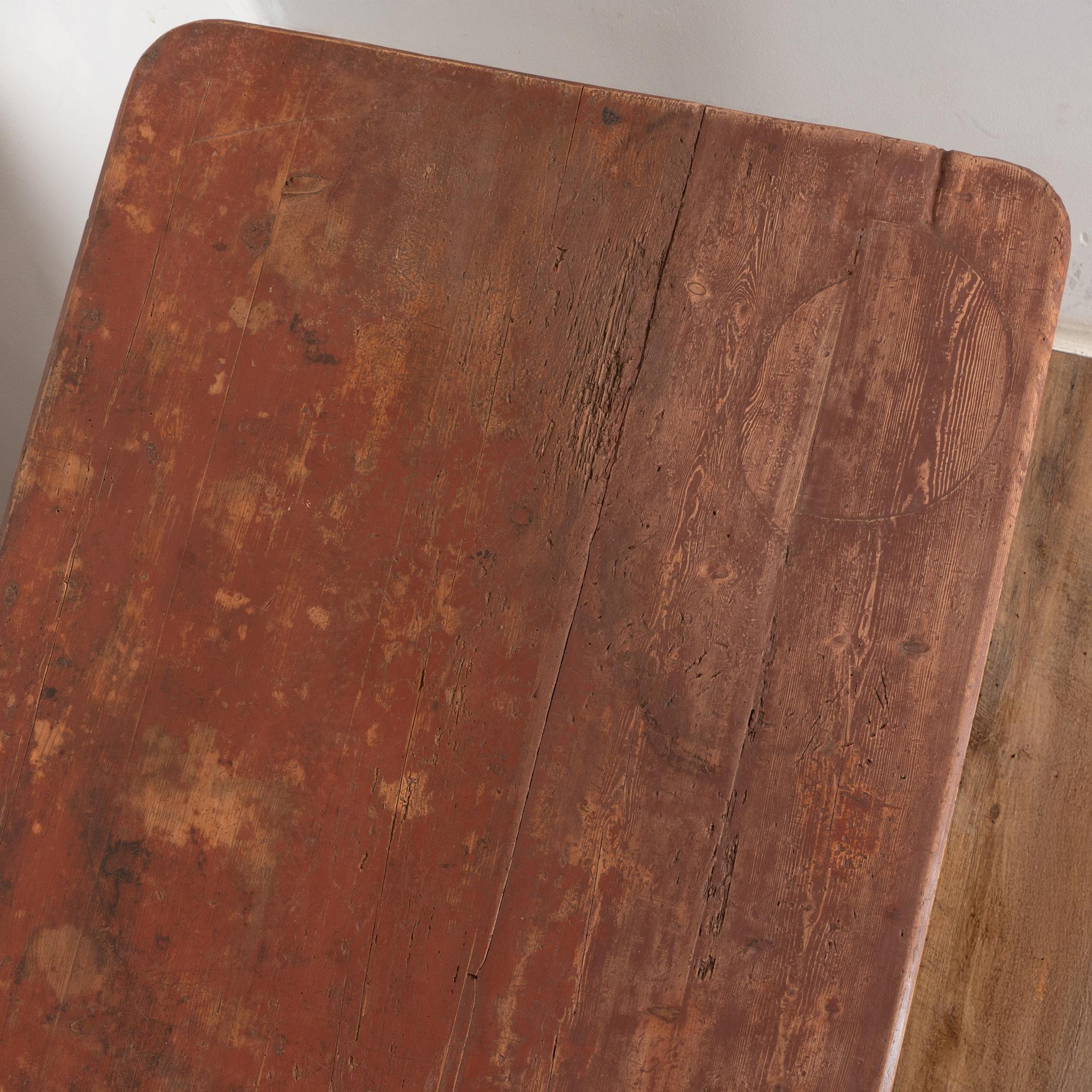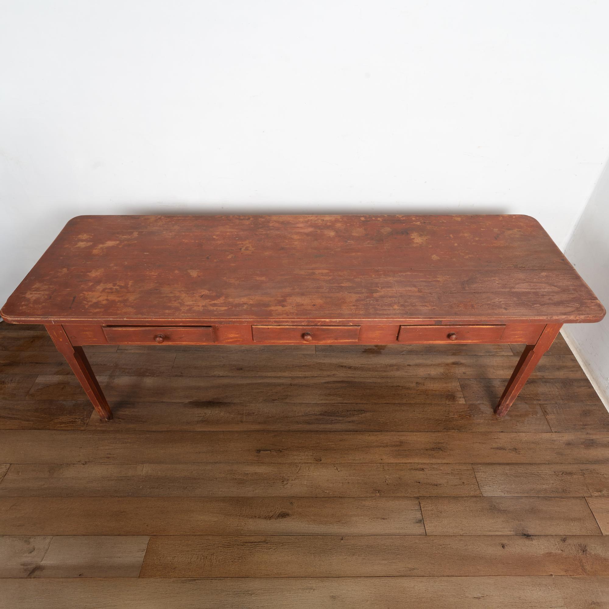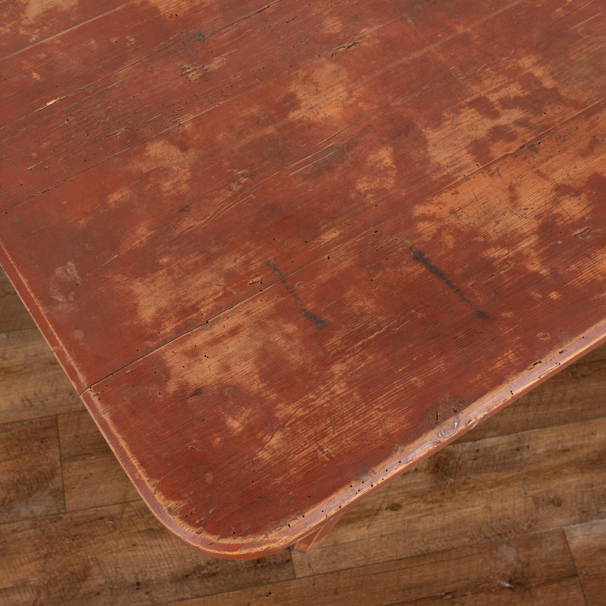 19th-century Swedish pine table with old brick red painted finish (later but aged). Features three functional drawers with wooden knobs and visible old wood nails.