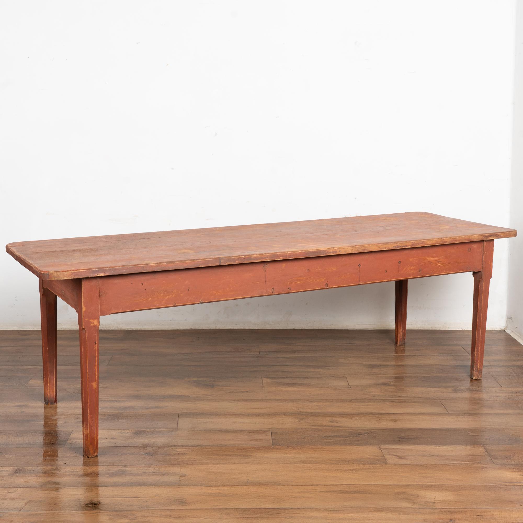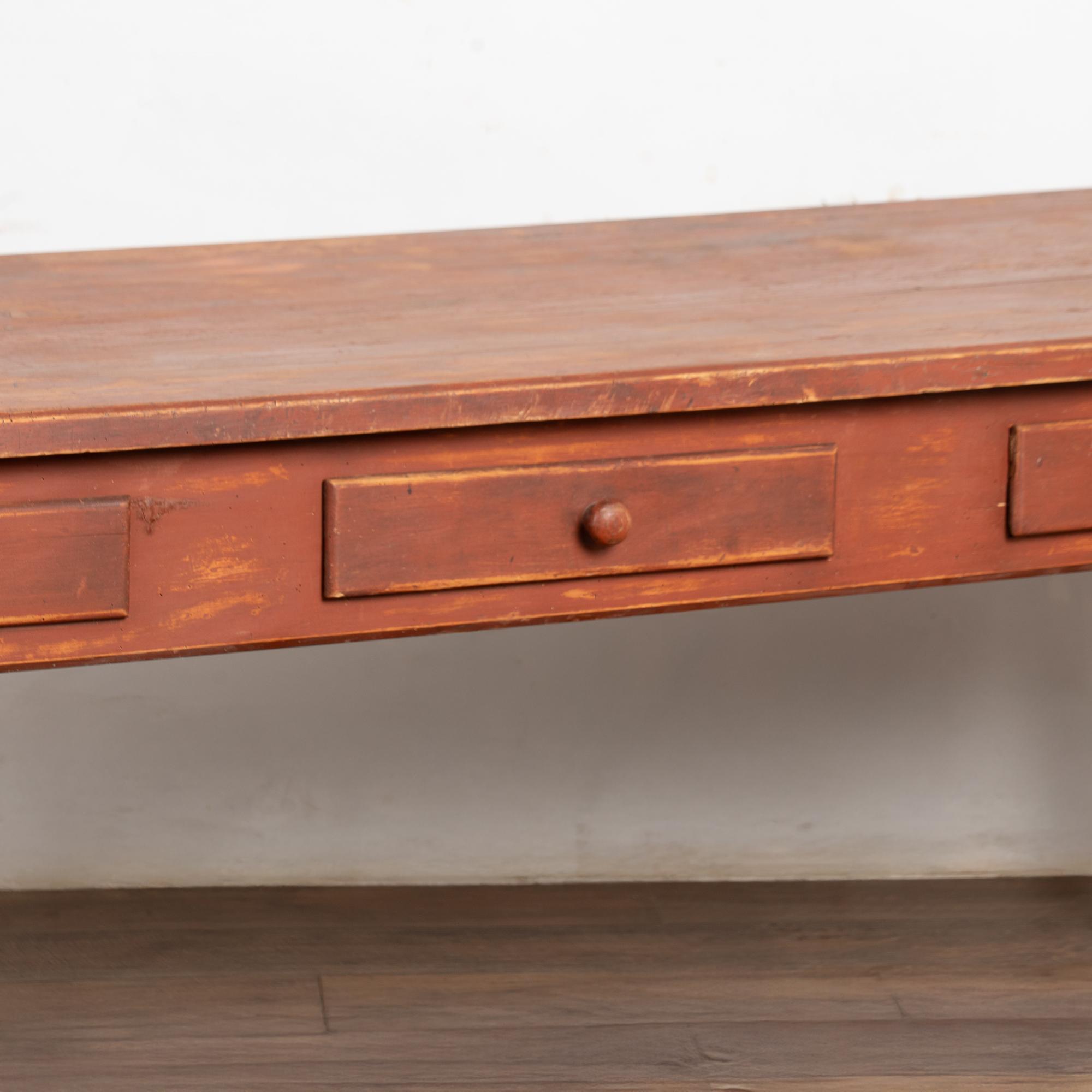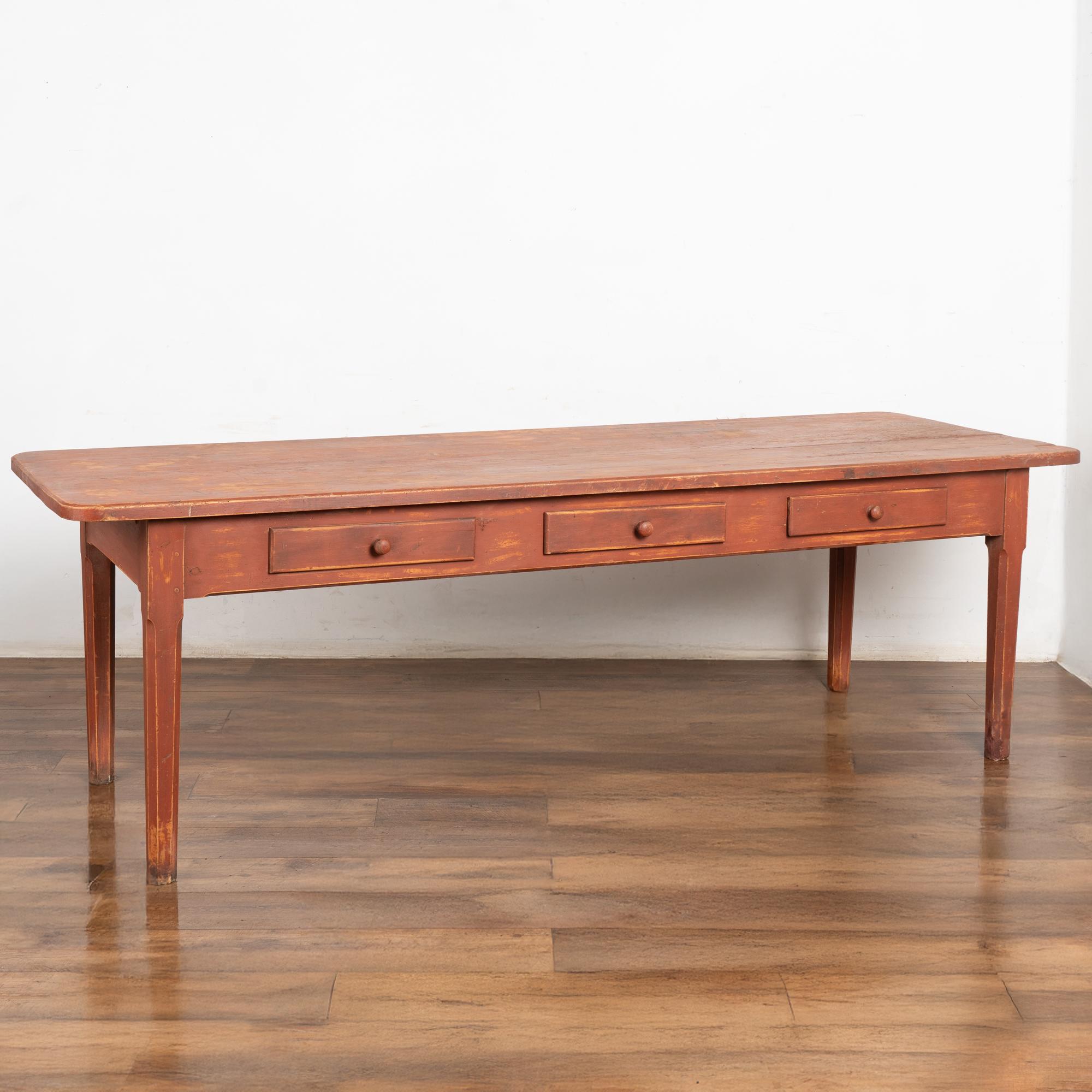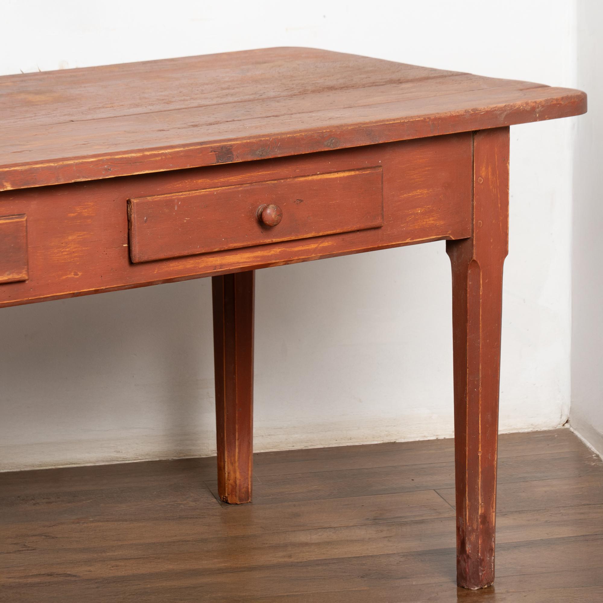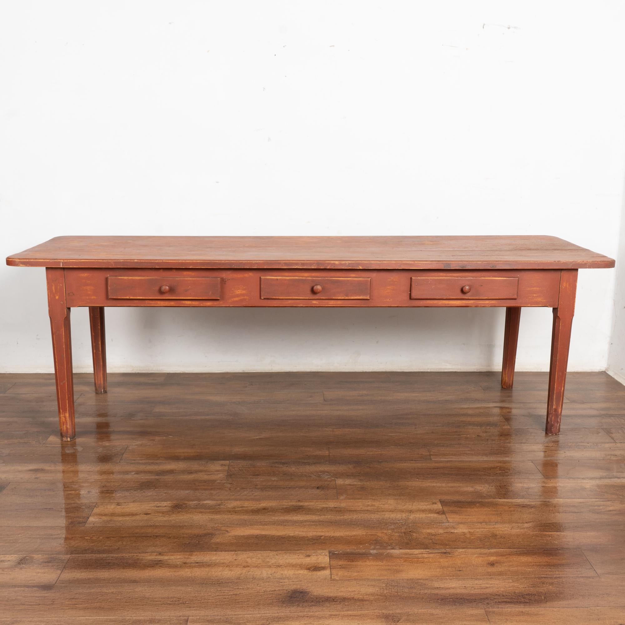 19th-century Swedish pine table with old brick red painted finish (later but aged). Features three functional drawers with wooden knobs and visible old wood nails.
