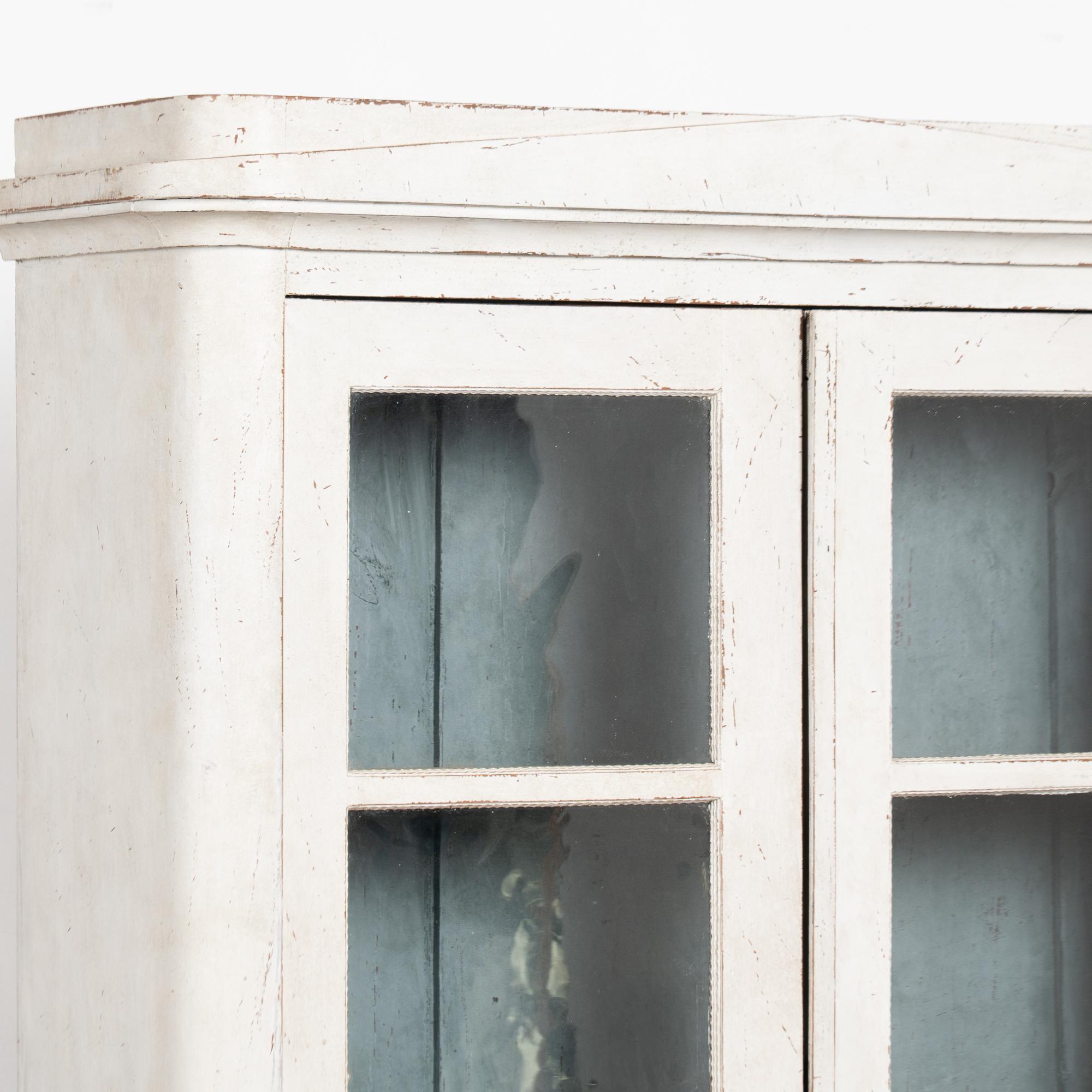 Small Swedish Gustavian pine bookcase featuring a professionally applied layered antique white painted finish with pale gray undertones. Light distressing reveals natural pine wood beneath and fits the age and grace of this cabinet.