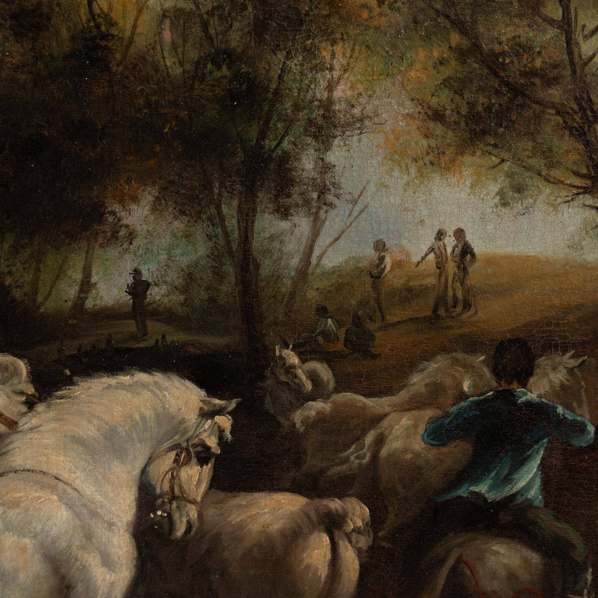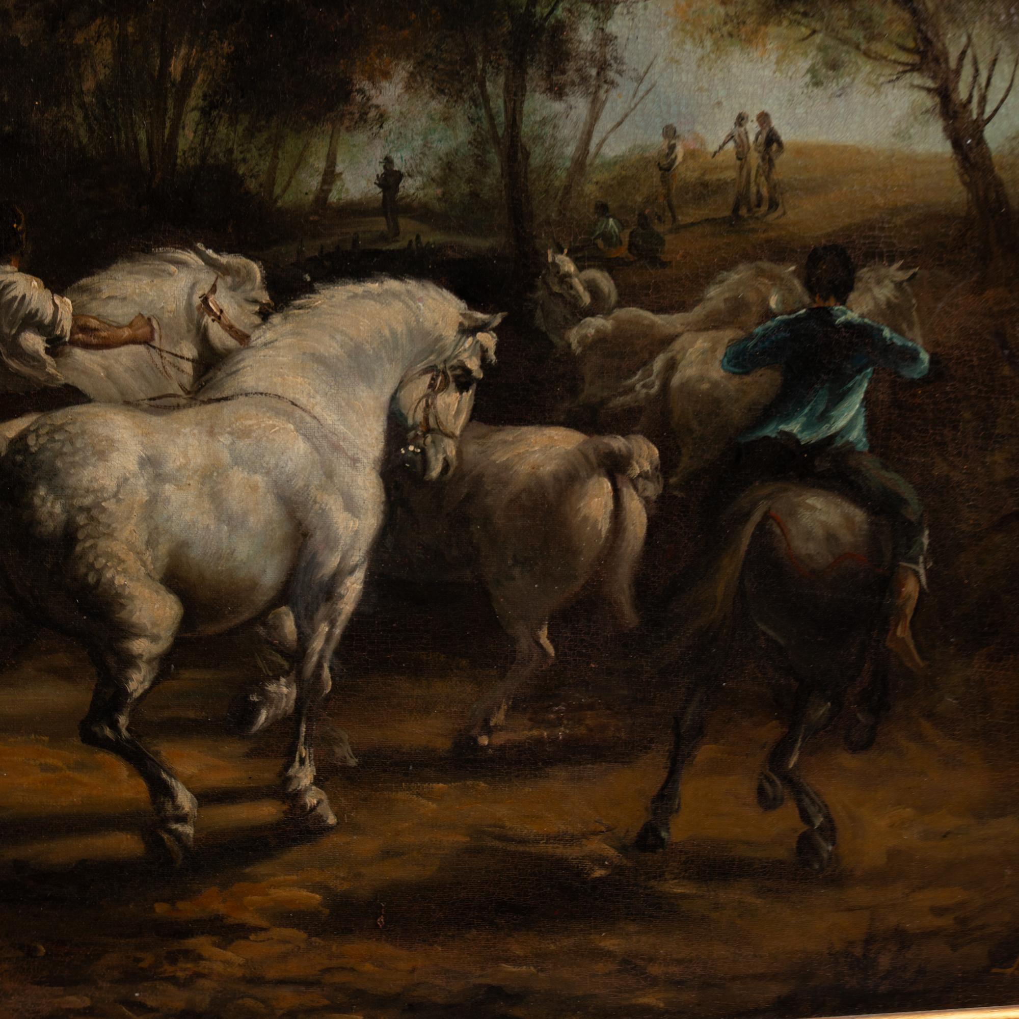 Early 20th-century original oil on canvas painting depicting a dynamic scene of horses and riders. Over seven horses dominate the foreground, accompanied by riders and handlers, with trees and additional figures visible in the background.
