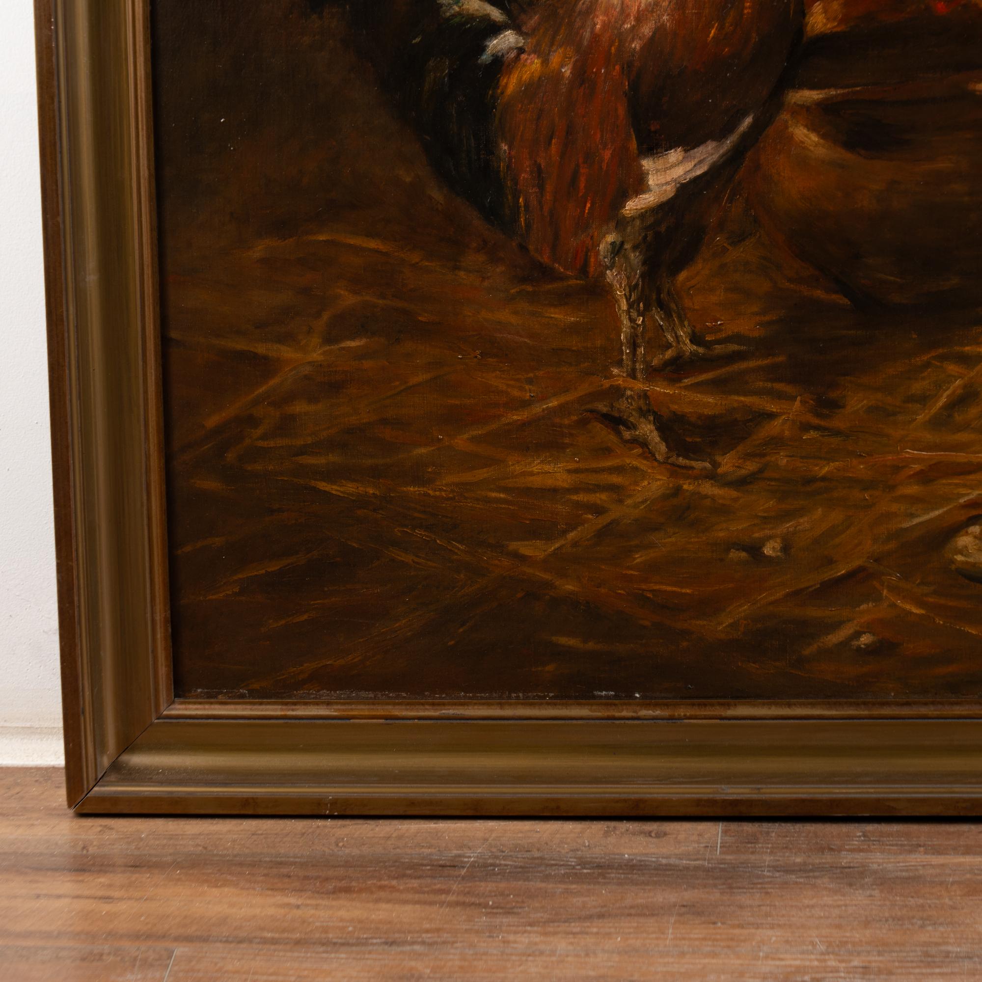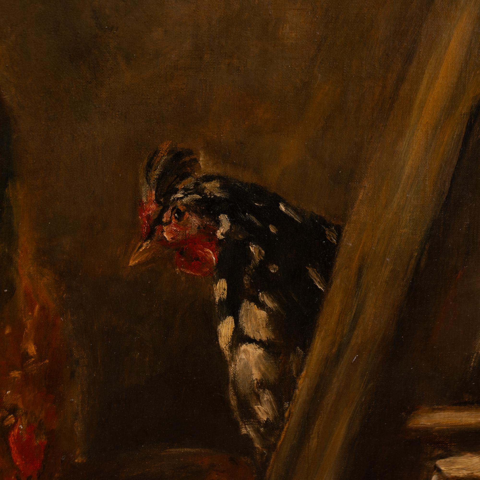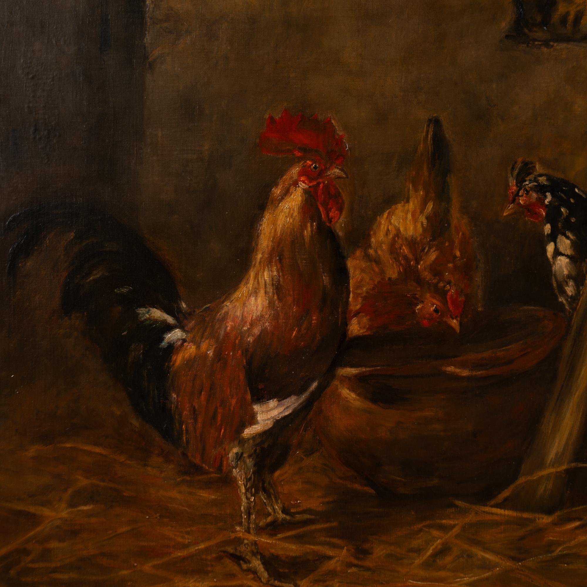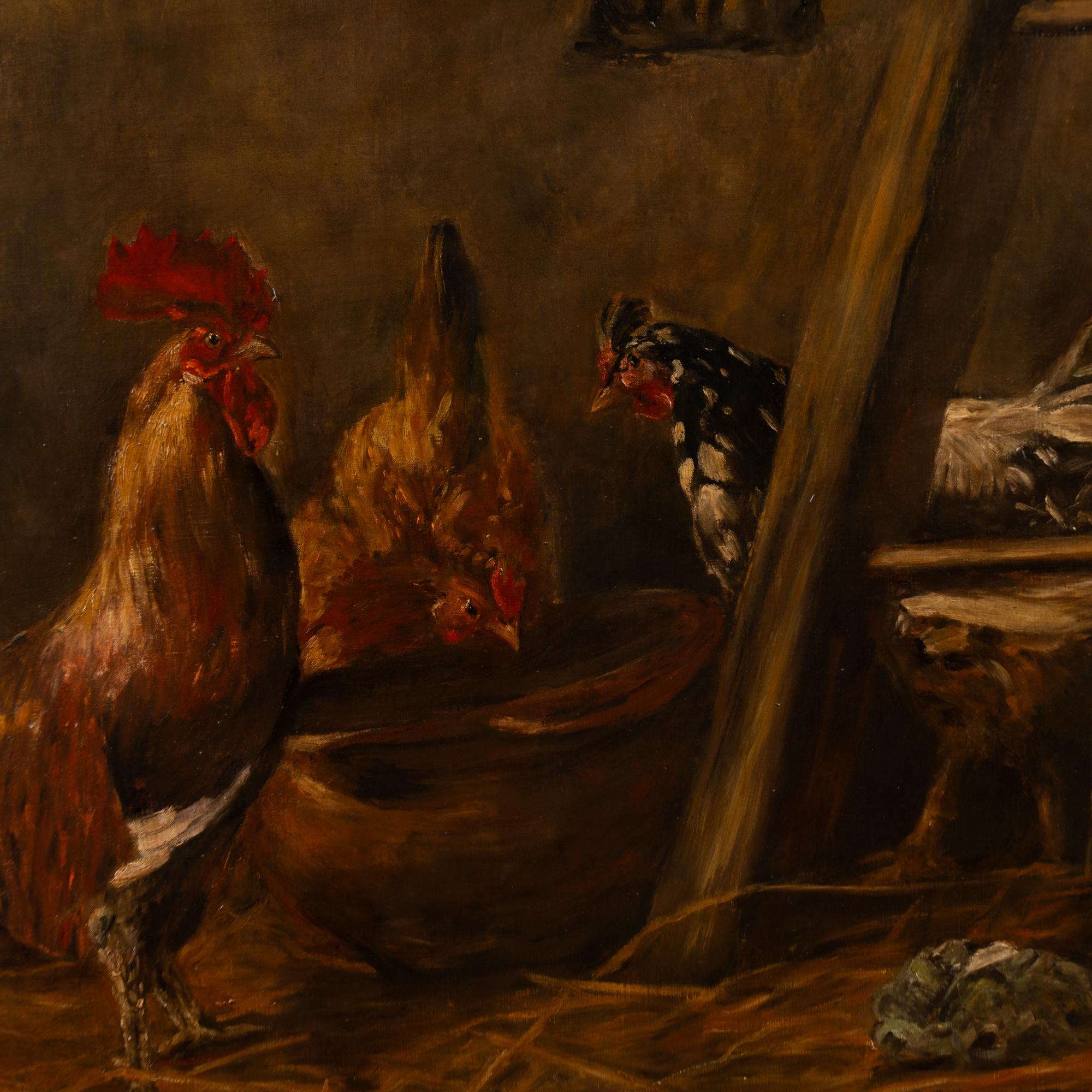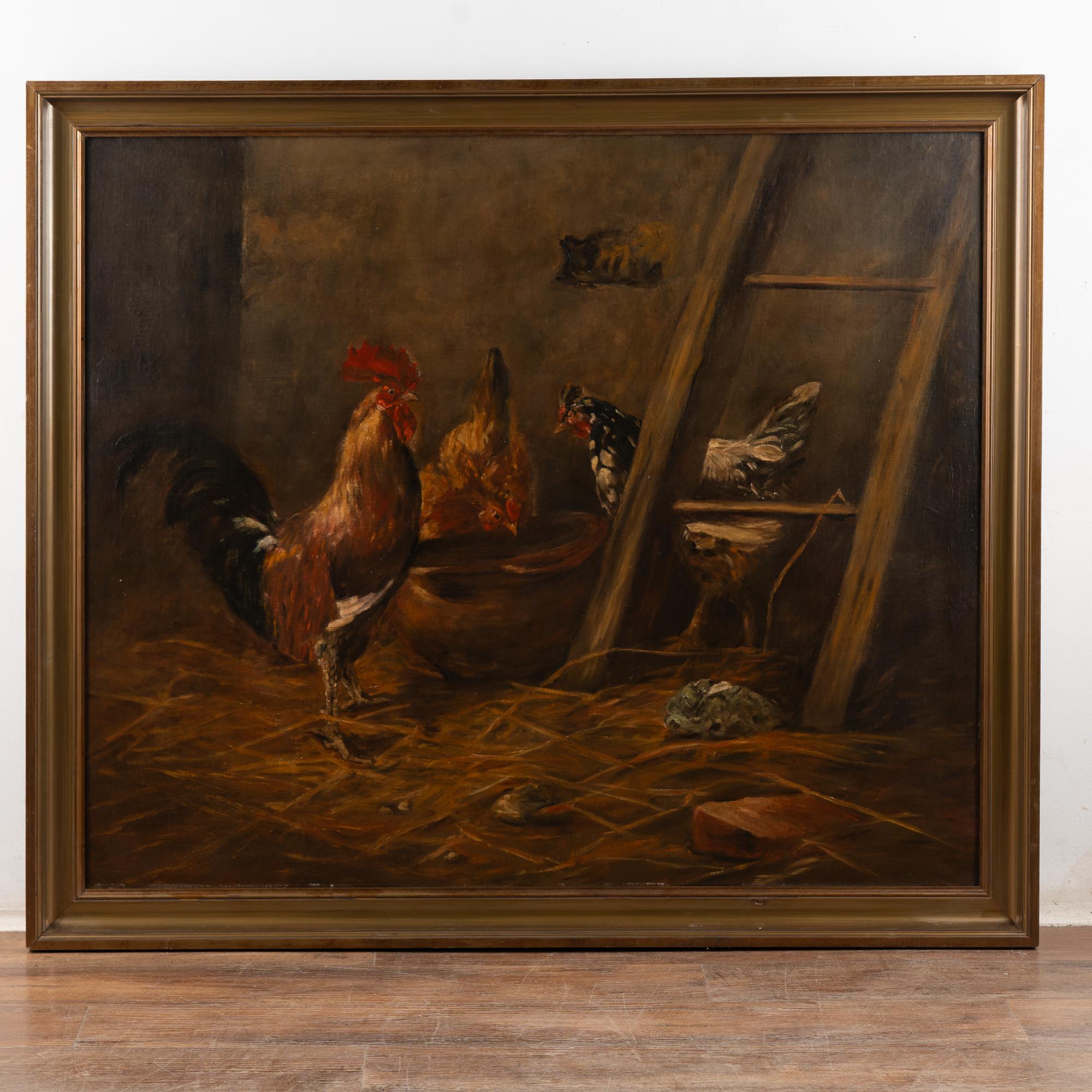 19th-century Spanish oil on canvas depicting a barnyard scene with a rooster and two chickens. Hay is painted beneath their feet, with a ladder positioned to the right side, adding depth and setting to the composition. The painting is large and visually impressive.