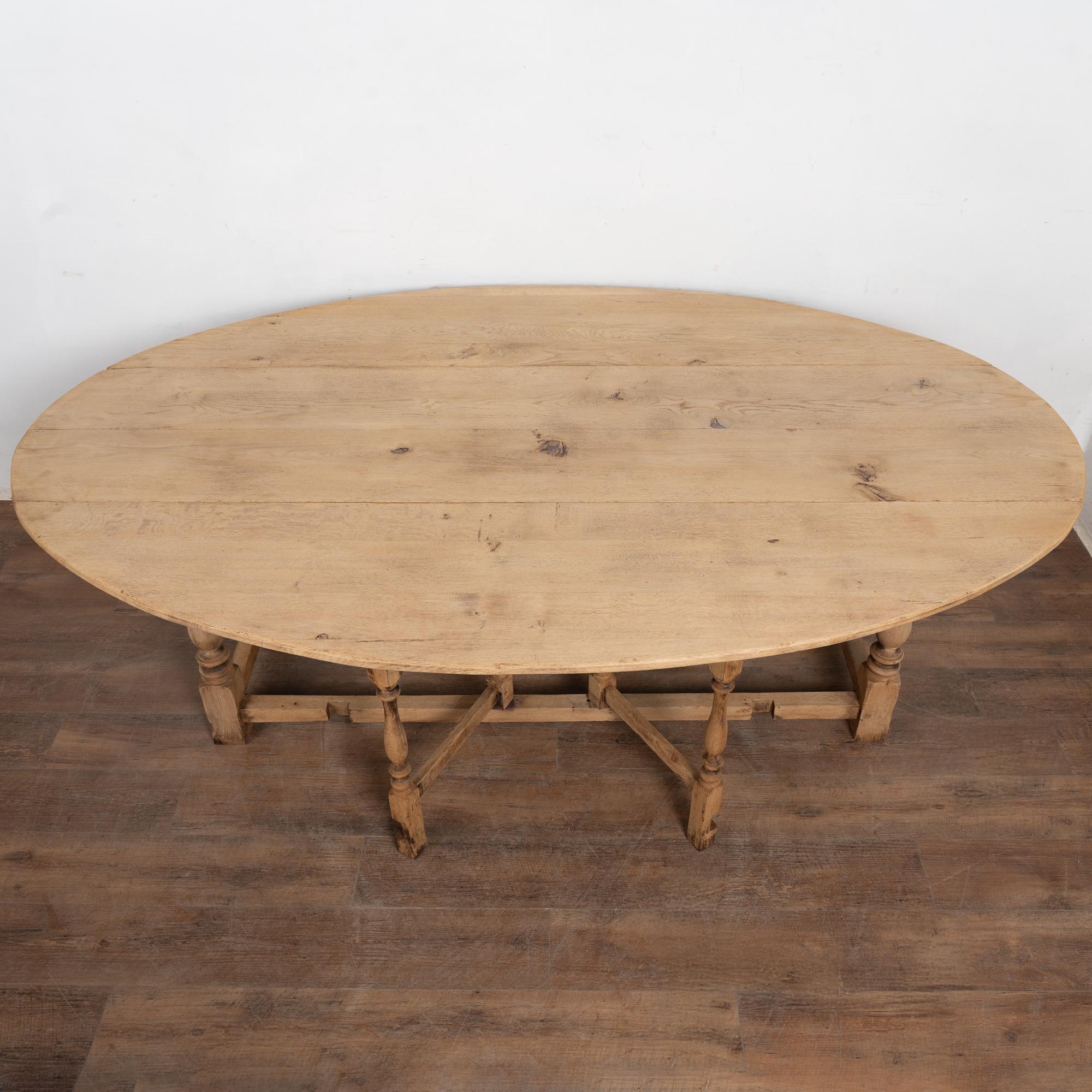 20th-century English wake table crafted in bleached oak with classic dropleaf construction. Gateleg supports allow flexible chair placement when used as a dining table.