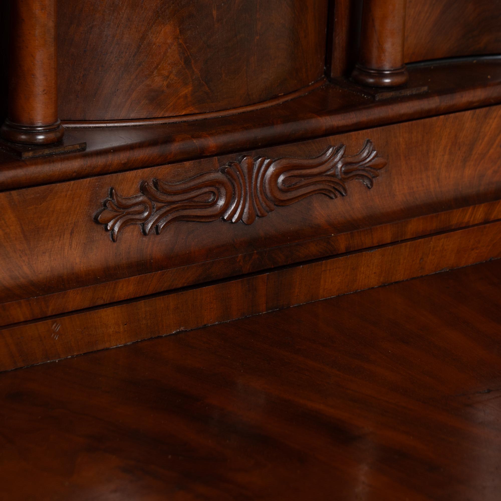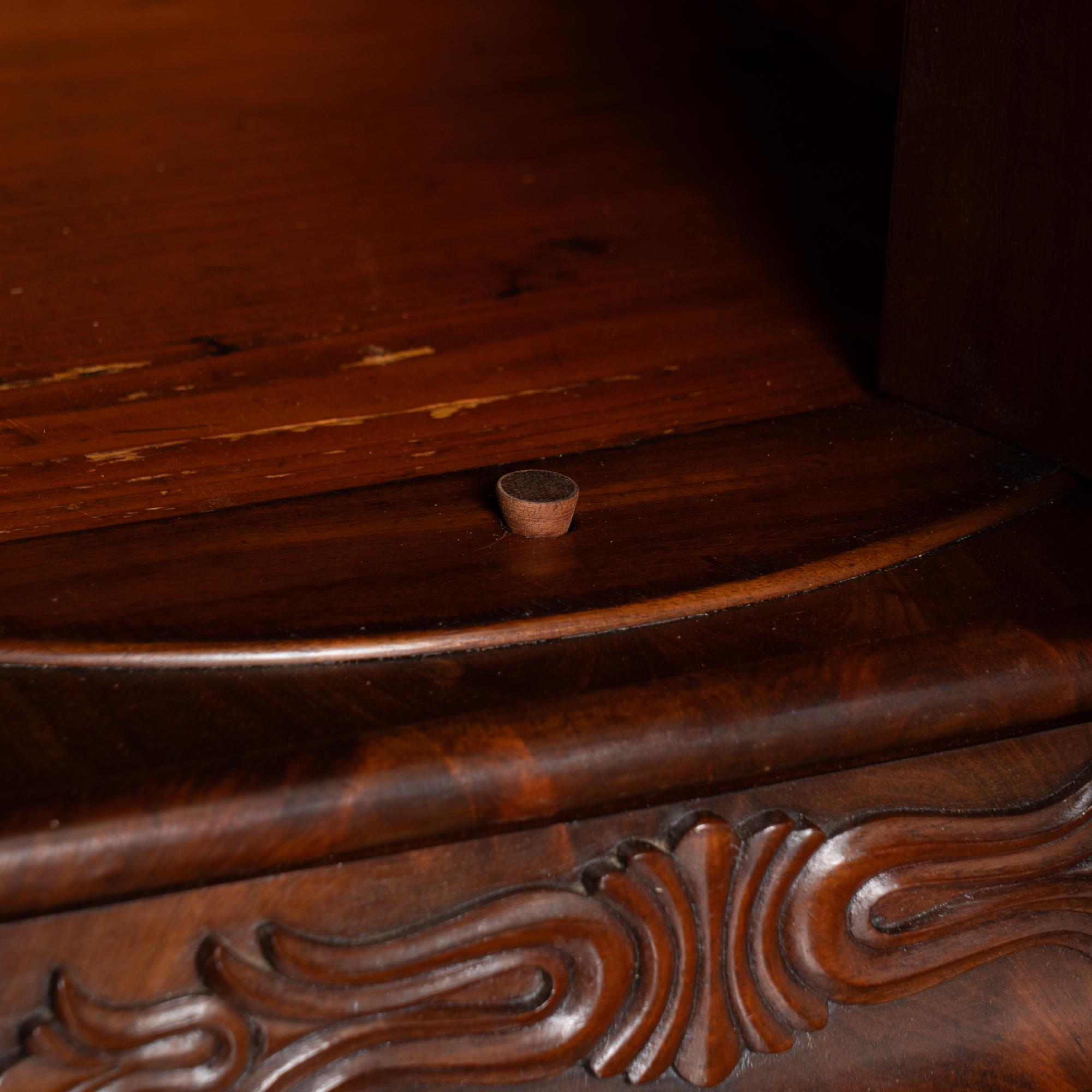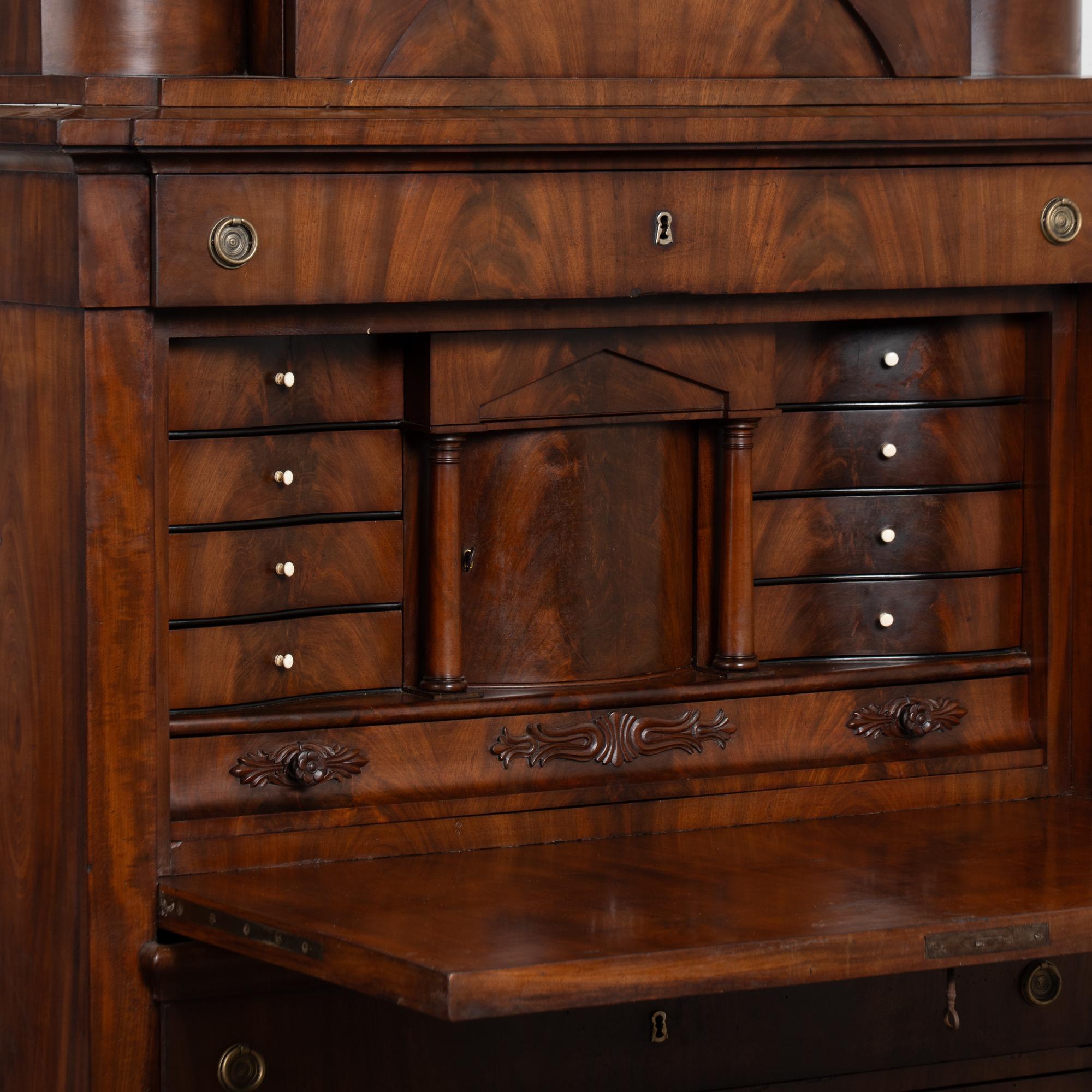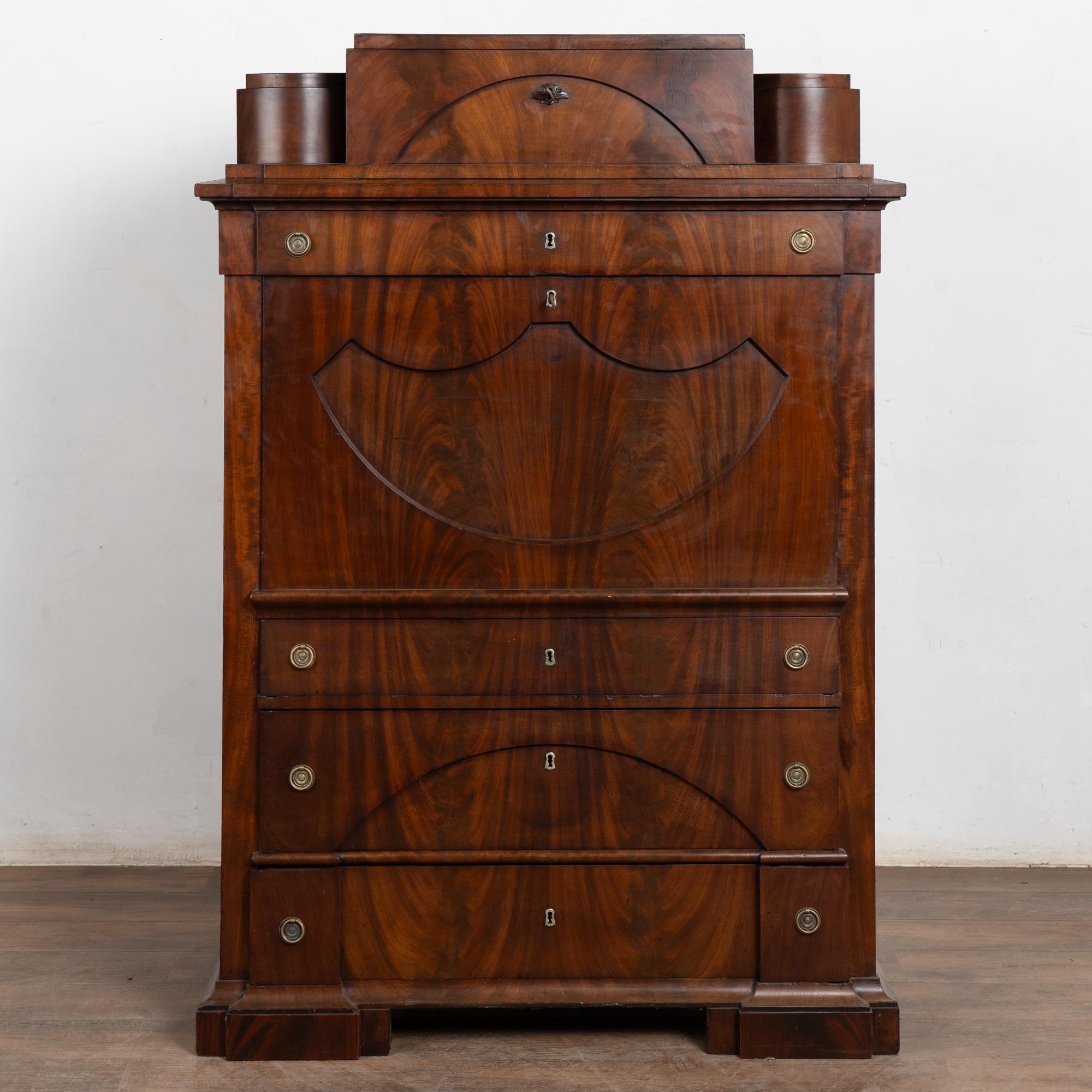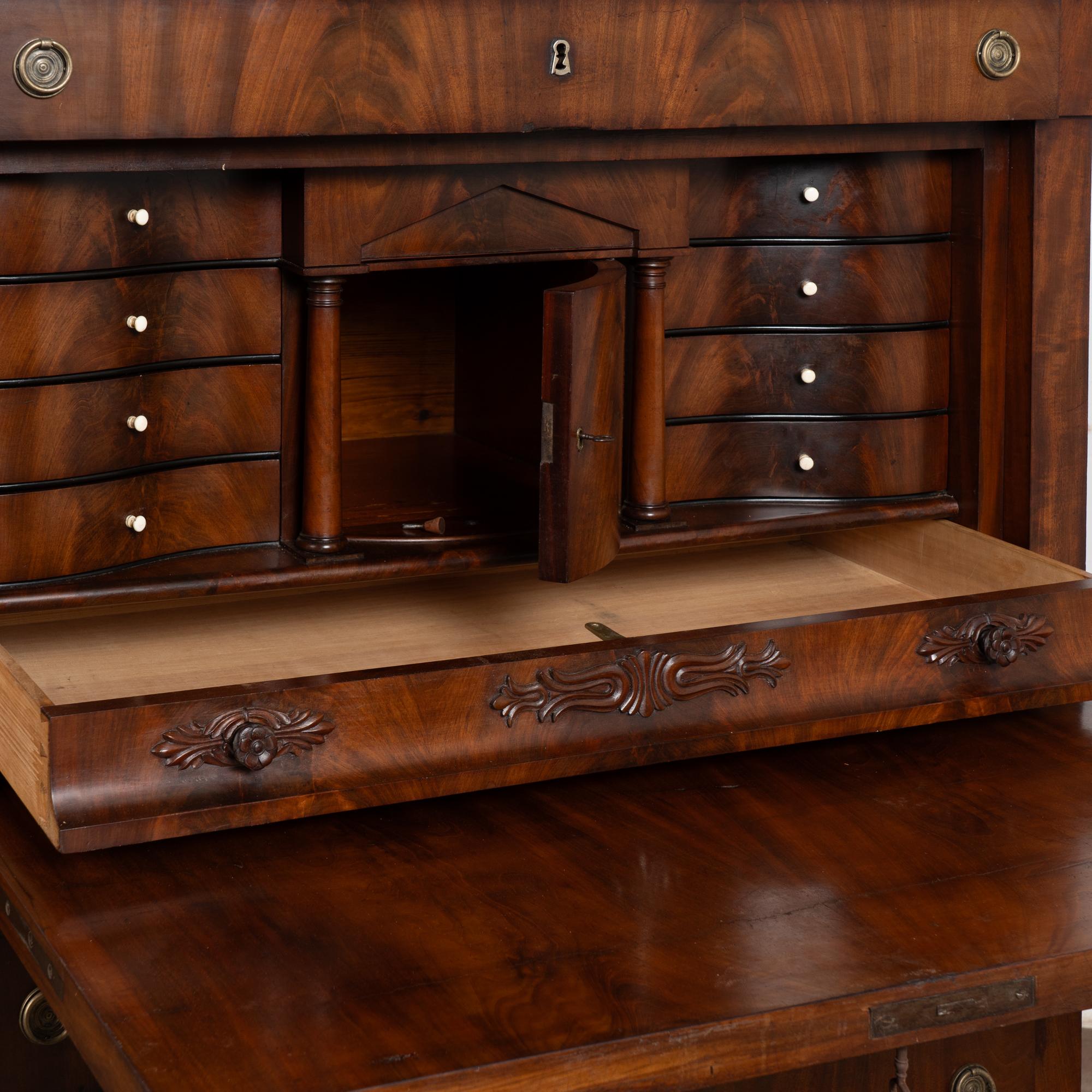 19th century Danish Biedermeier-style secretary or "bureau" crafted in mahogany veneer. This short, stately bureau features a hinged desktop that opens to reveal multiple interior drawers and storage compartments, including an applied carved decorative detail along the long, narrow interior drawer. The desktop shows repaired old cracks in the veneer, with additional scratches and small gouges consistent with age. The exterior displays handsome mahogany veneer with expressive grain patterns. Four lower drawers each open with two brass pulls; original locks no longer function and keys remain to be used as pulls only.