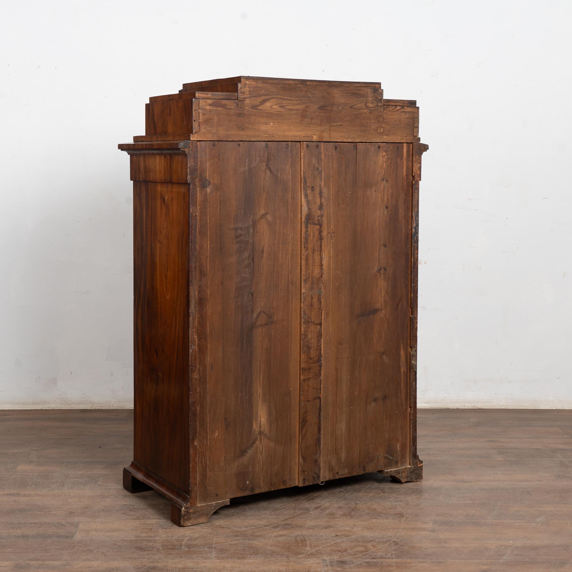 The sides show old cracks, separation, and prior repairs, with minor veneer loss at the upper far right corner that is not visually distracting. Professionally restored, this handsome secretary is strong, stable, and ready for use.
