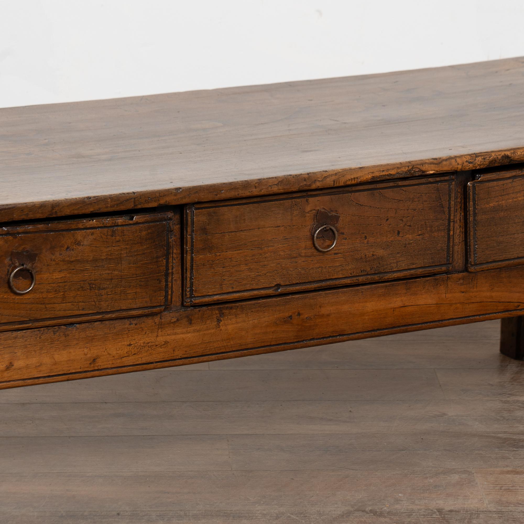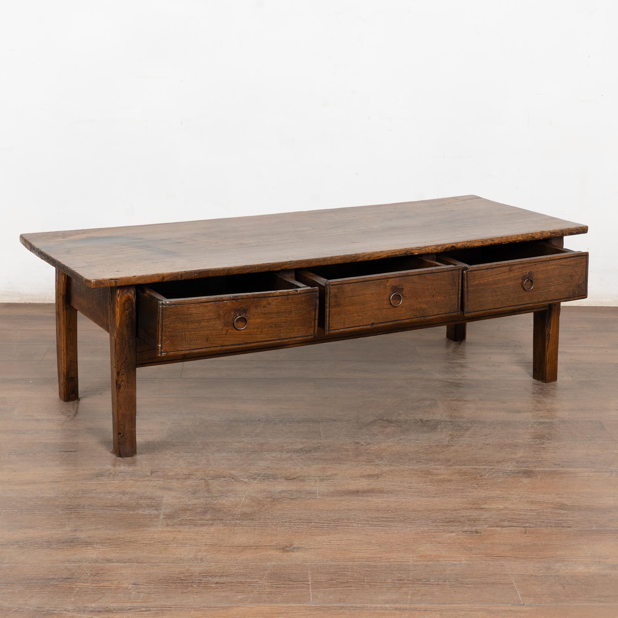19th-century French oak coffee table with three functional drawers fitted with metal pulls. Square legs and pegged joinery reinforce its traditional construction. The top and legs reflect long use through visible character marks and historic repairs to old cracks, typical of antique French oak furniture. Drawers slide smoothly and provide excellent storage.
