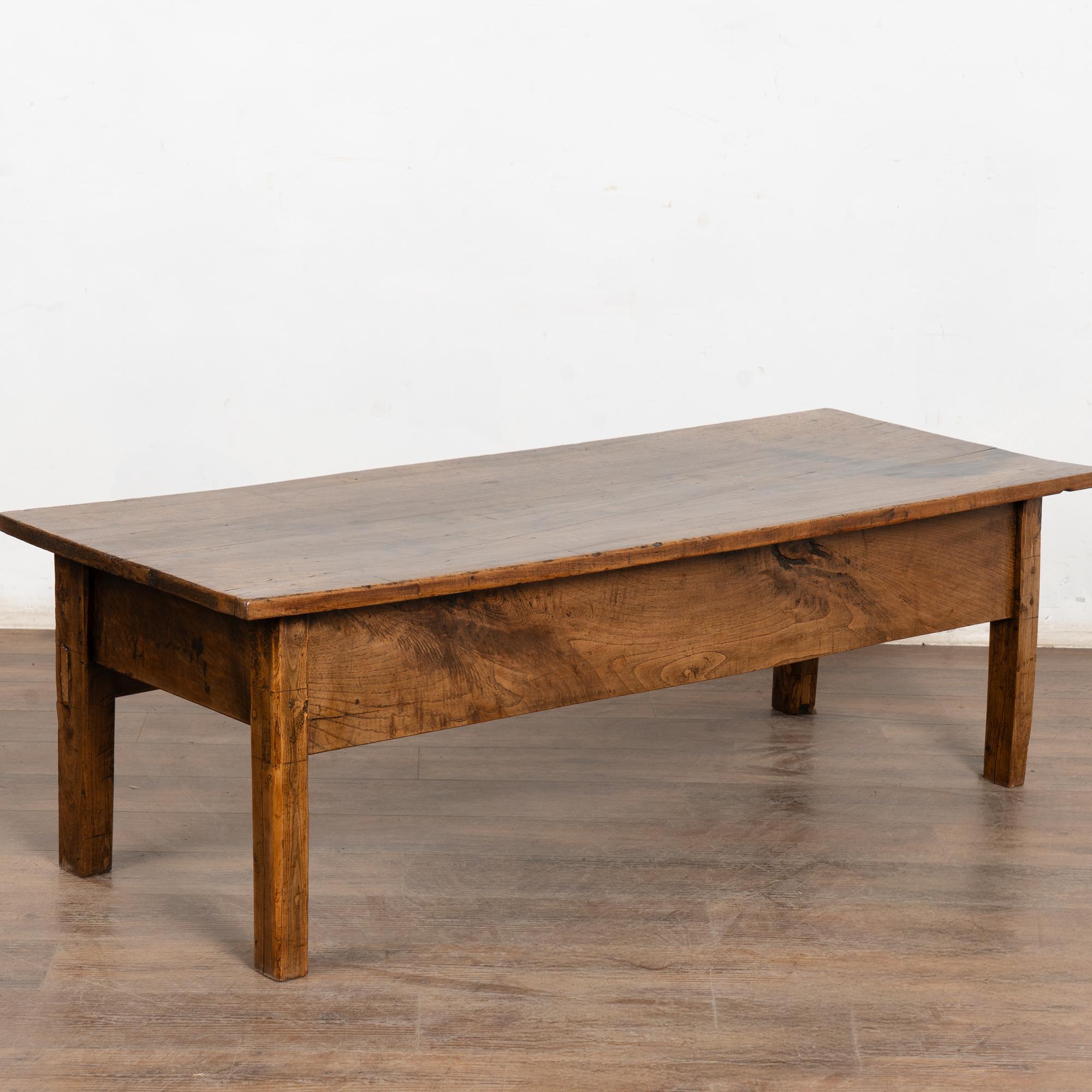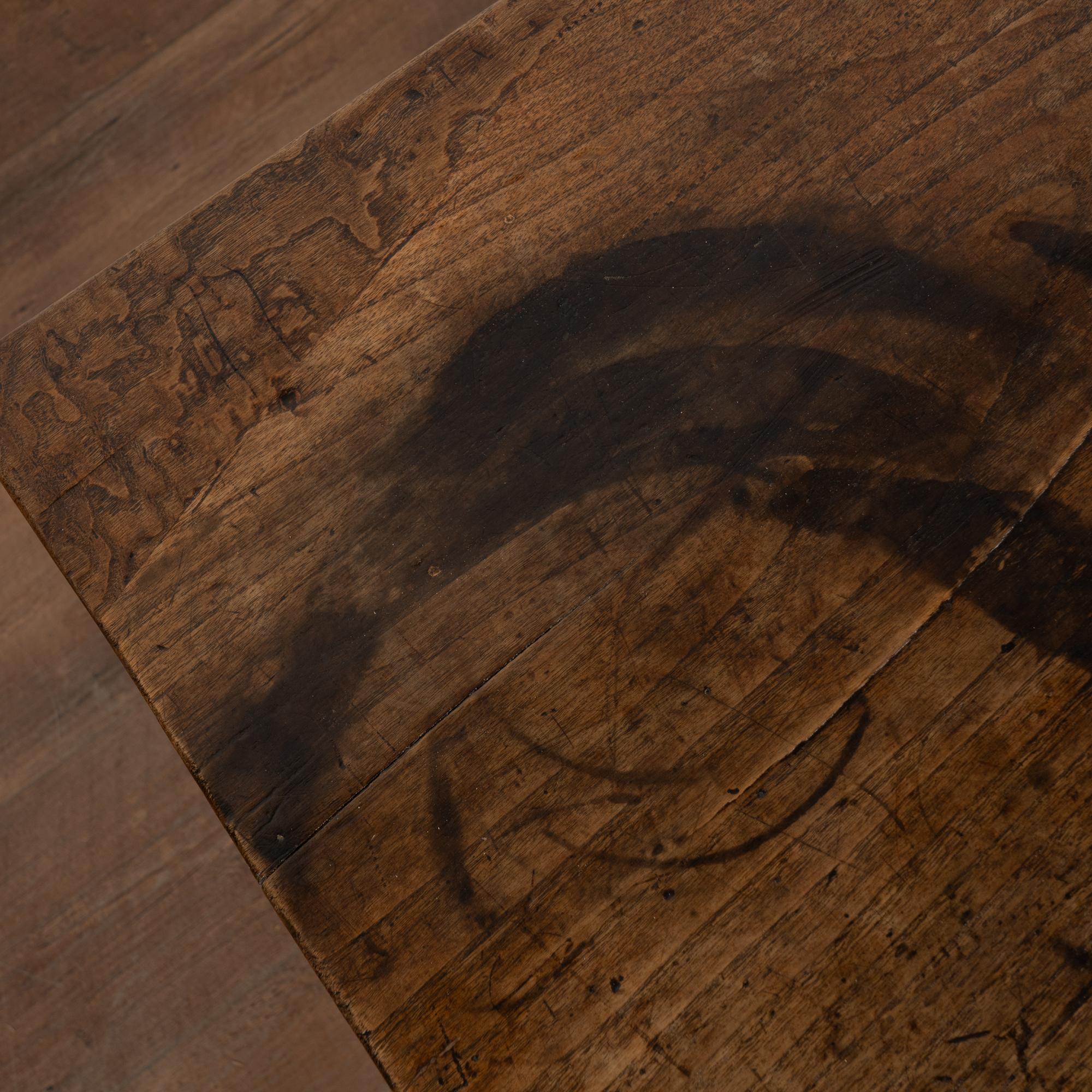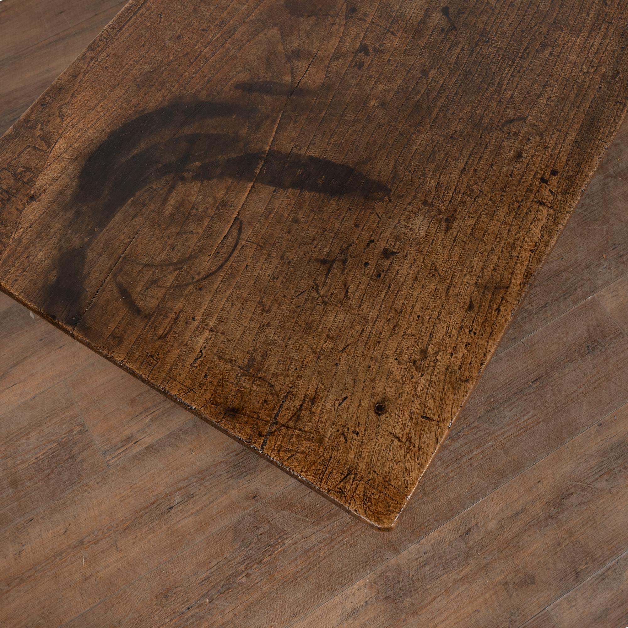 Note in photos of top the age related cracks, stains and scratches that reveal 200 years of use. Old nicks/gouges seen along legs as well, none of which impact function nor appeal of this handsome French country coffee table.
