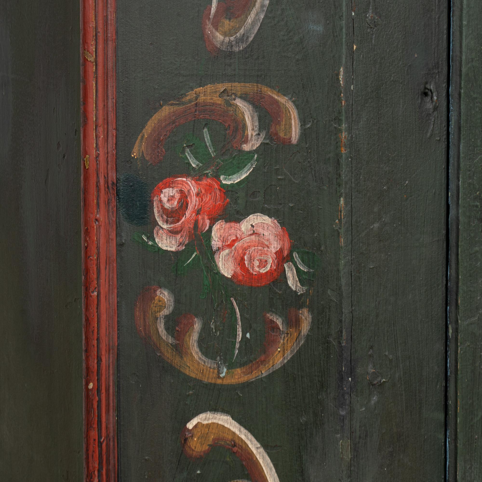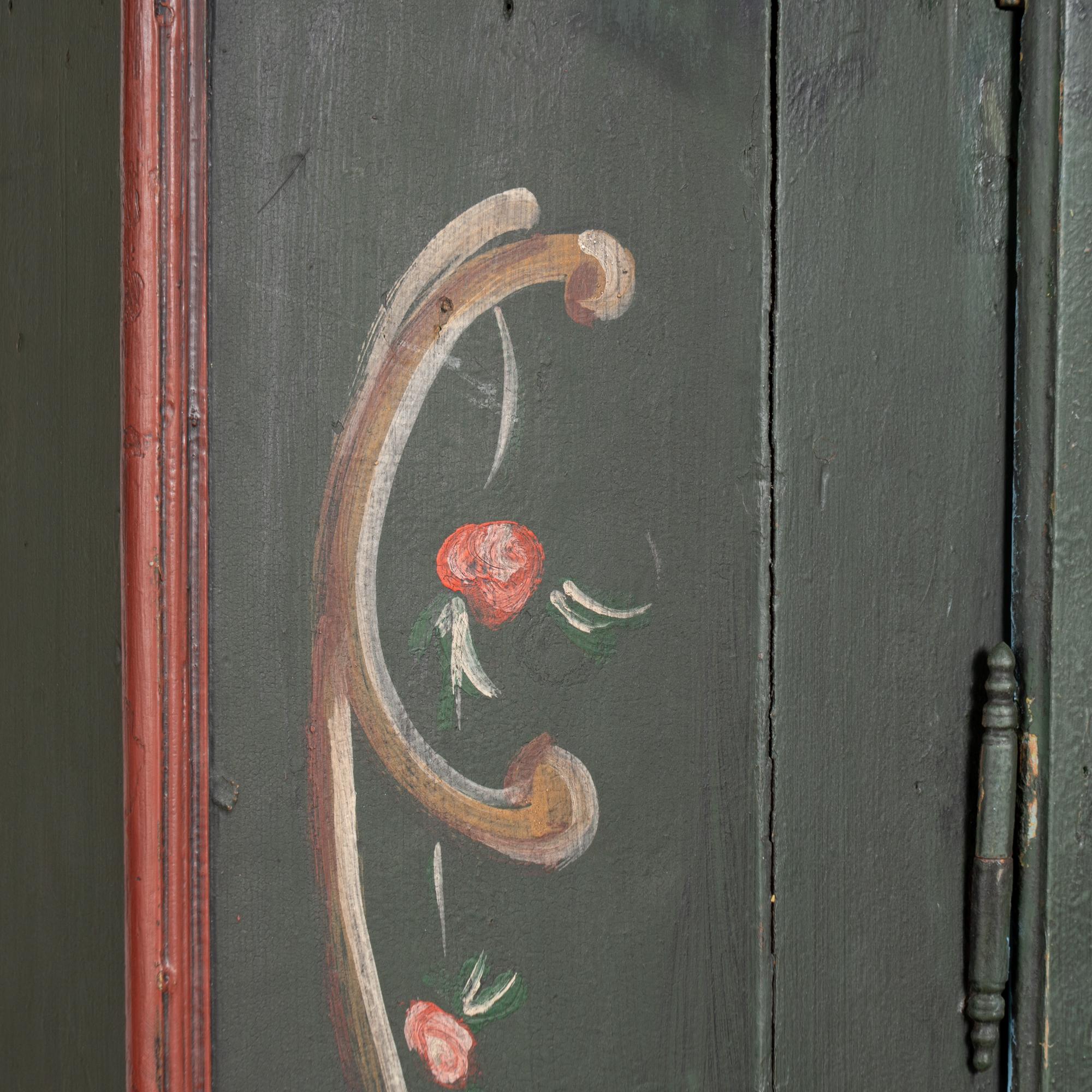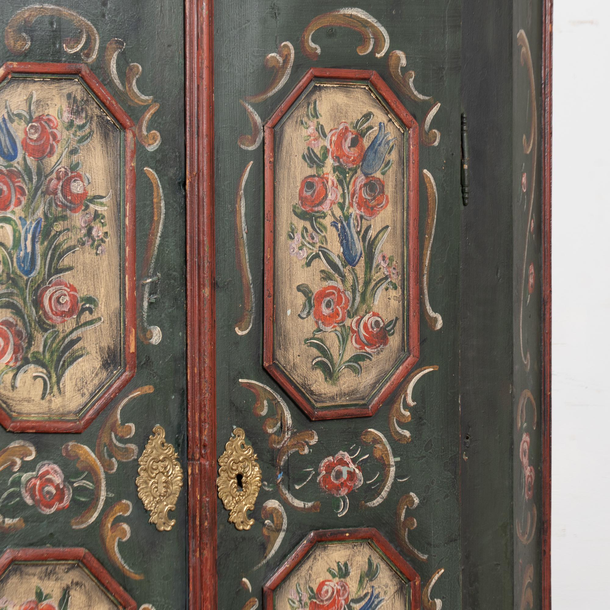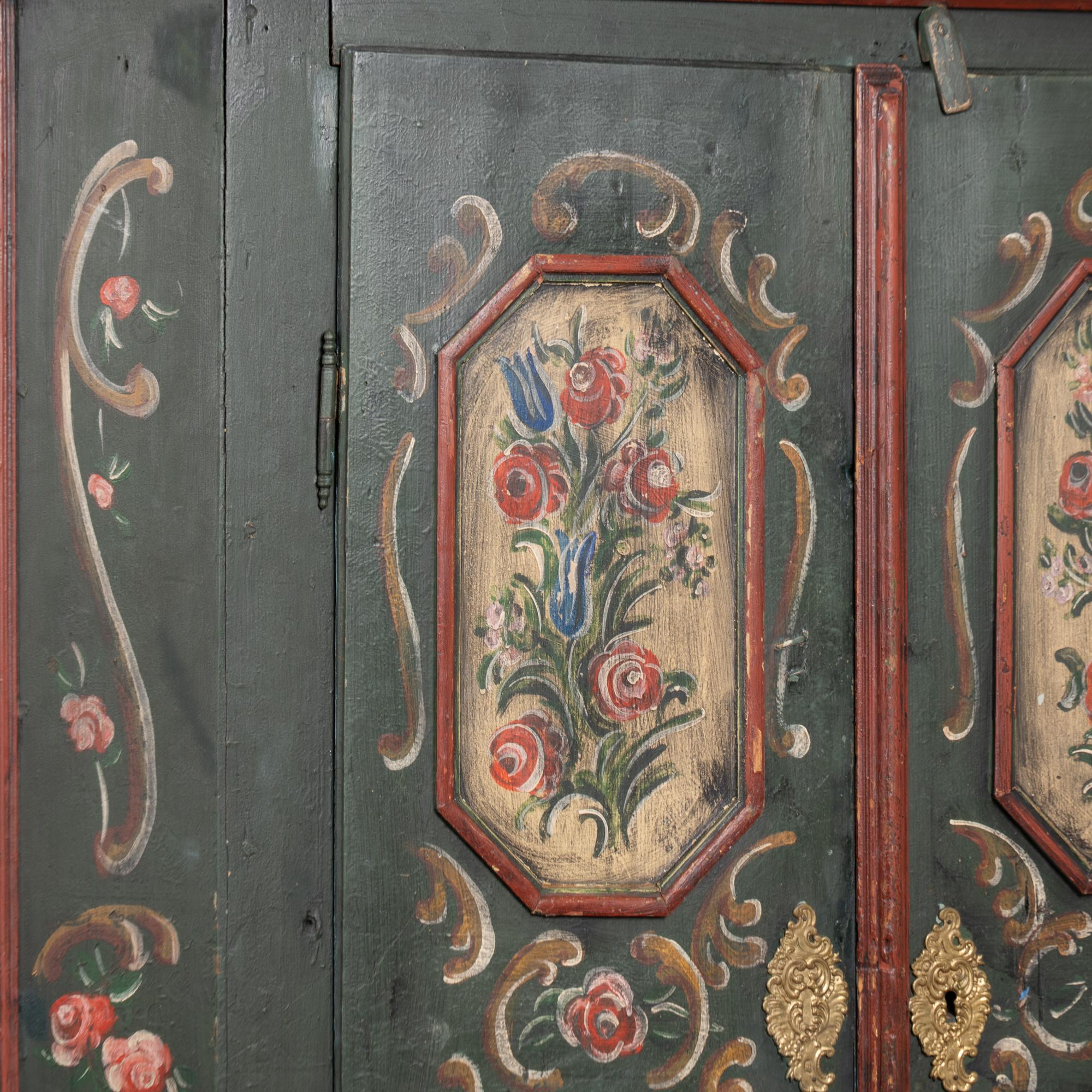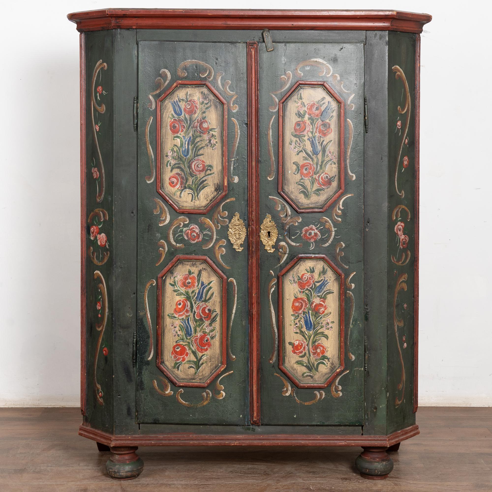 Early 19th-century German pine two-door armoire ("Shrunk") retaining its hand-painted finish. Front doors feature four paneled sections with floral motif, canted sides, painted in a forest green base accented by deep burgundy detailing. The piece rests on traditional bun feet.