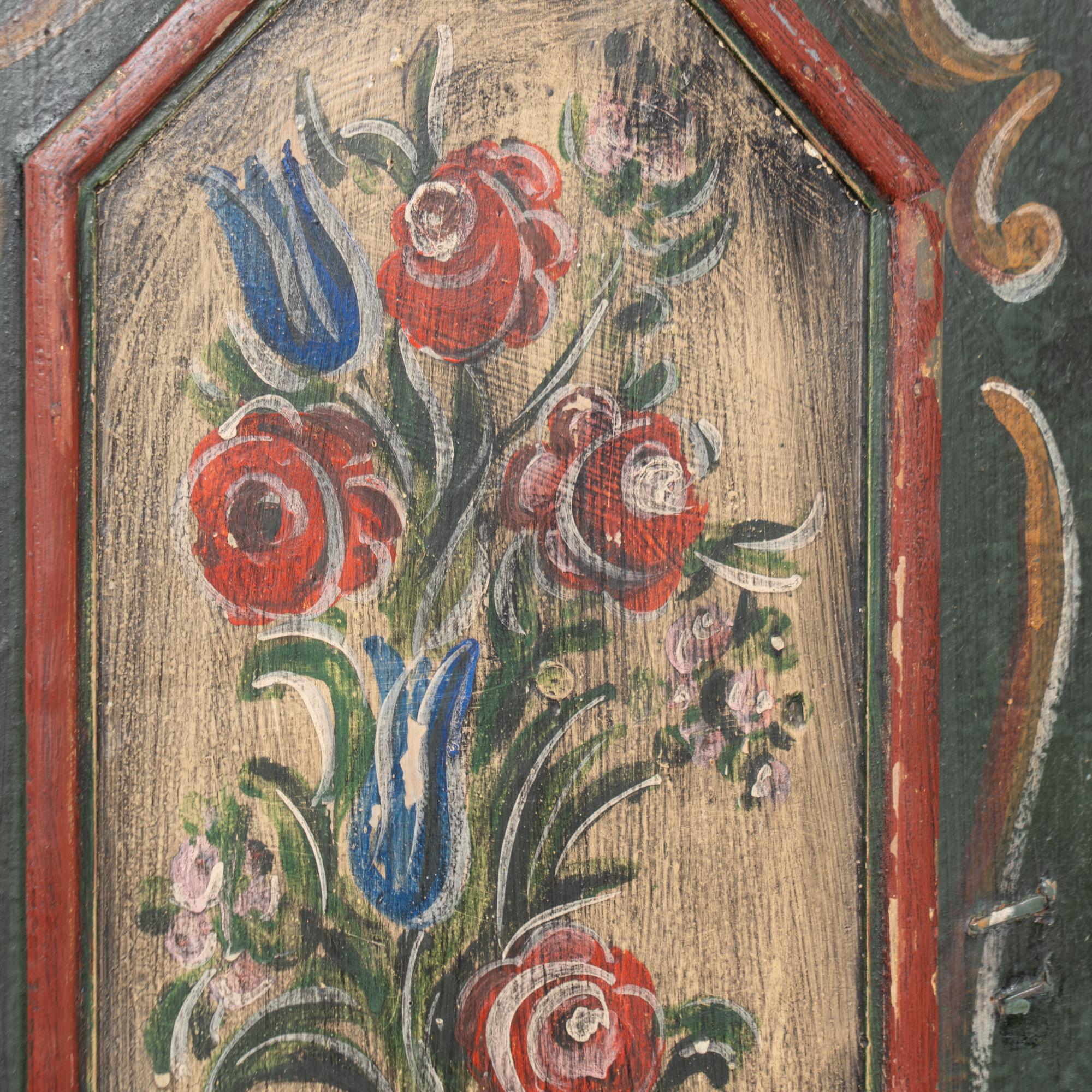 Historic use is reflected through its paint history and craftsmanship details, including small holes and cracks/gouges in the door fronts and back that may indicate an earlier repainting. Traditional German design elements and the original decorative palette give this piece strong character and presence.