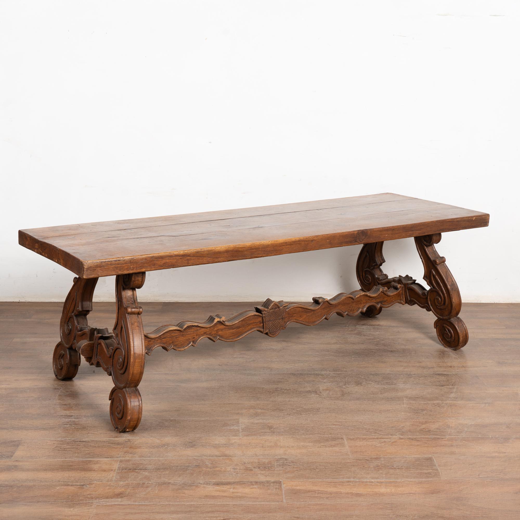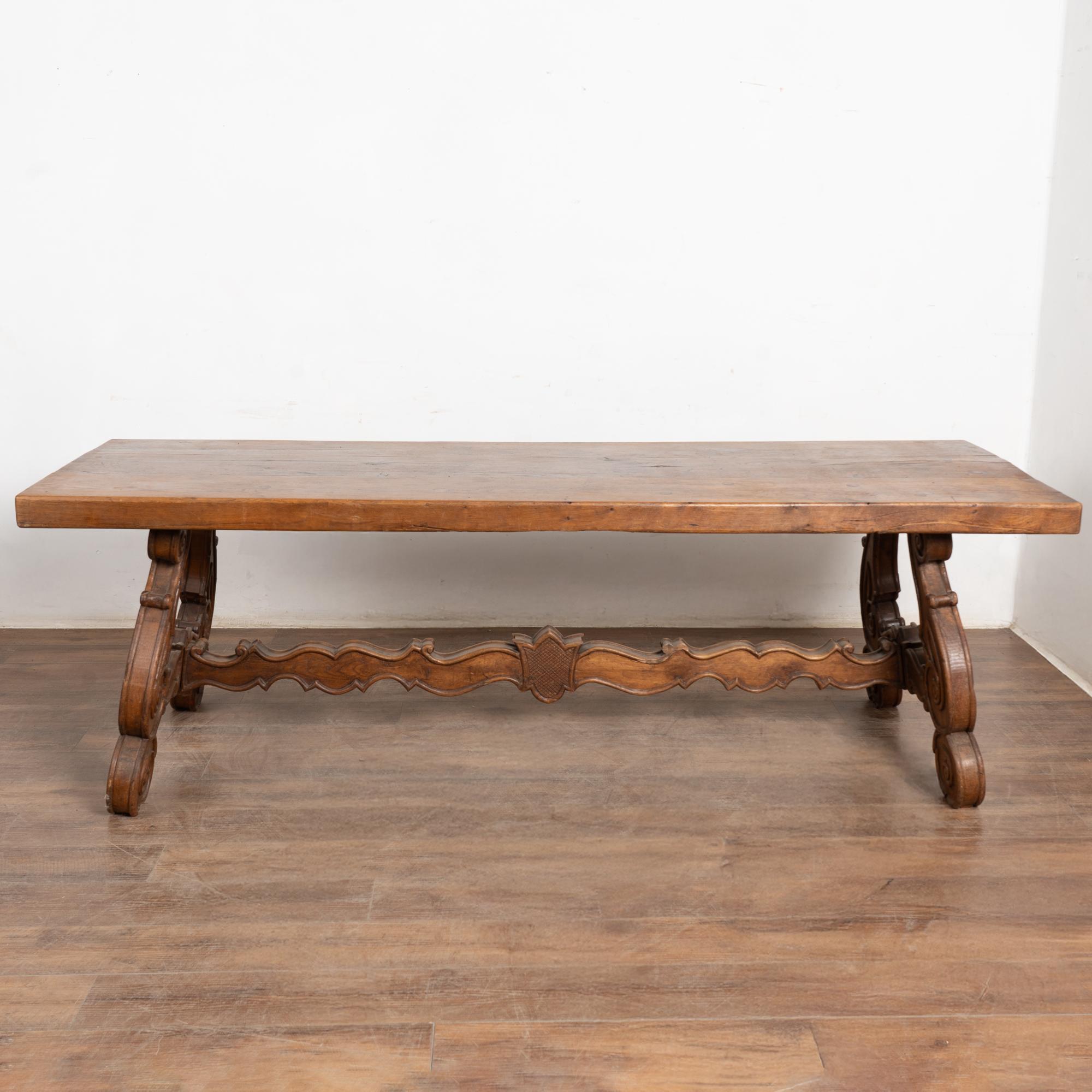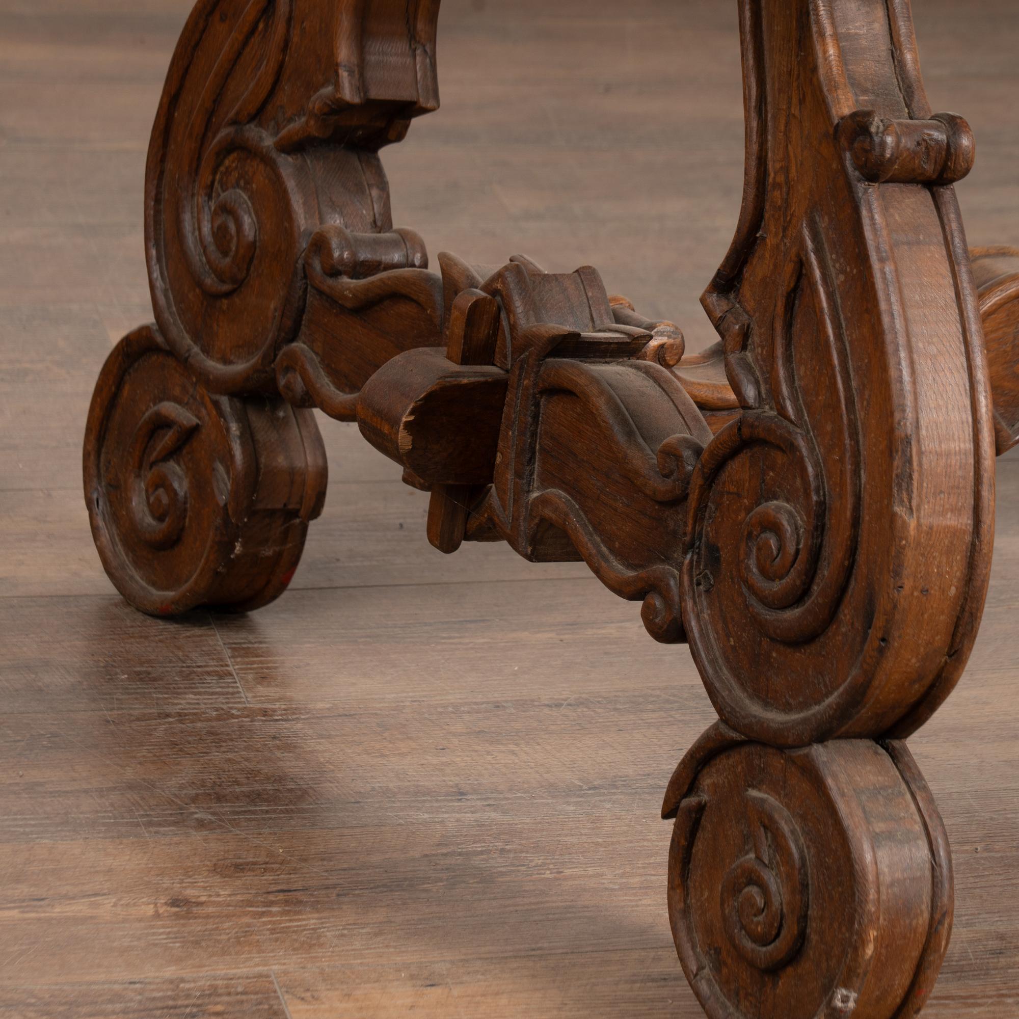 19th-century French oak dining table with a top over 2 inches thick and dramatically carved harp-shaped legs joined by a stretcher base.