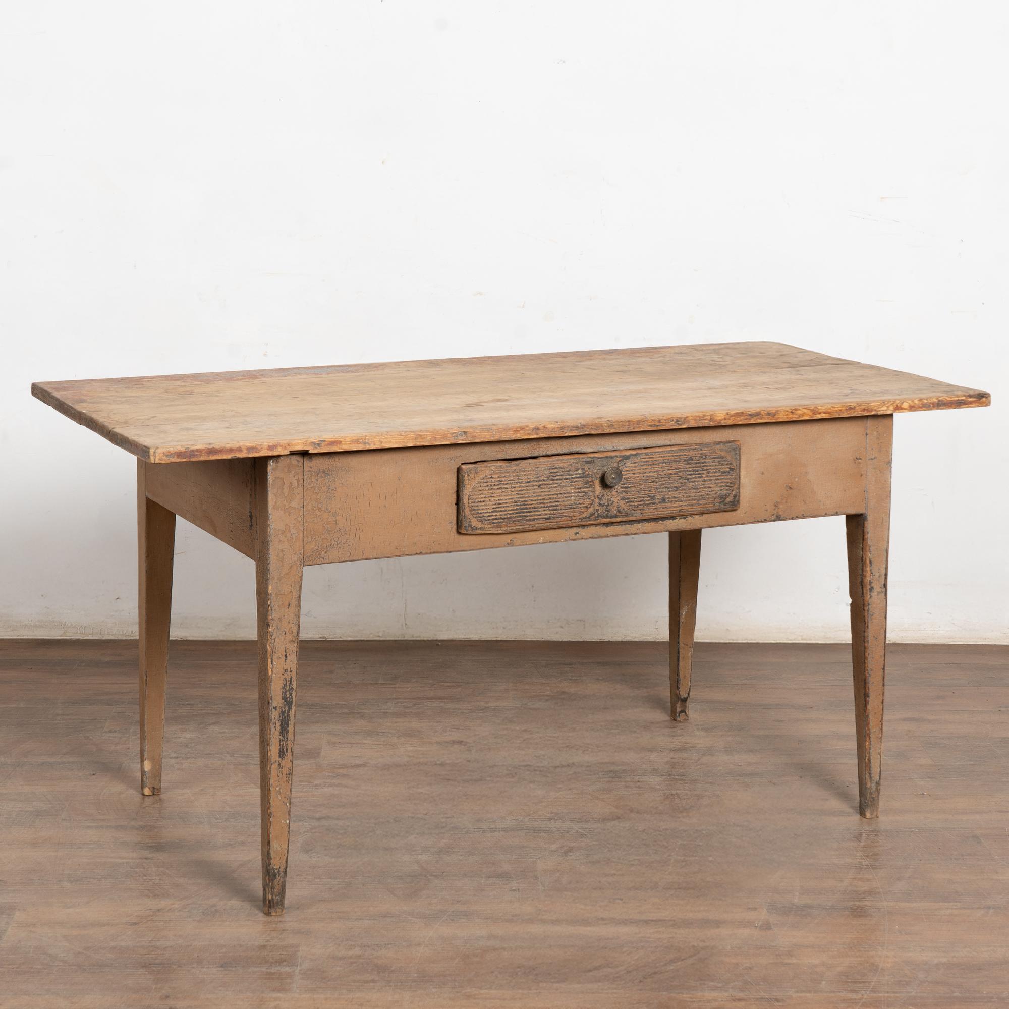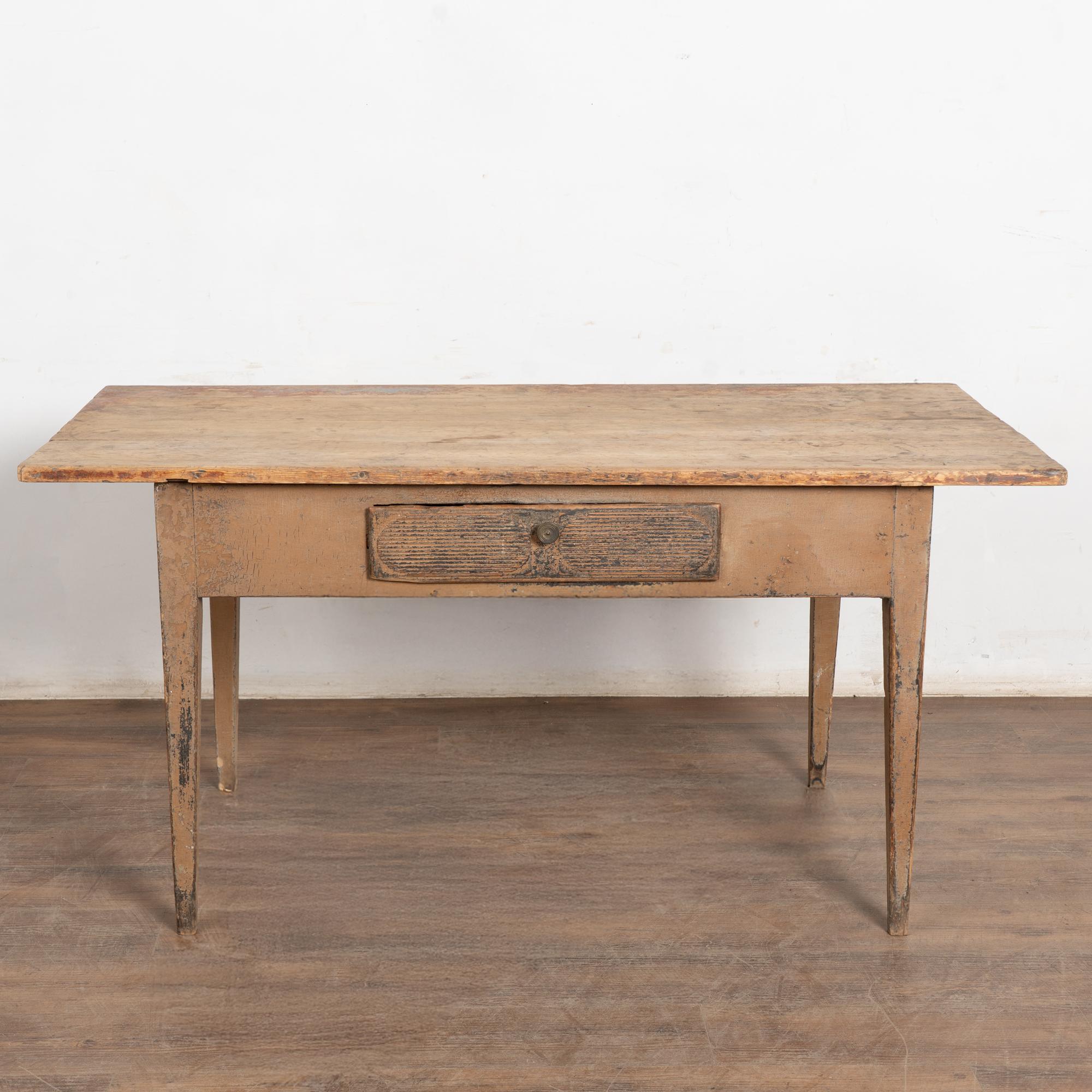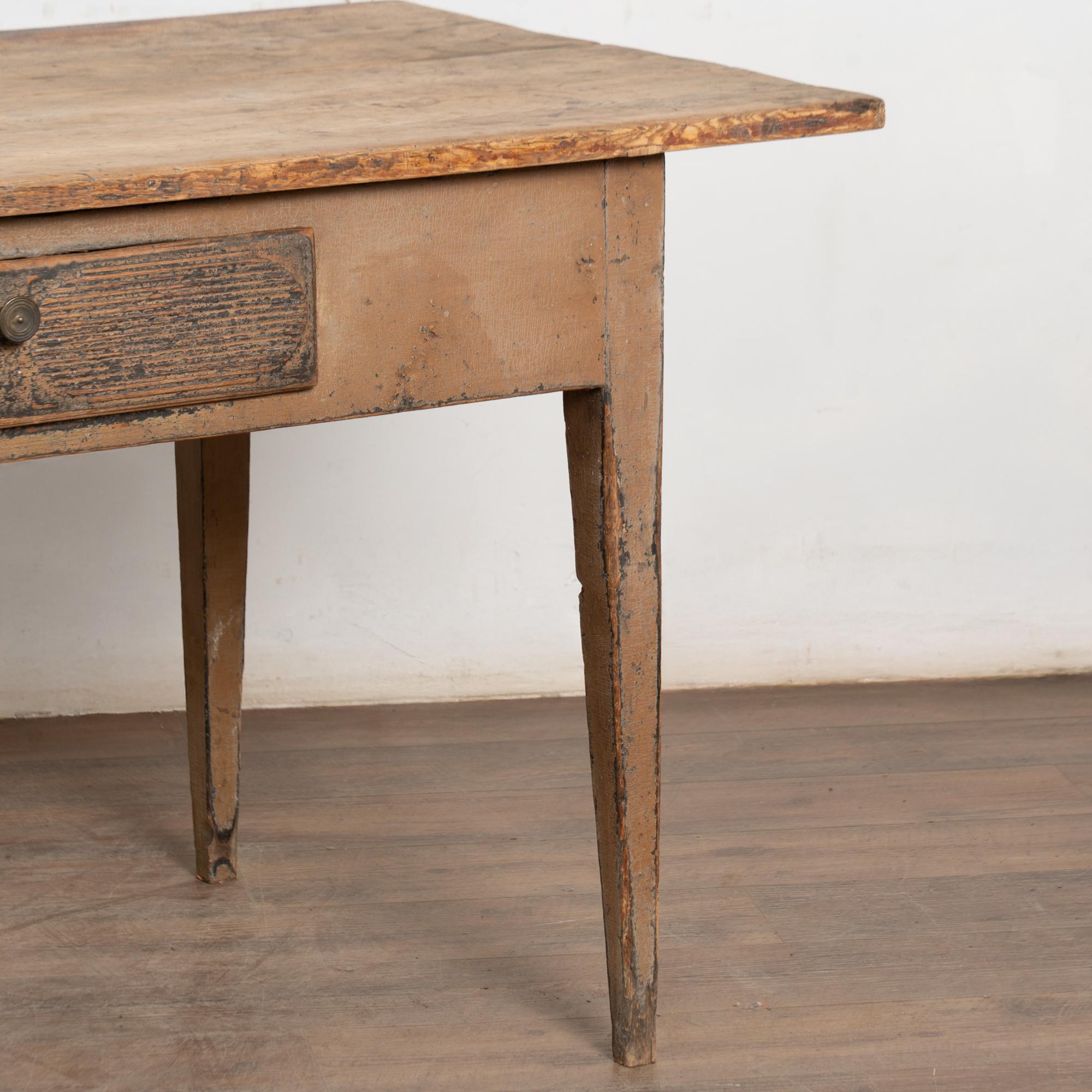 Early 19th-century Swedish pine farm table or console retaining layers of historic paint. The top shows remnants of an old painted surface in shades of taupe with black revealed beneath, along with traces of brick-red paint visible across the surface. The single fluted drawer also reveals underlying black paint and opens with a brass pull.