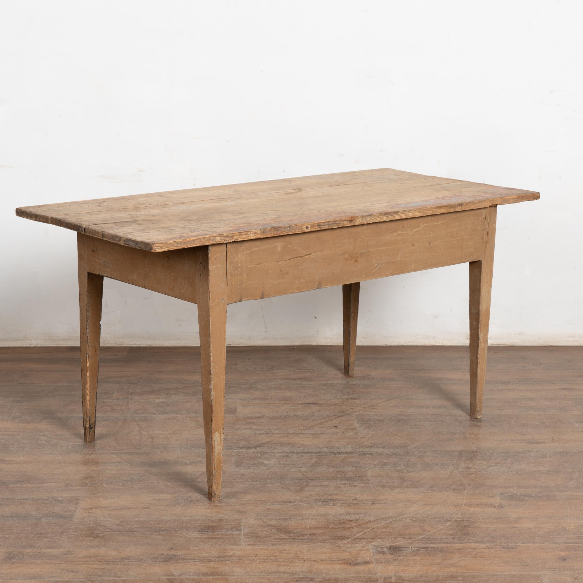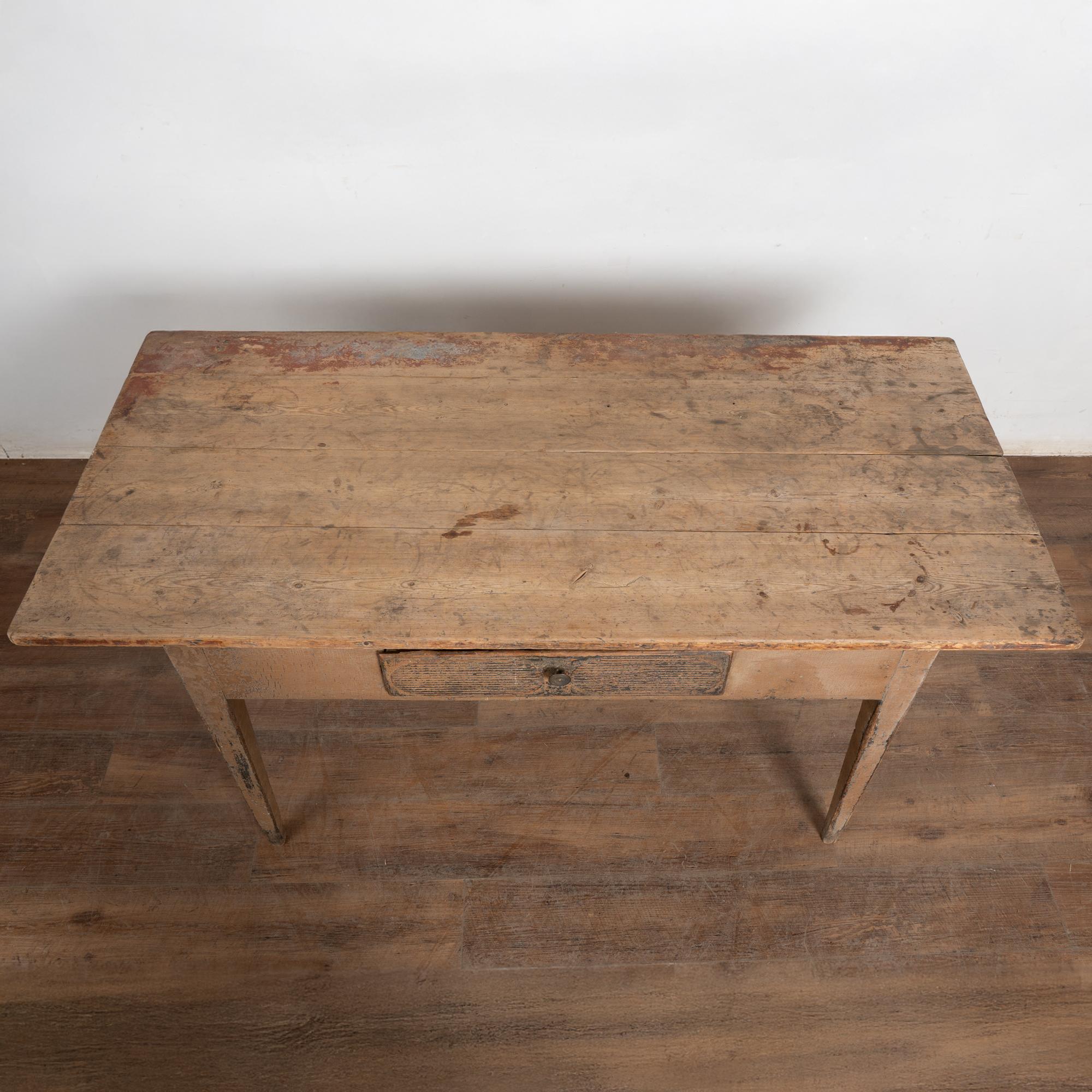 The tabletop displays extensive signs of long use, including cracks, stains, plank separation, and surface wear that reflect its utilitarian farm origins. The base maintains old painted surfaces with visible crackling, adding texture and depth. Tapered legs support the long, slender form of the table and show additional wear and nicks. Minor separation is present in the drawer bottom, typical for early pine construction.