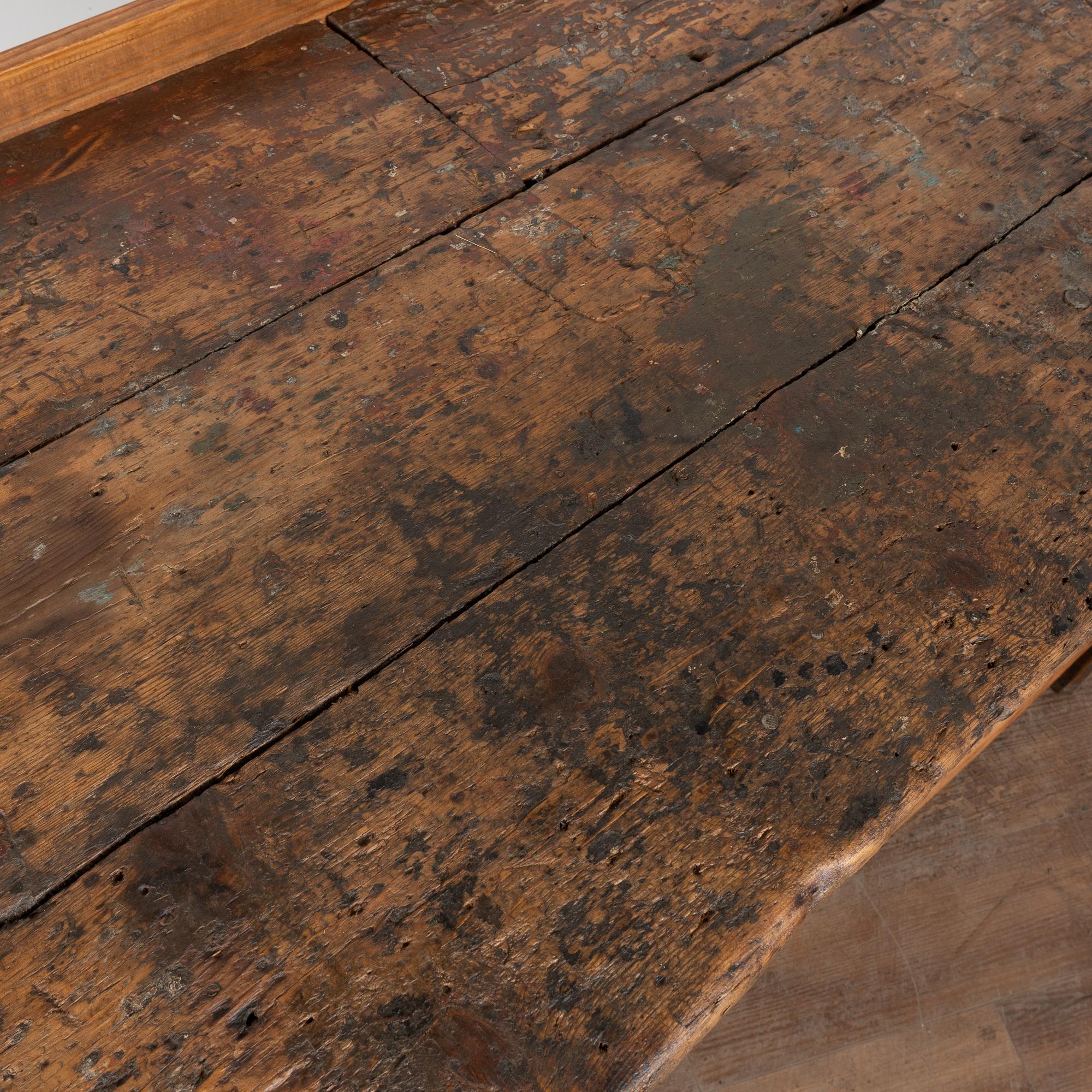 19th-century rustic pine work table with heavy distress and exposed bolts enhancing its industrial appeal. The surface shows extensive use with cracks, stains, gouges, and wear consistent with age. Lower shelf may have been replaced at some point in time.