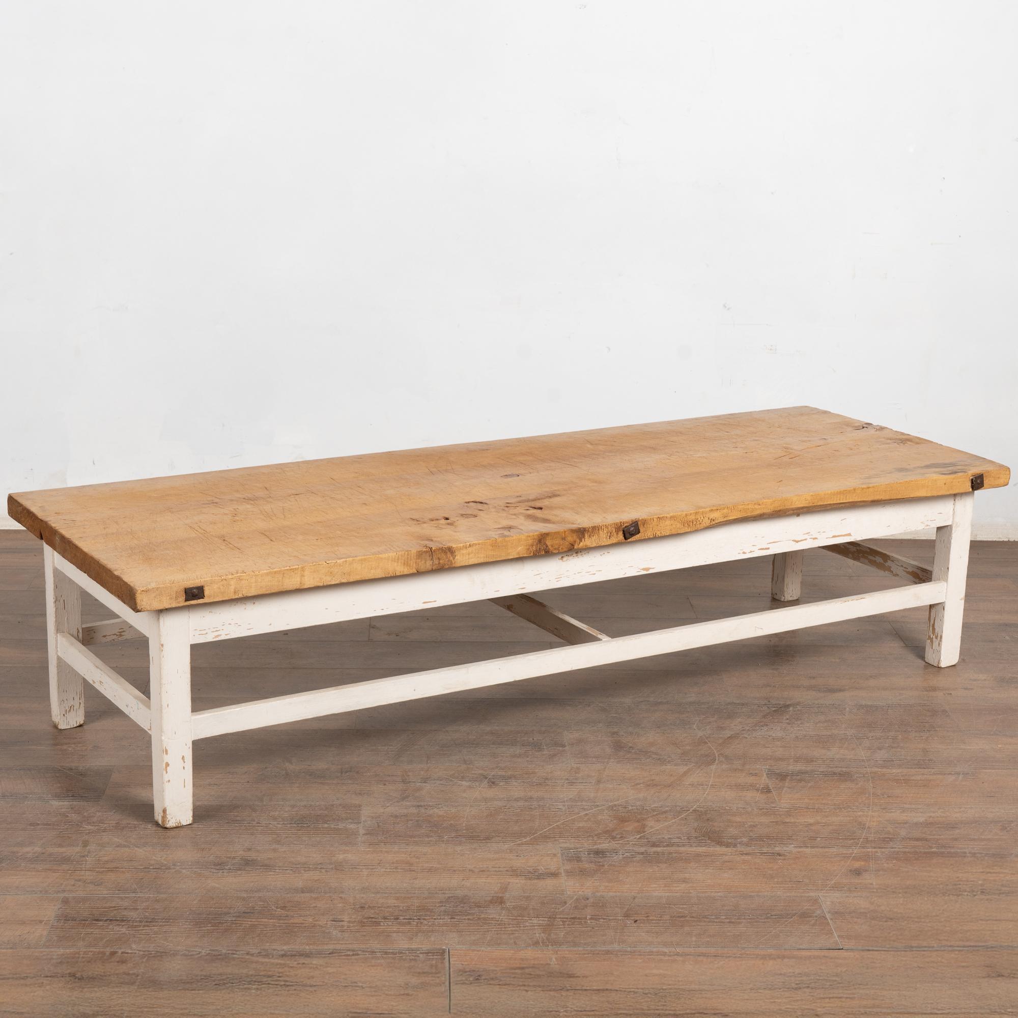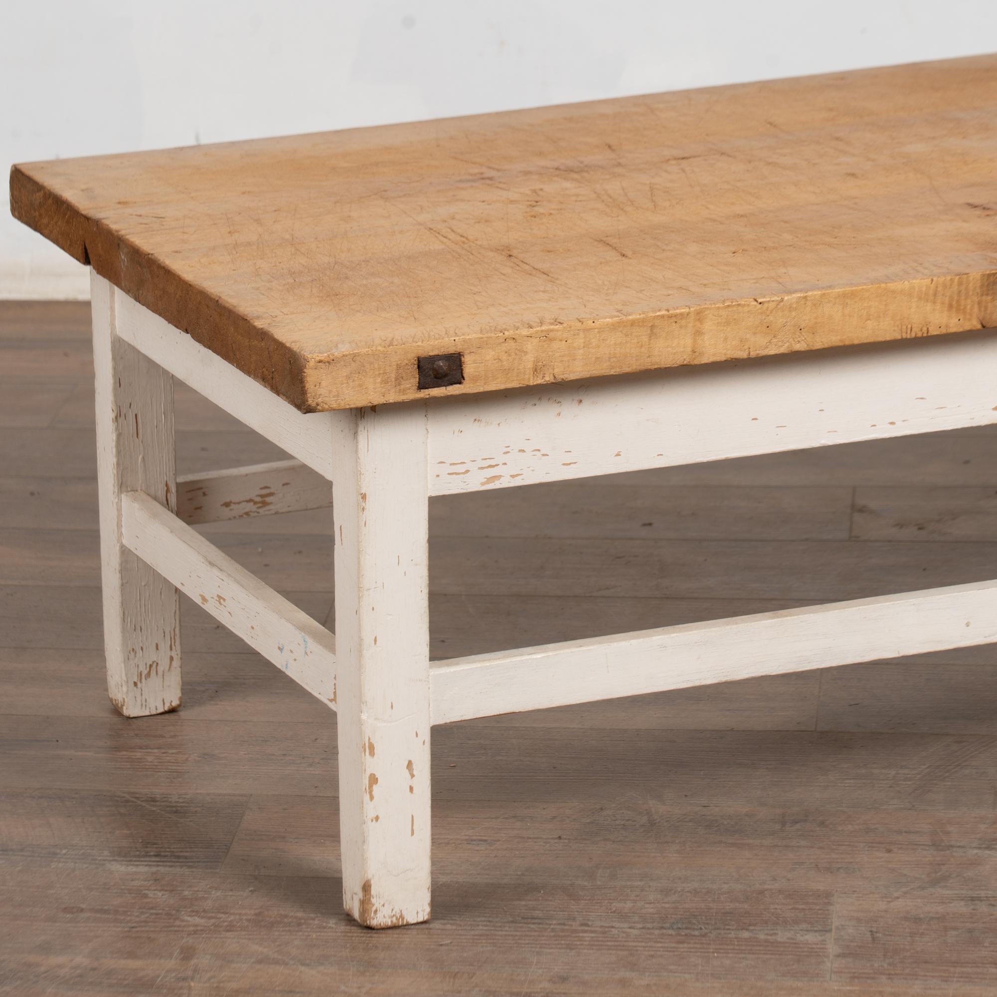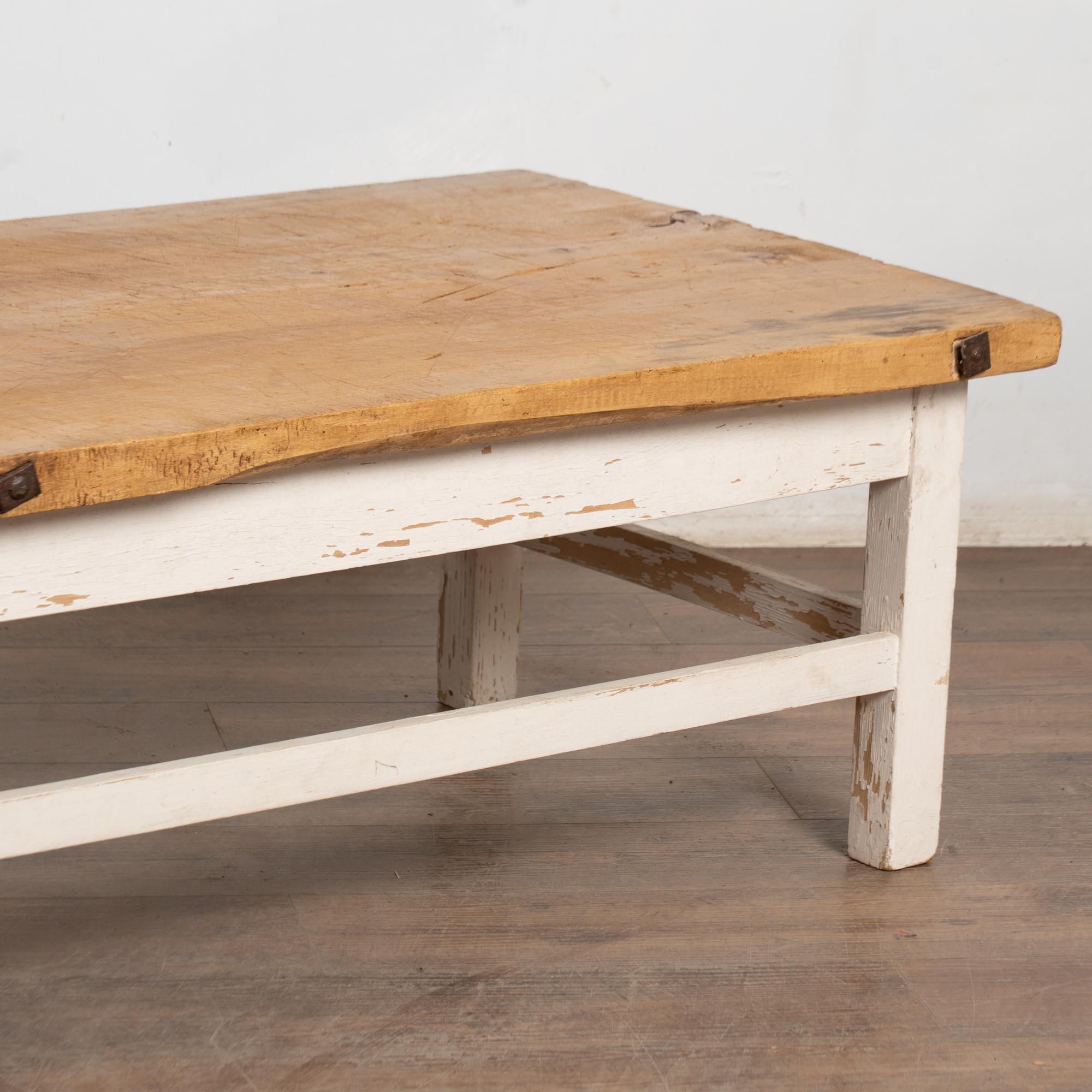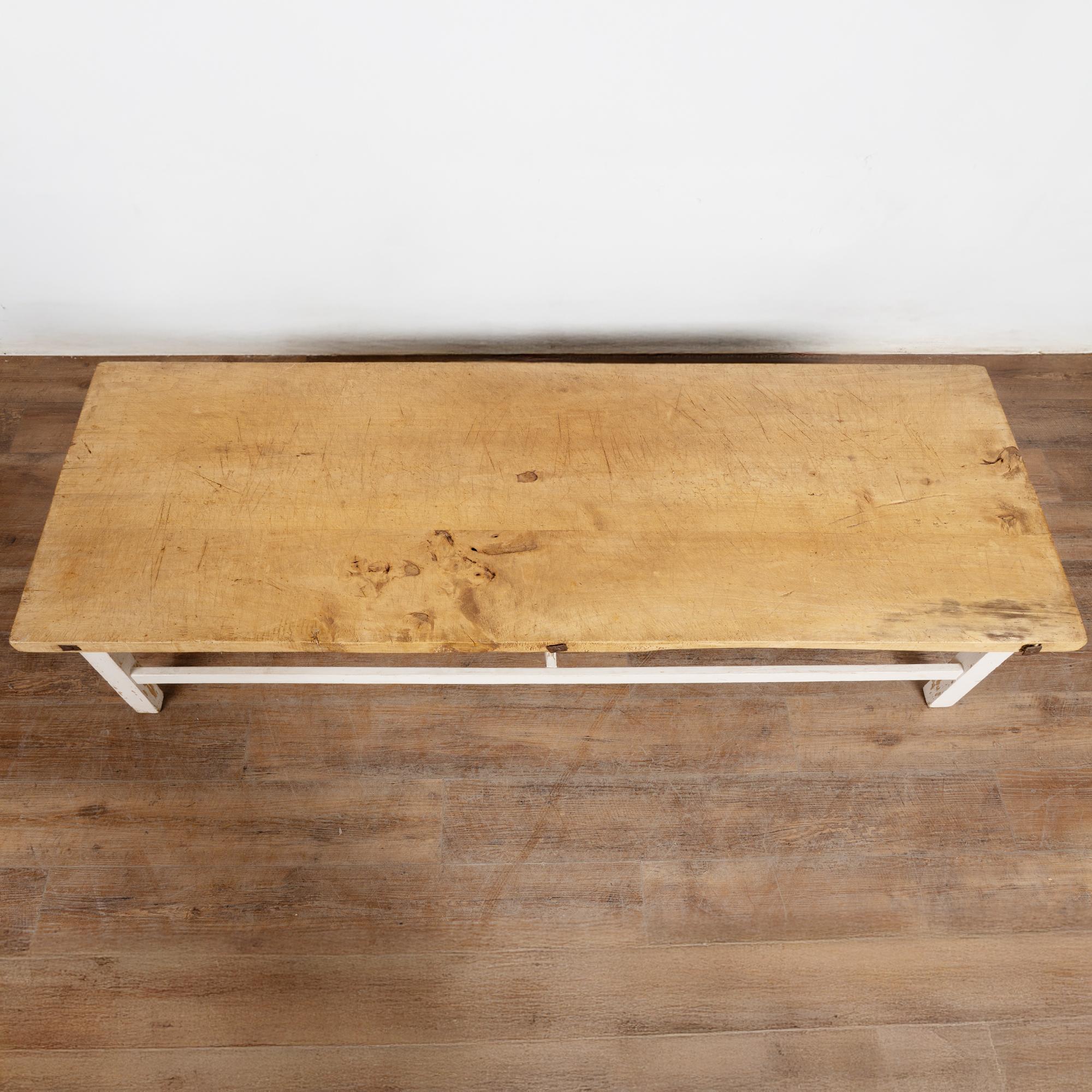 Rustic 20th-century pine farmhouse coffee table with original white painted base displaying natural paint wear and loss. The pine top shows prominent gouges, scrapes, and surface texture knots suggesting it may have once served as a work table surface and reveals generations of use.
