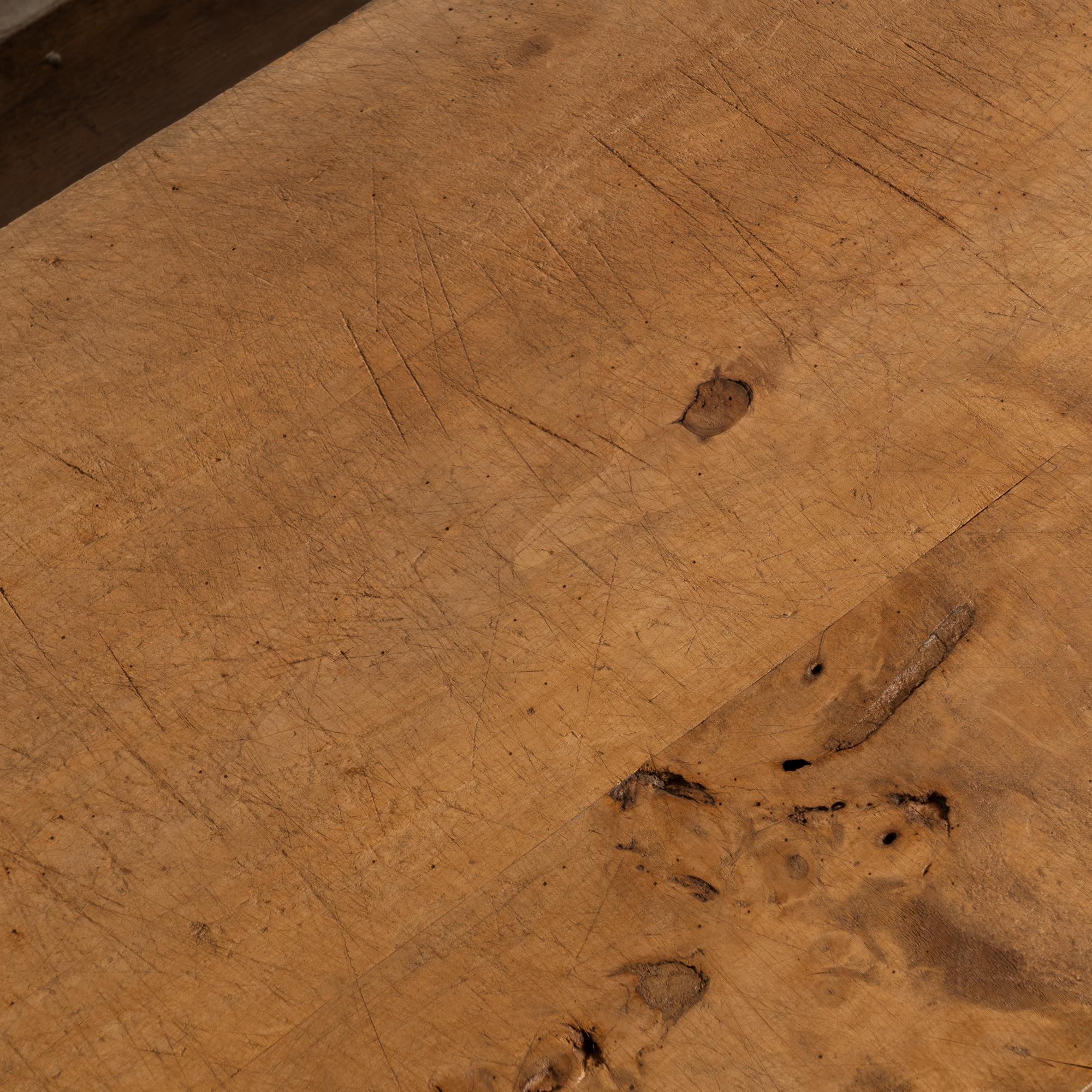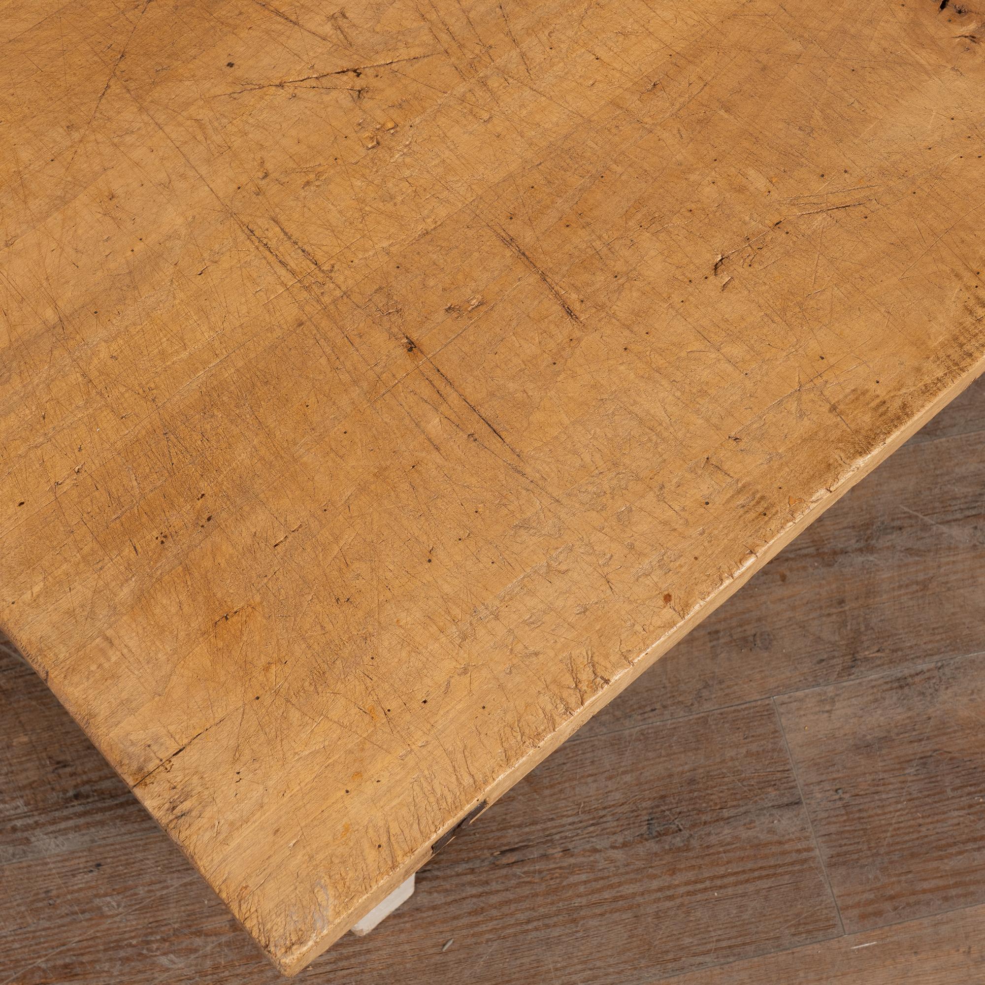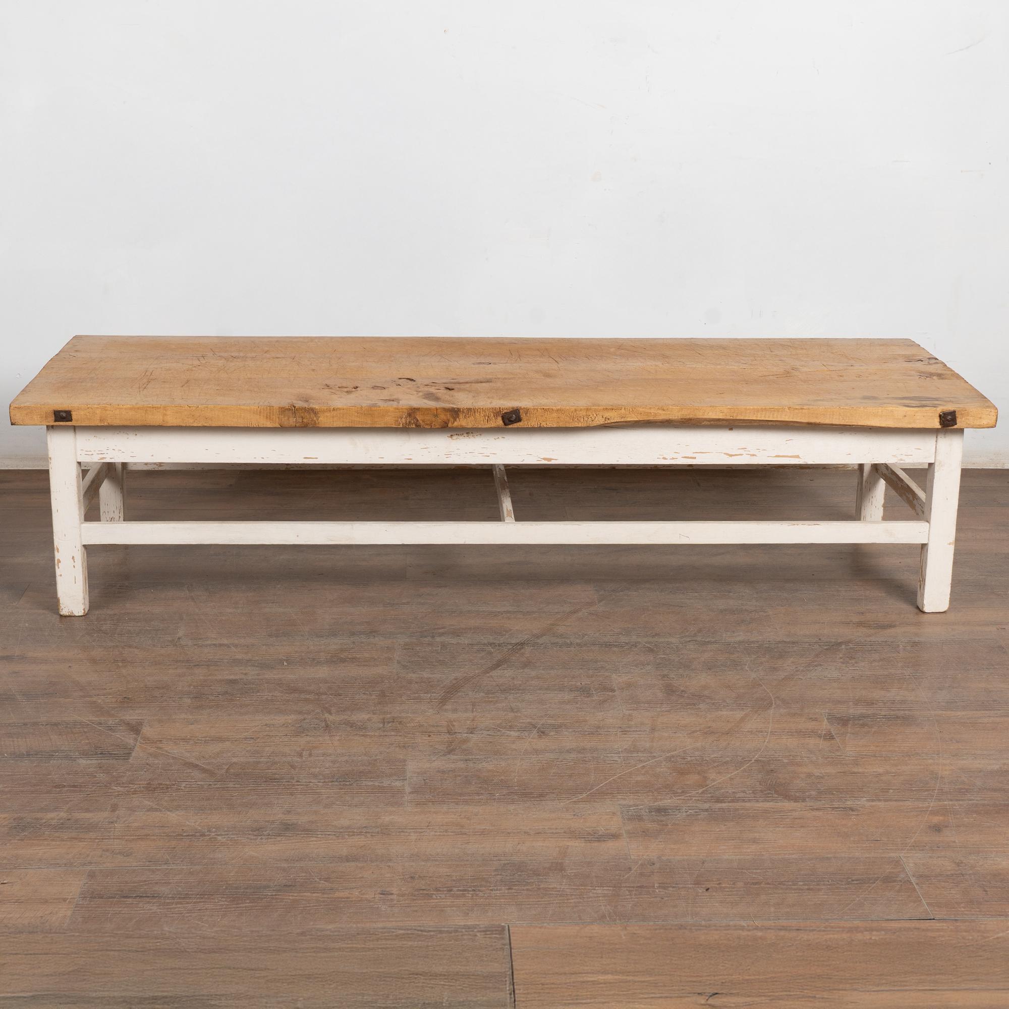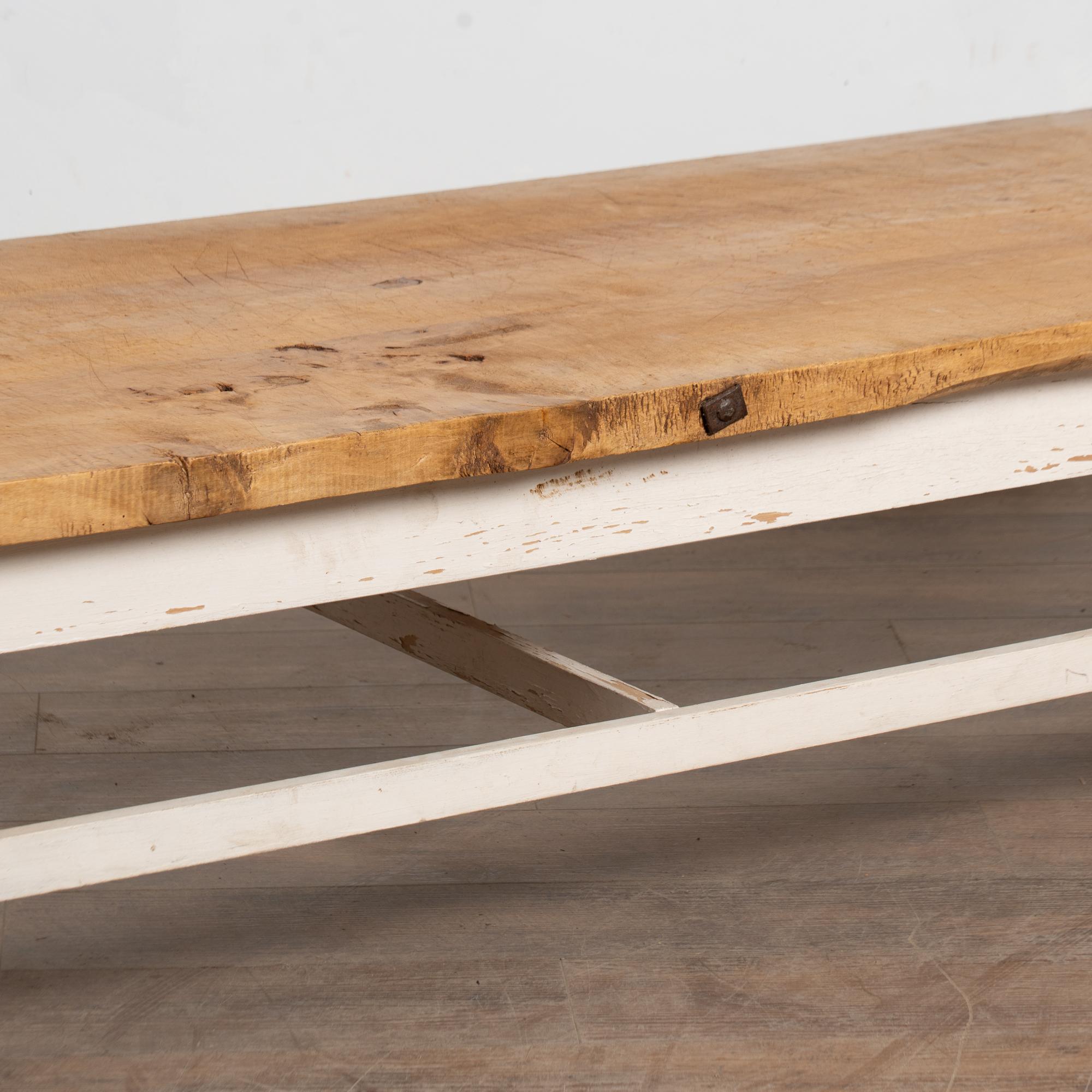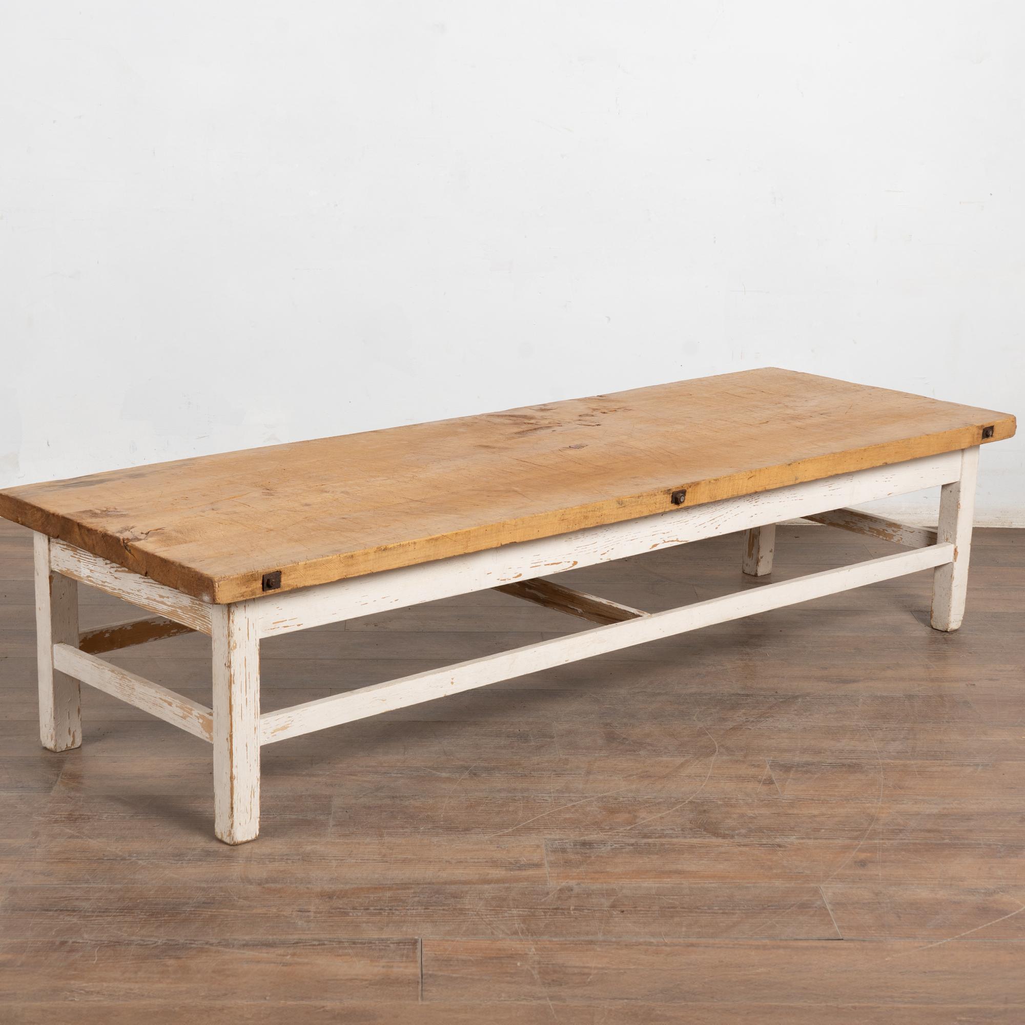 Rustic 20th-century pine farmhouse coffee table with original white painted base displaying natural paint wear and loss. The pine top shows prominent gouges, scrapes, and surface texture knots suggesting it may have once served as a work table surface and reveals generations of use.