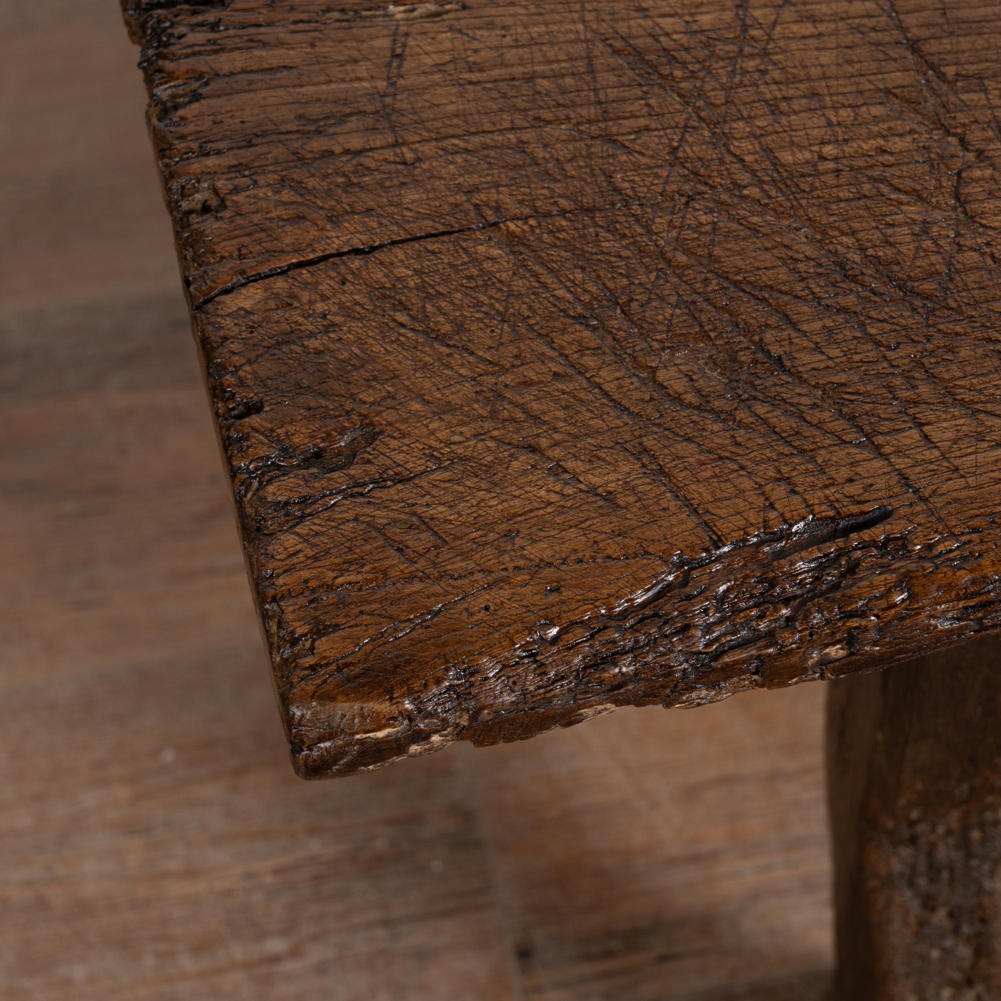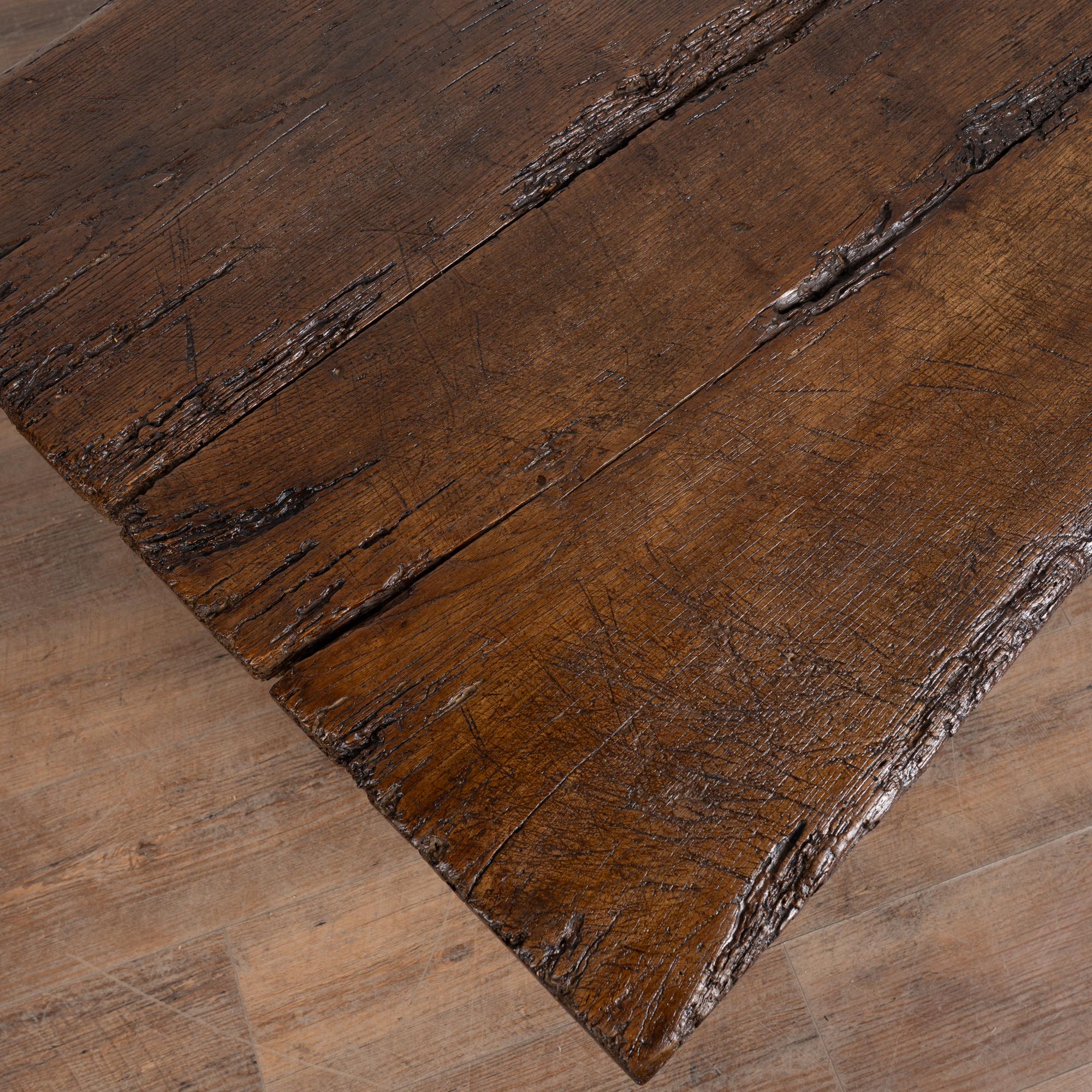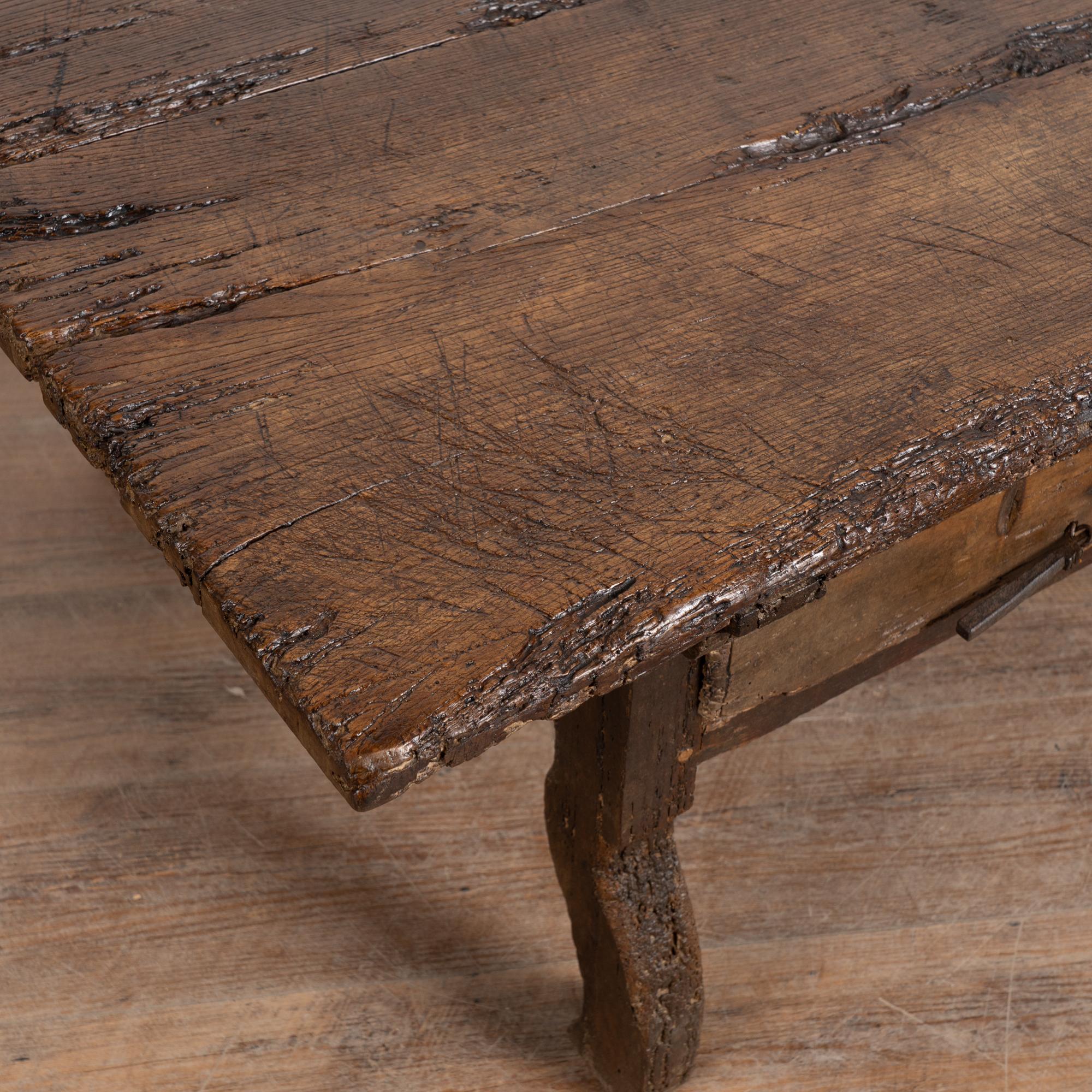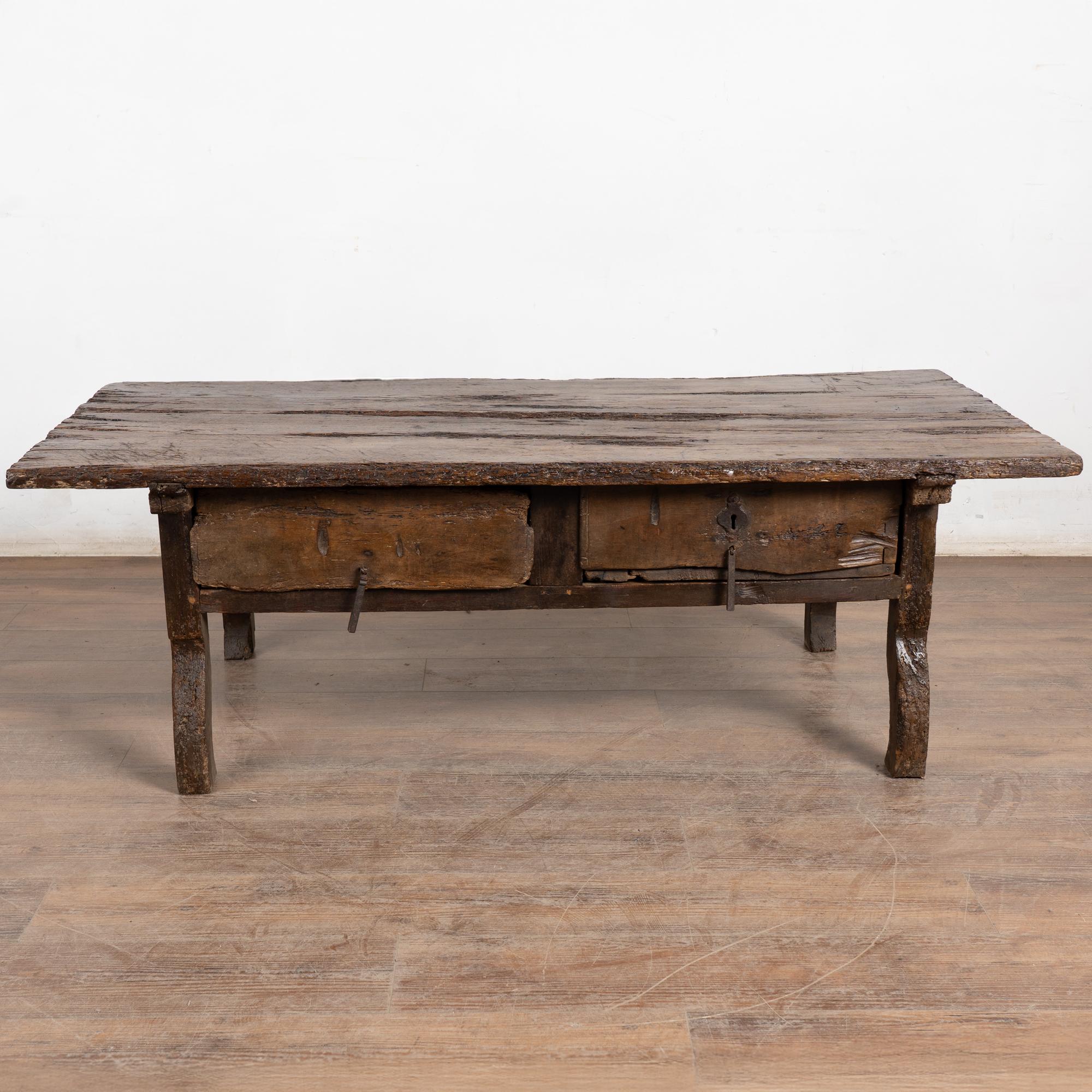 This rustic dark oak coffee table features two drawers with iron pulls. The extensive wear and distress are what give this table its remarkable character. Deep gouges, cracks, scratches, and traces of old wormholes appear throughout the top, drawers, and oxbow-shaped legs. Old cracks have been repaired, preserving the sturdy structure while maintaining its timeworn charm.