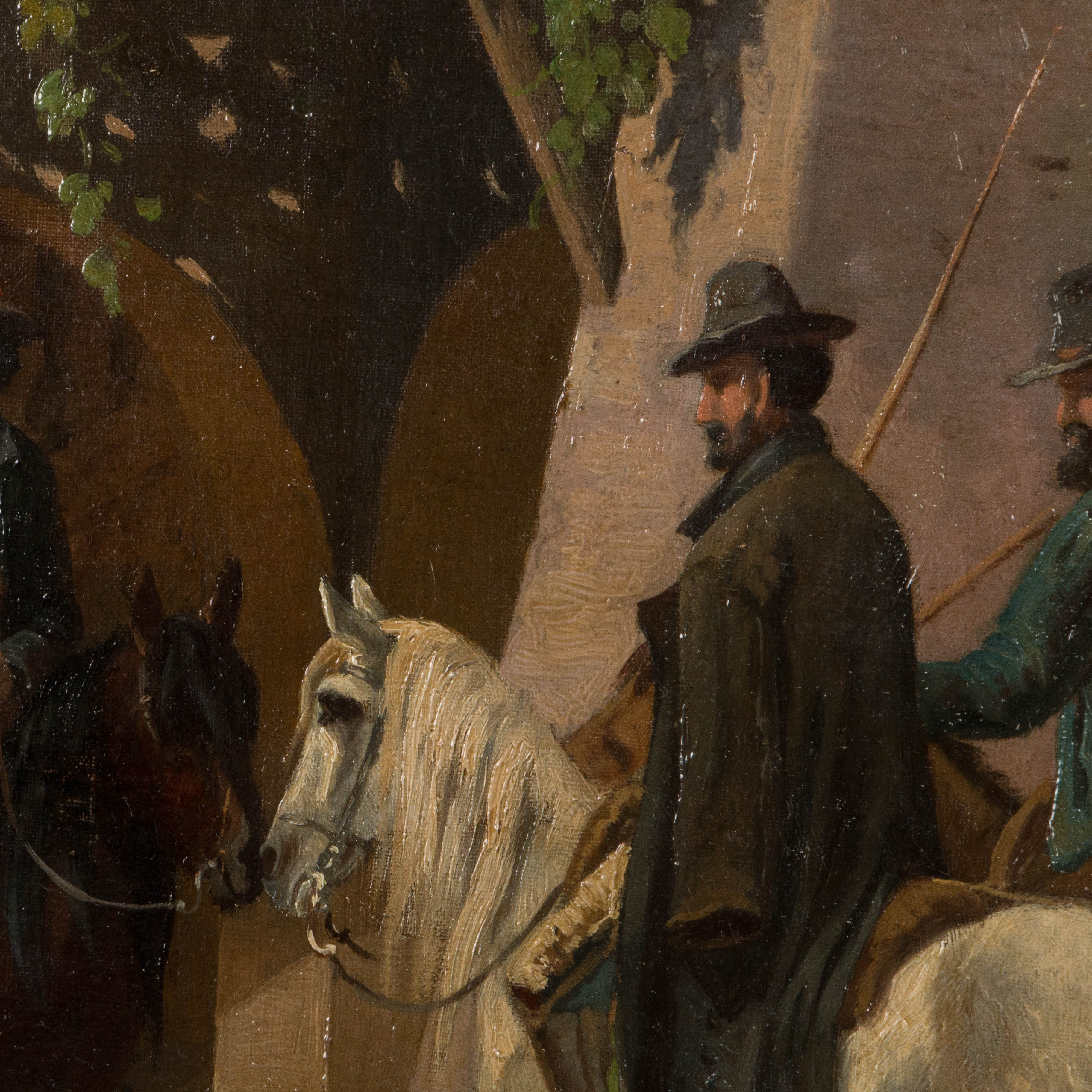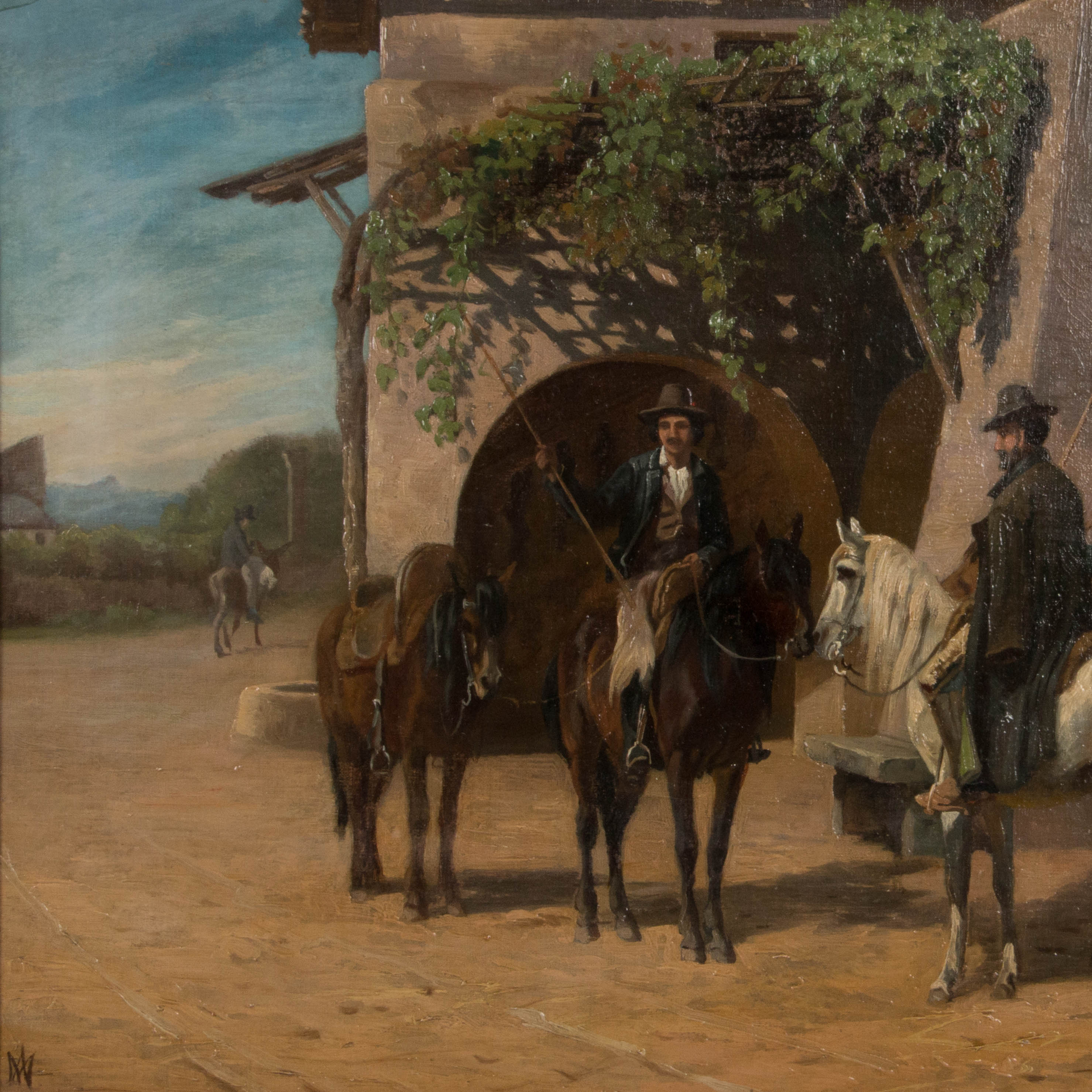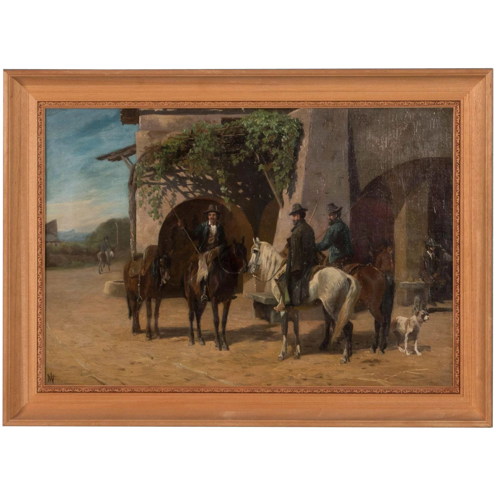 Original oil on canvas of three men on horseback talking on a village street, by Danish artist Adolf Henrik Mackeprang (1833-1911).