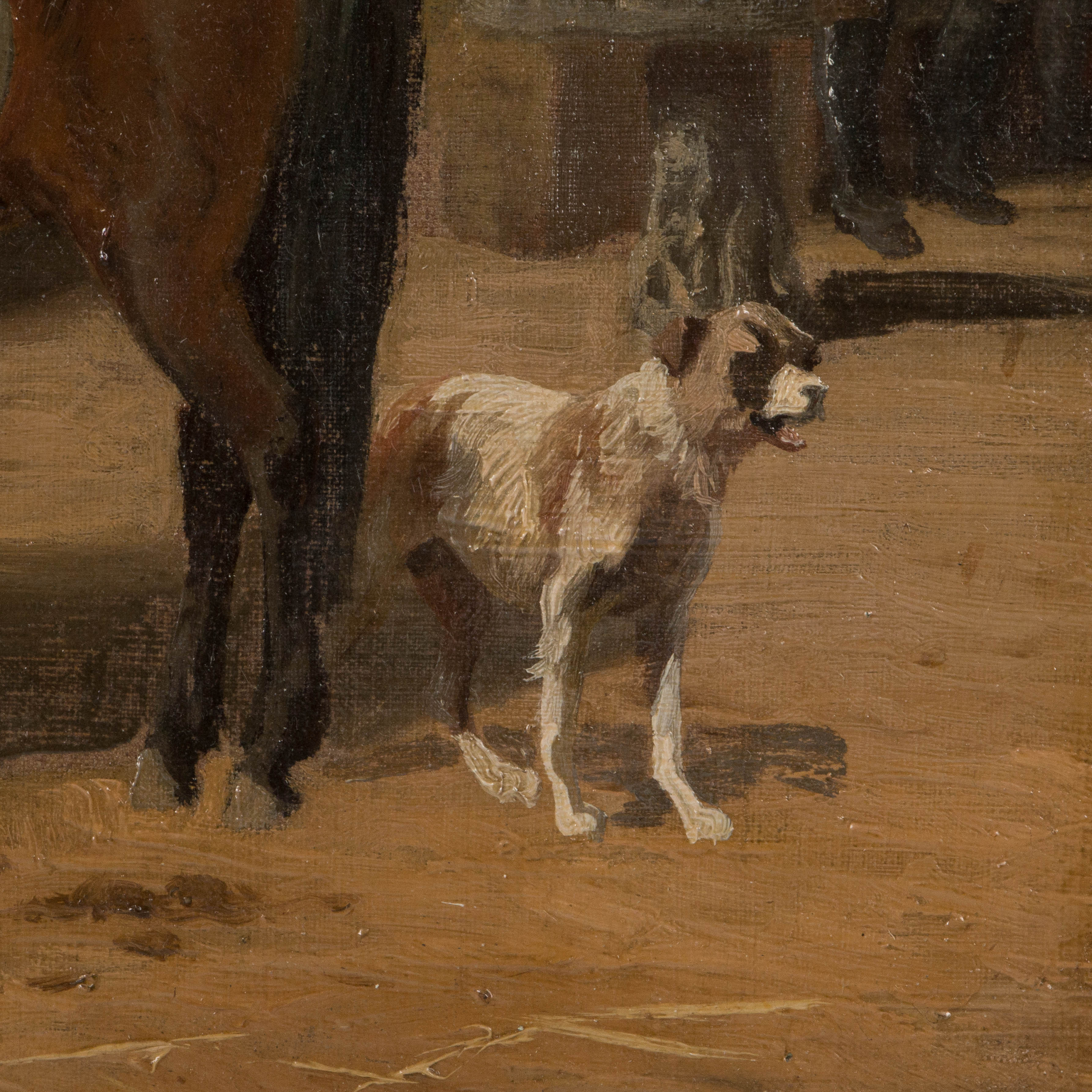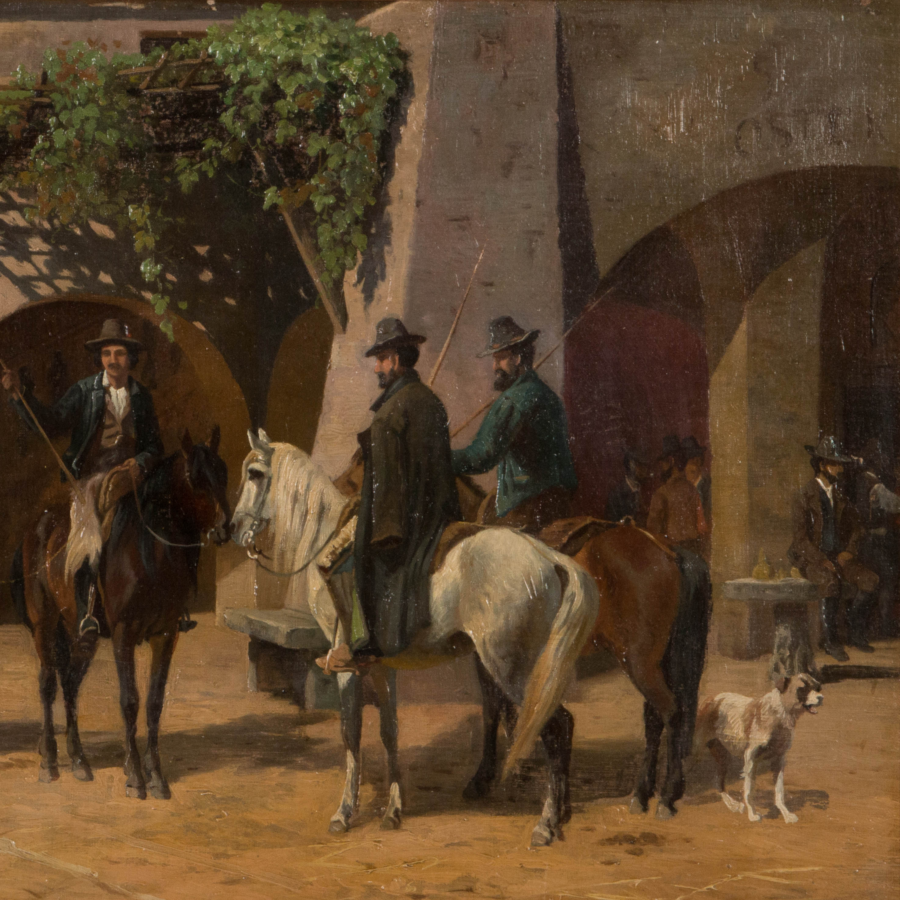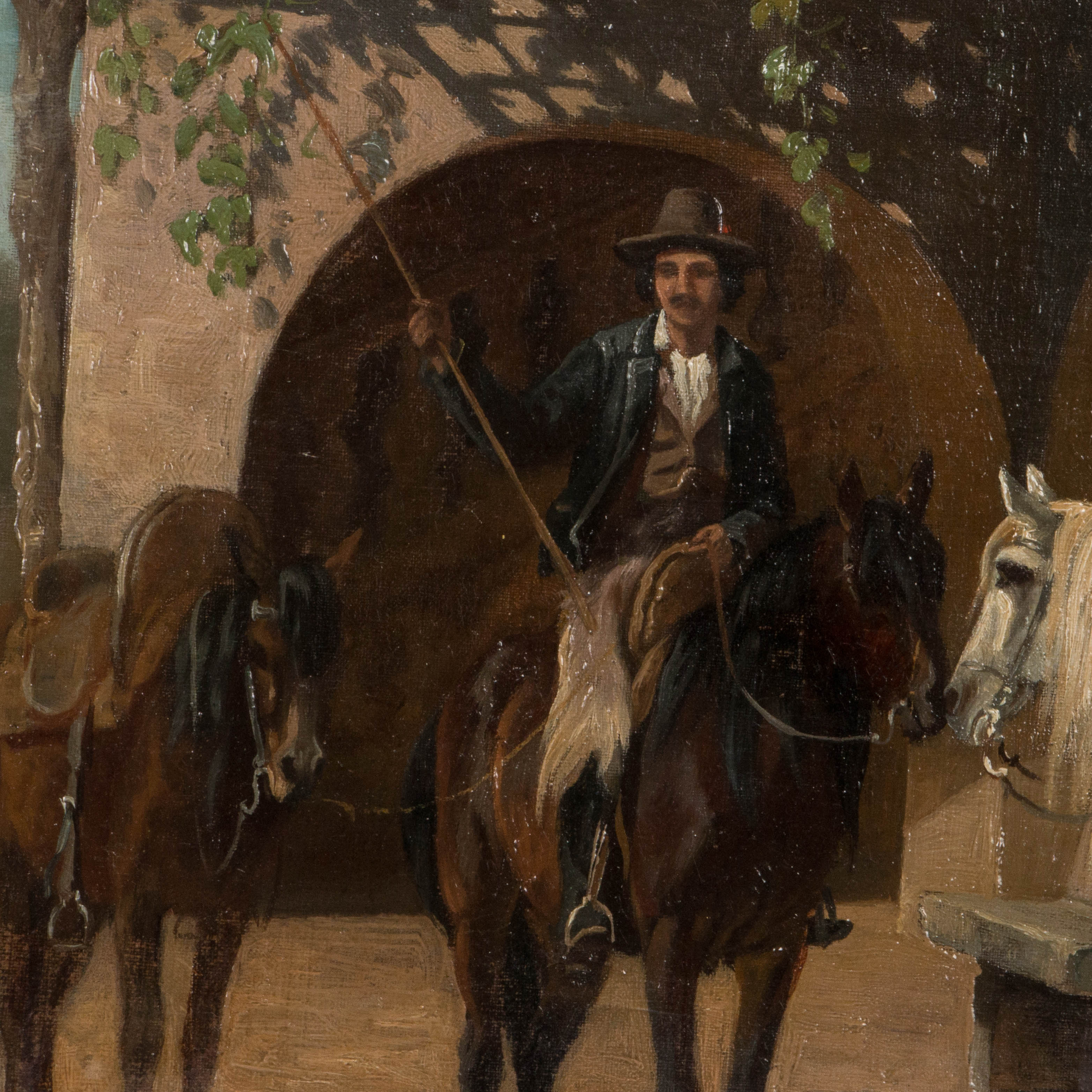 Original oil on canvas of three men on horseback talking on a village street, by Danish artist Adolf Henrik Mackeprang (1833-1911).
