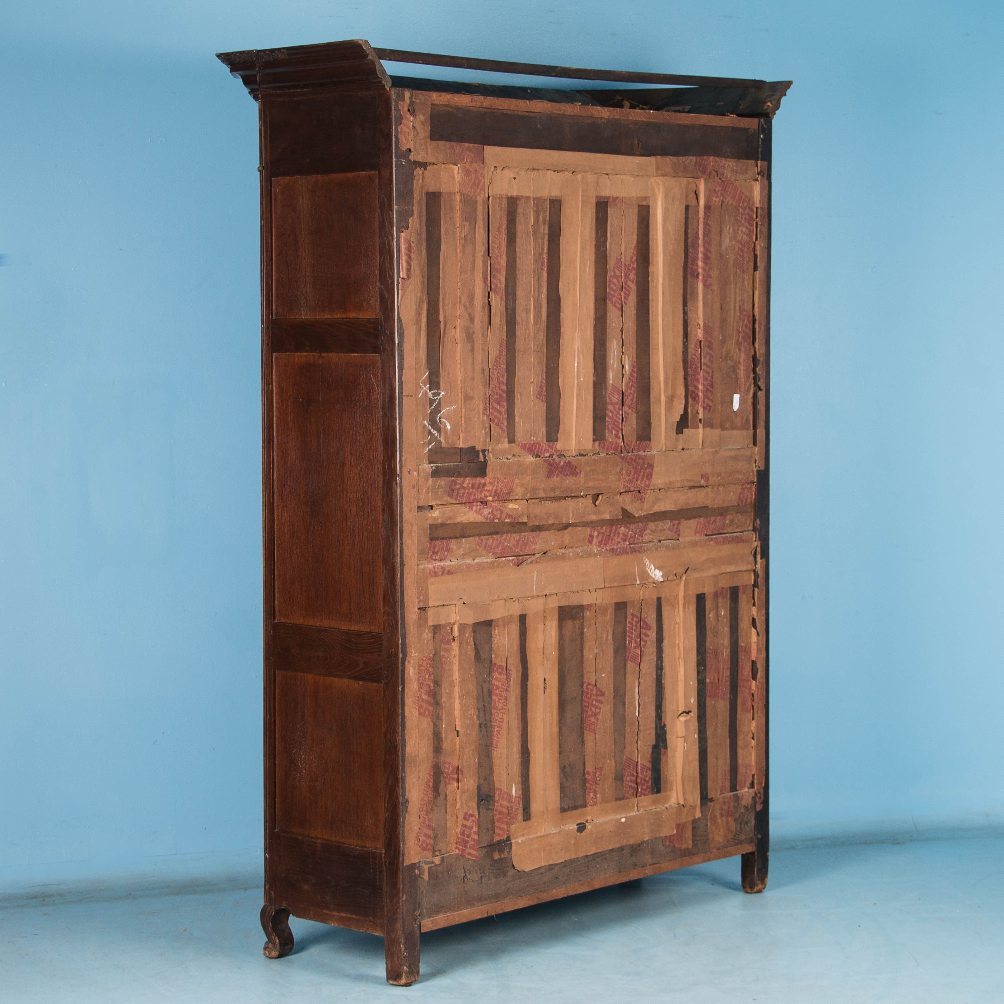 Attractive carvings of vines, leaves and flowers embellish this armoire giving it a romantic touch. Crafted in the late 18th century France, this oak armoire has beautifully carved moldings from the cornice to the door as well as the side panels. This tall cabinet also features the original brass hinges and key escutcheons traditional in France, and a warm reddish brown patina that only comes through years of use and care. Please take a moment to enlarge the photos and examine the exquisite details up close. Age related separation of the back planks and overall wear are commensurate with age, and simply add to the depth and character of this impressive oak armoire.