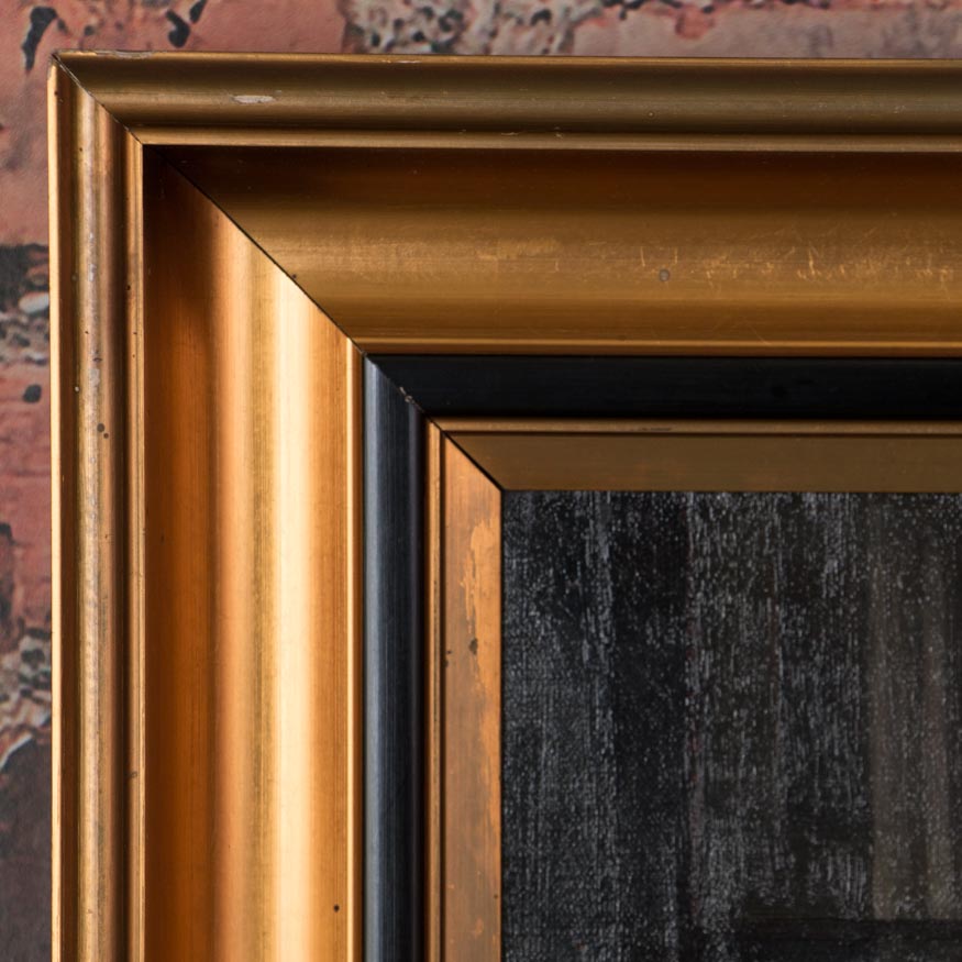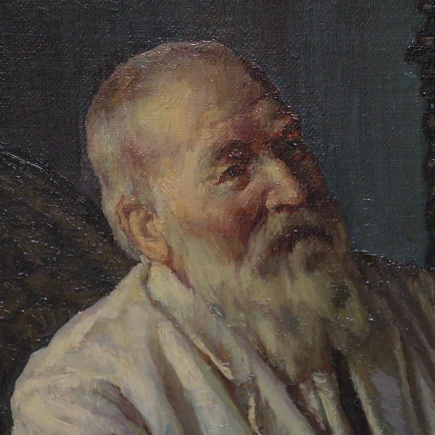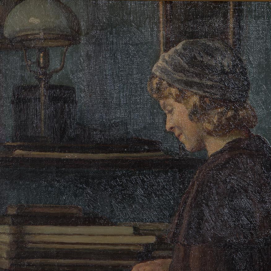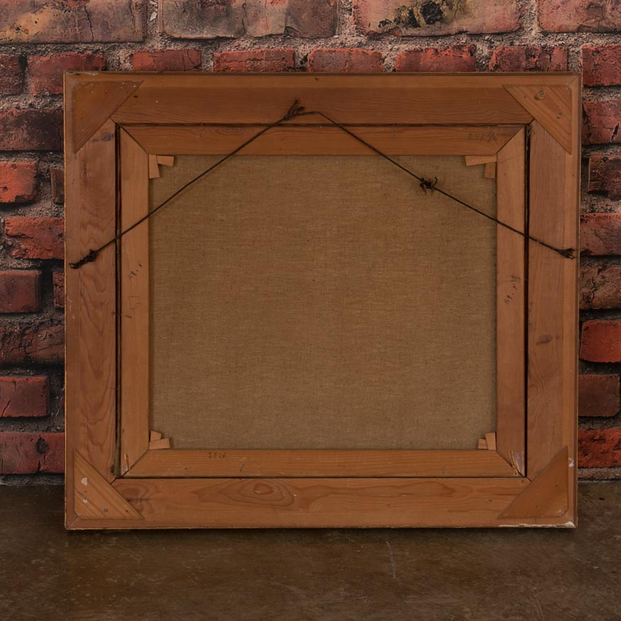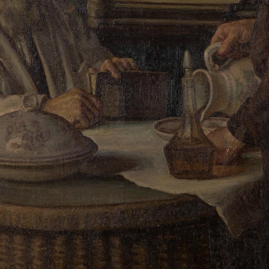 This early 20th century genre scene of a father and daughter in a well furnished period dining room has wonderful detail and balance. There are slight vertical stretcher marks on the left and right sides, otherwise the canvas is in excellent condition. The painting is signed in the lower left S Vermehren ( Sophus Vermehren 1866-1950) and mounted in a giltwood frame that has just a few minor scrapes.