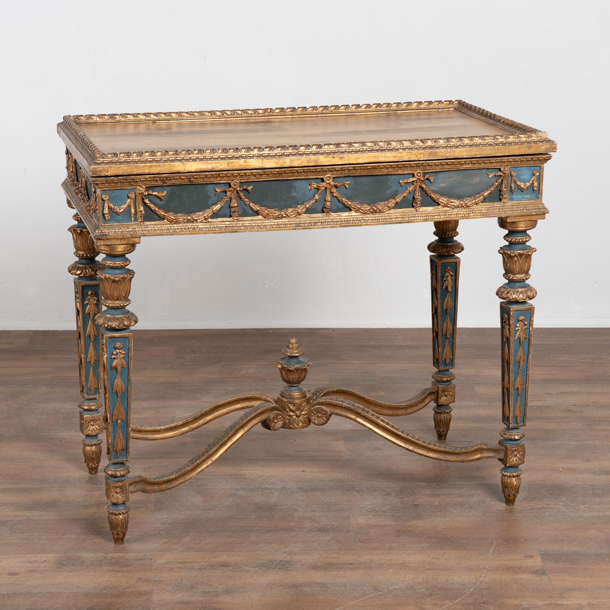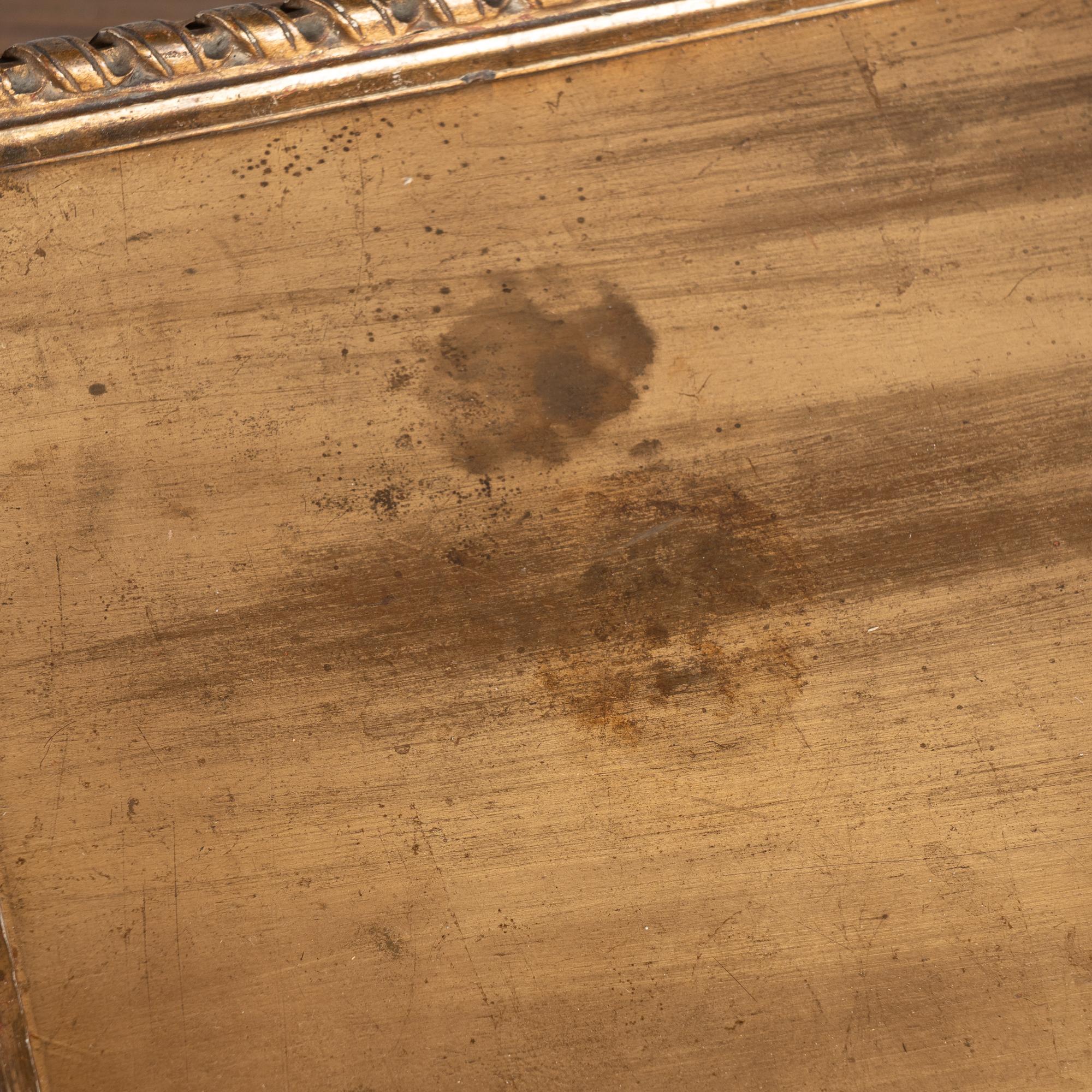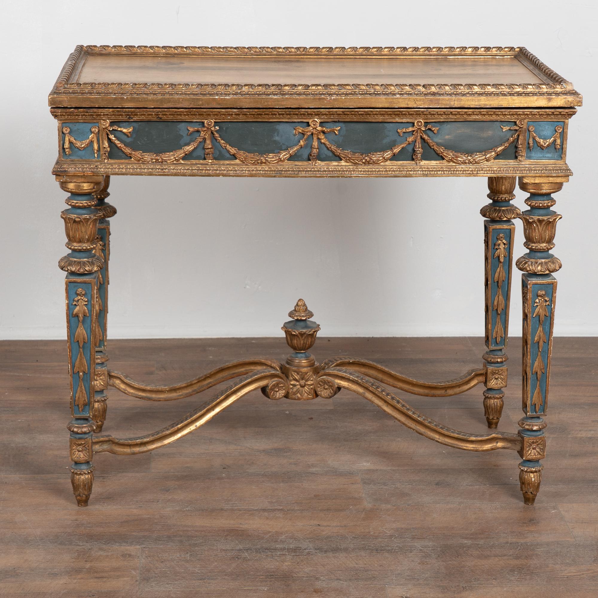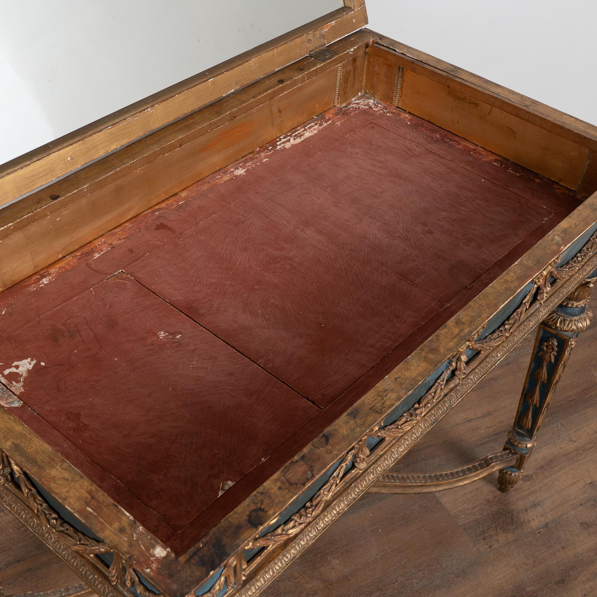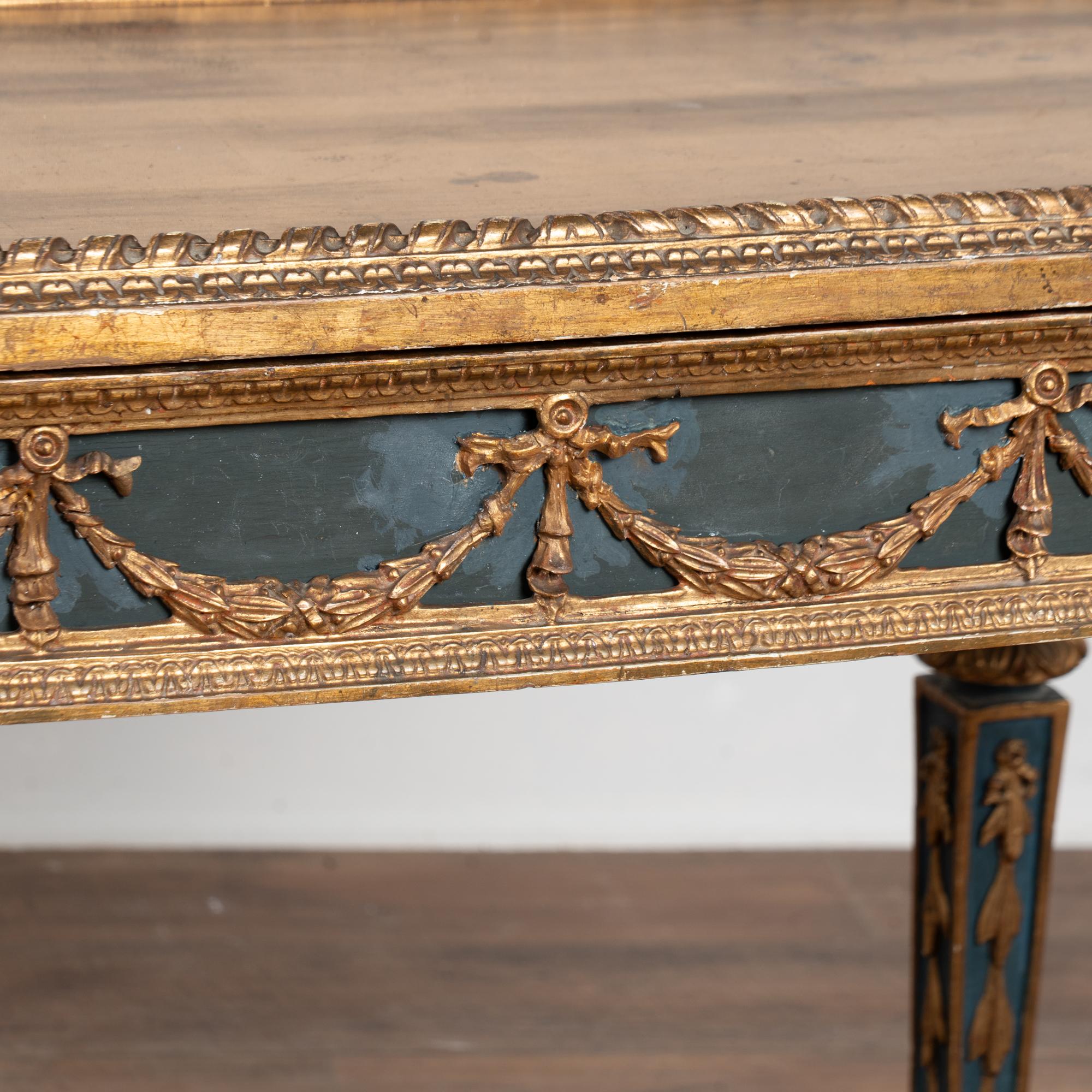Surface wear includes distress to the giltwork, staining, scrapes, scratches, and cracks throughout. The skirt appears to have been repainted or touched up over time(refer to close up photos). Restored, strong, and stable, this table is ready for use and stands as a richly decorative and functional example of Swedish furniture.