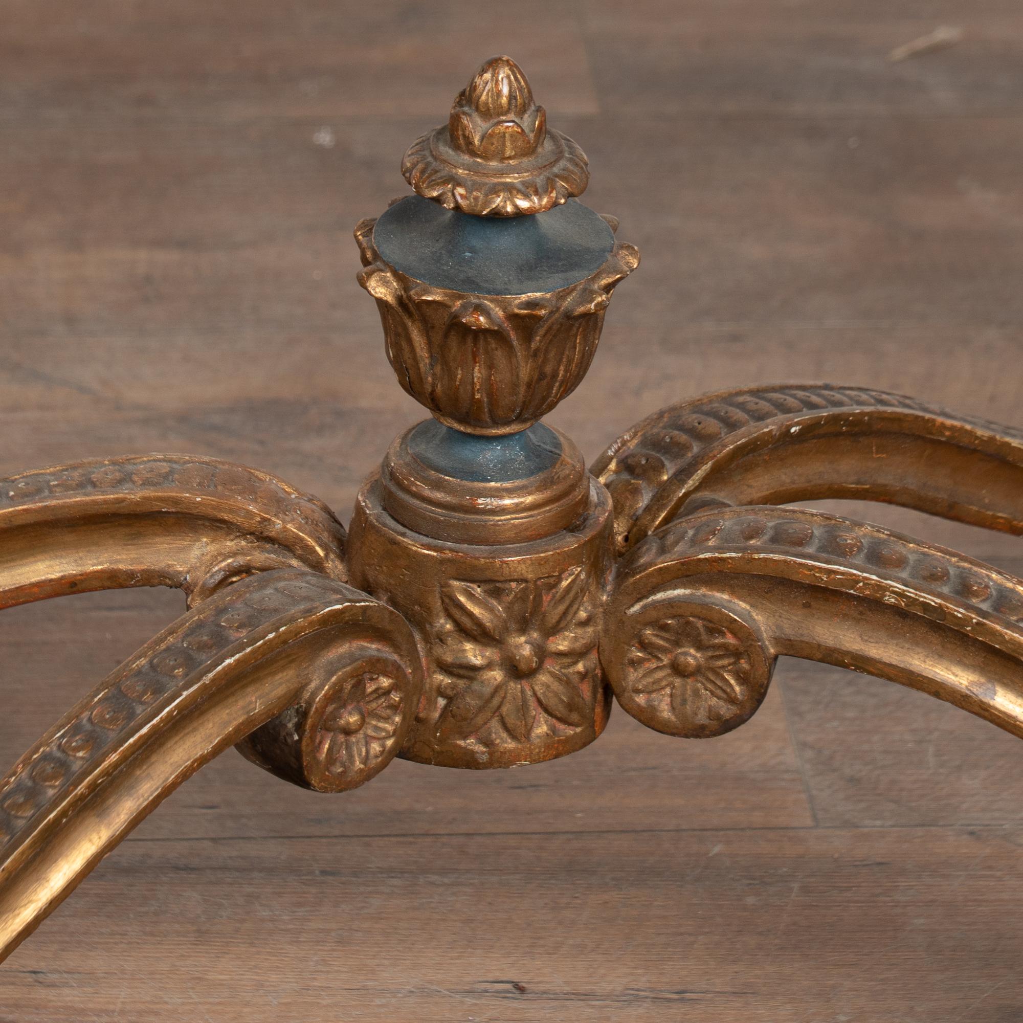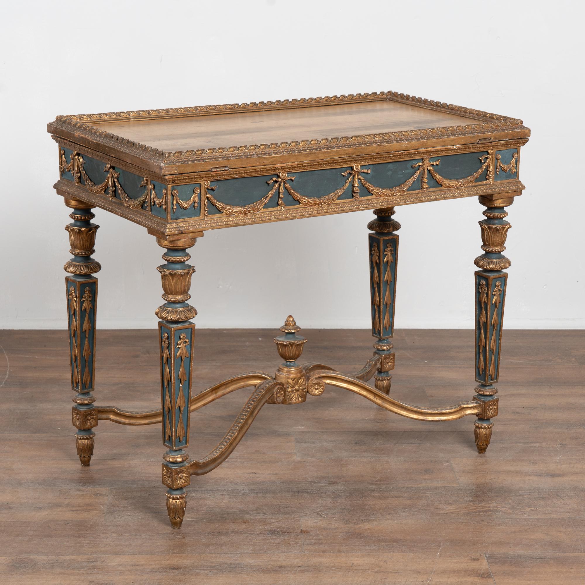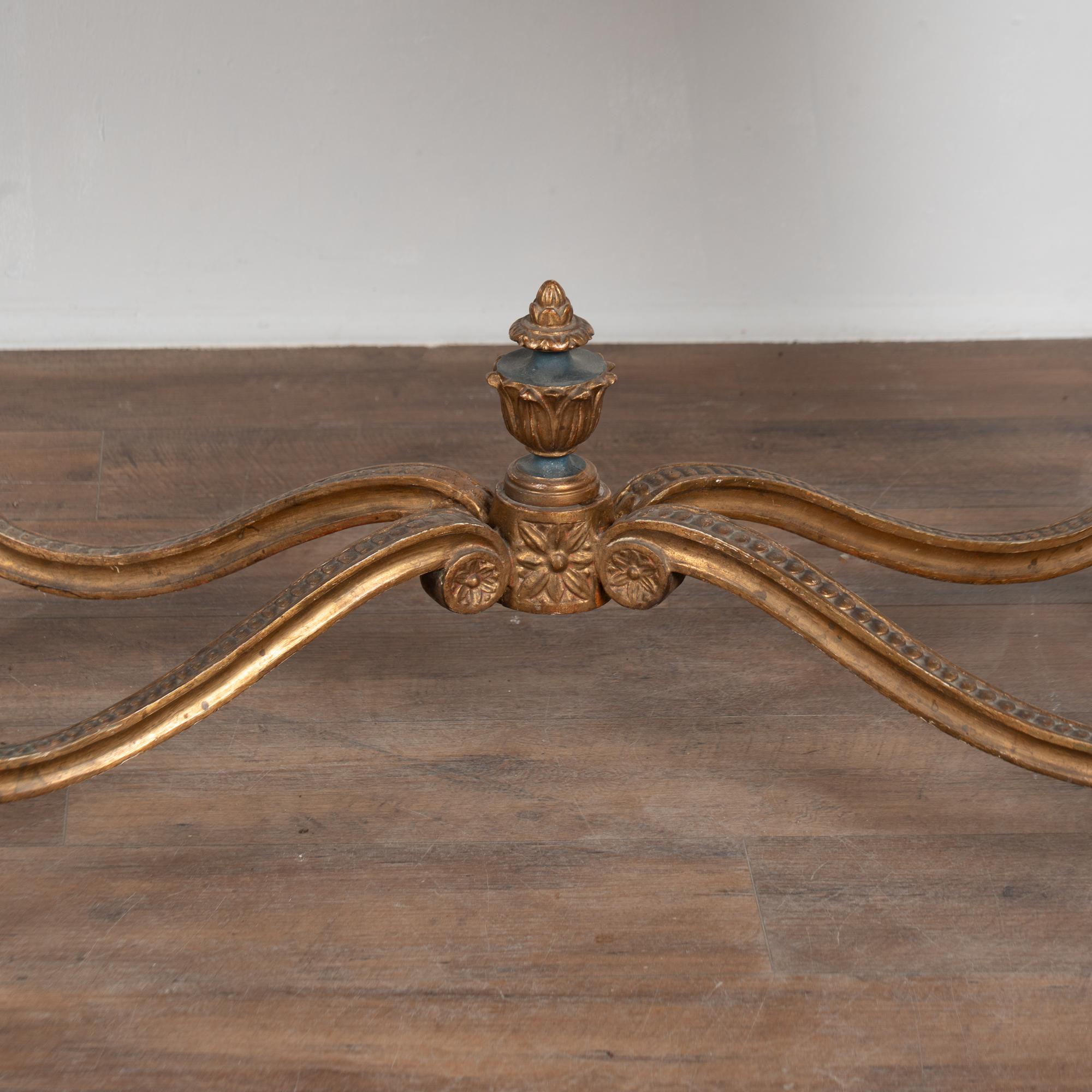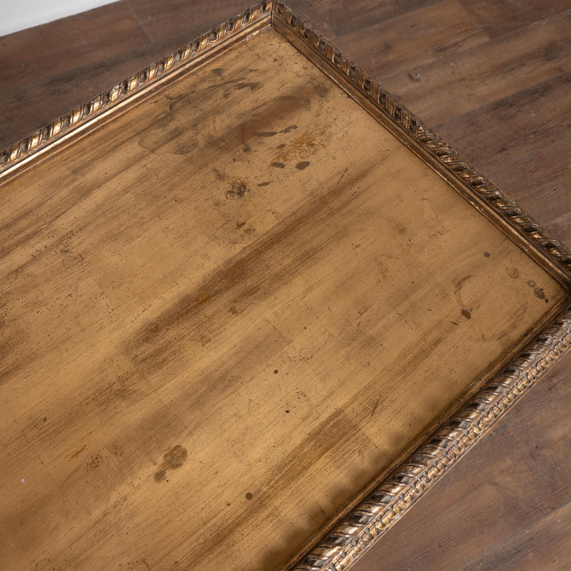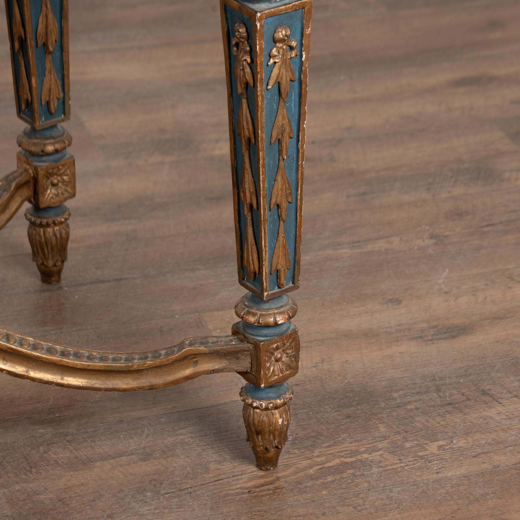 Surface wear includes distress to the giltwork, staining, scrapes, scratches, and cracks throughout. The skirt appears to have been repainted or touched up over time(refer to close up photos). Restored, strong, and stable, this table is ready for use and stands as a richly decorative and functional example of Swedish furniture.