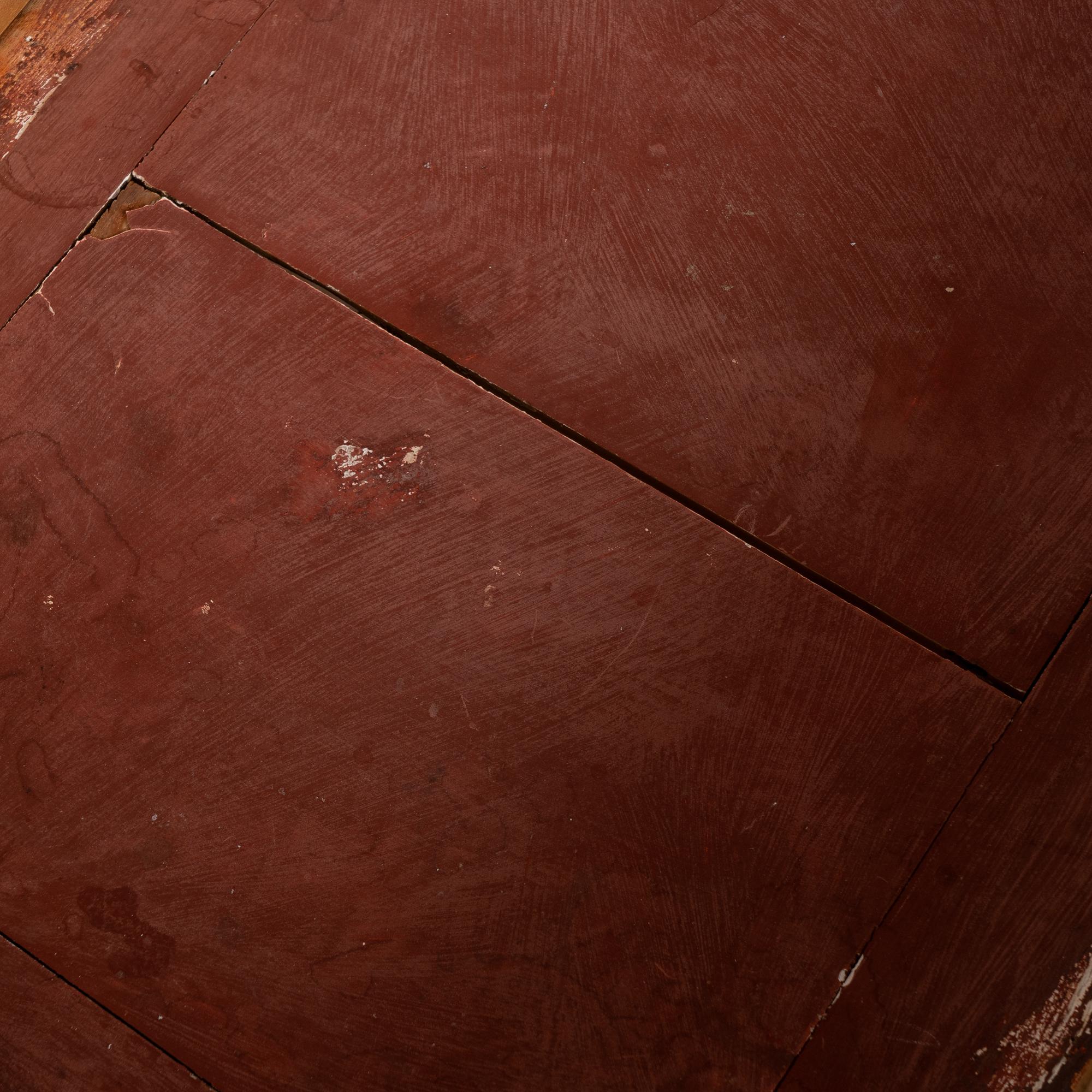 The tabletop lifts and rests on an extending support arm, revealing a mirrored interior and shallow storage cavity approximately 3 inches deep. The interior bottom shows age-related separation and surface wear and retains the distressed burgundy painted finish applied at a later time. This concealed compartment would have served as discreet storage for jewelry or personal items.