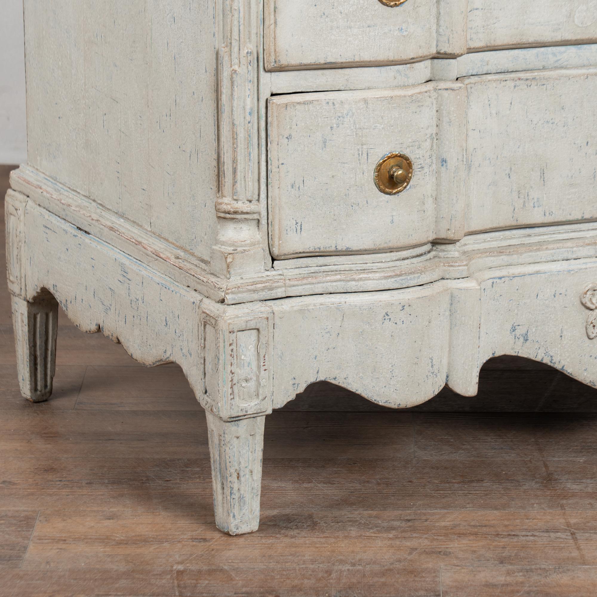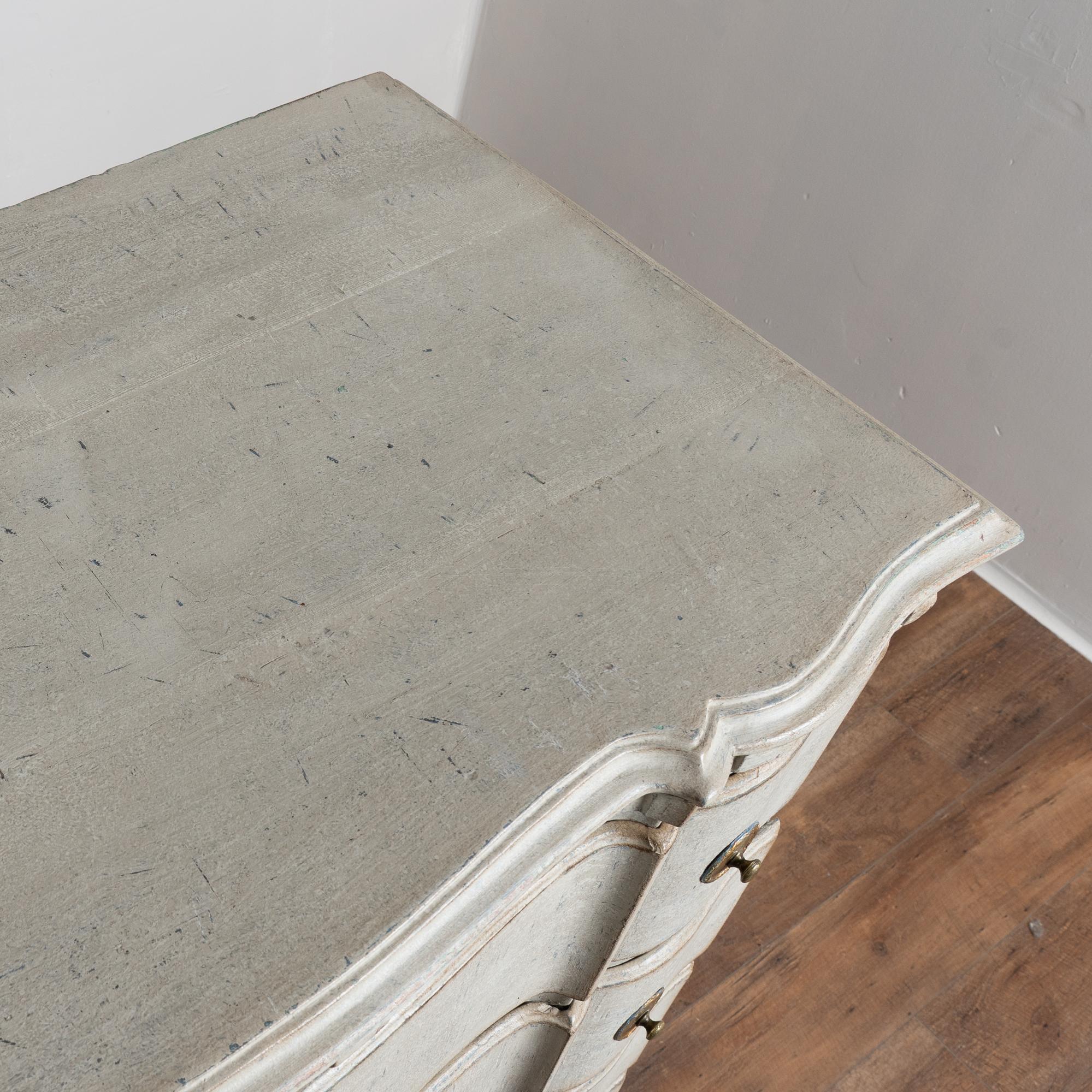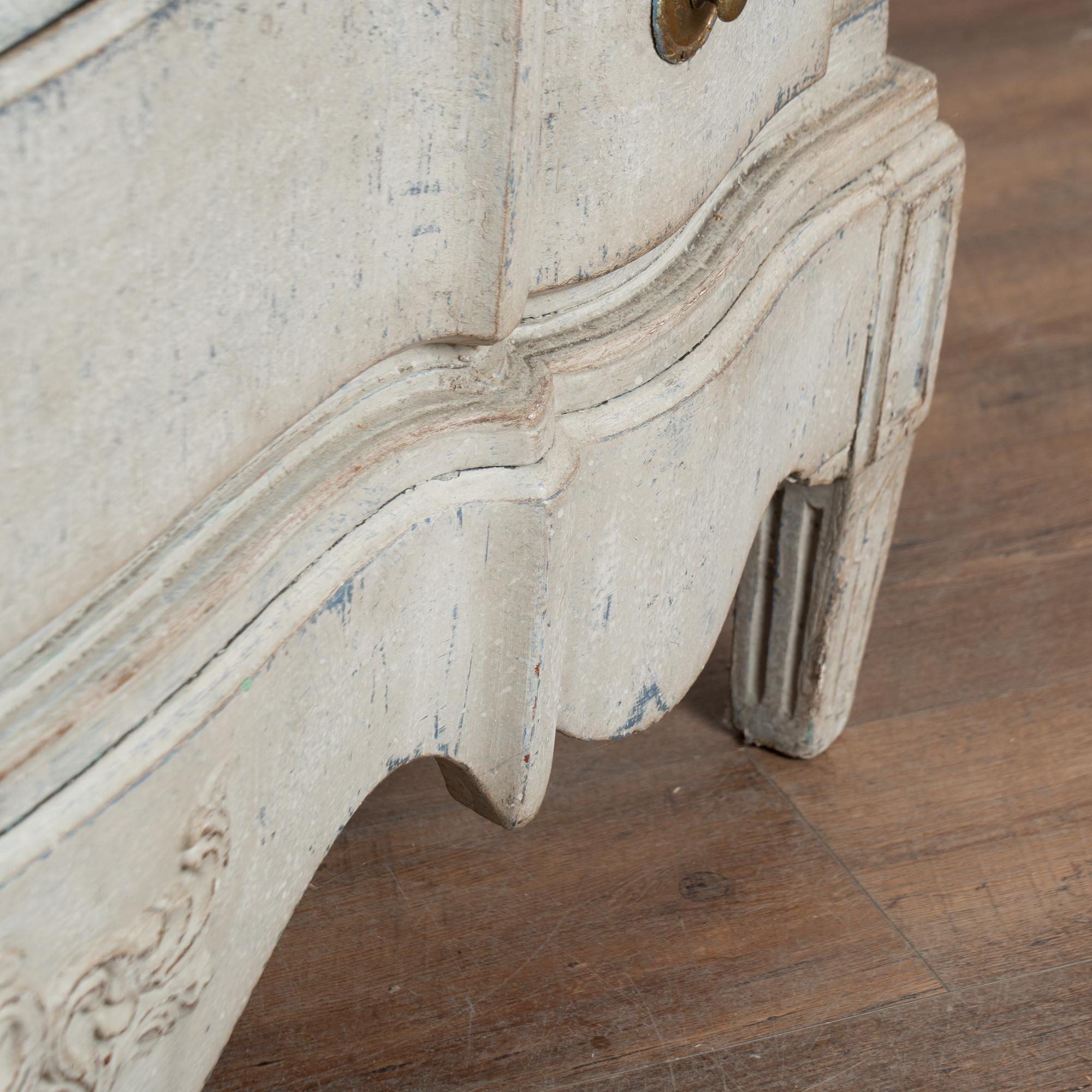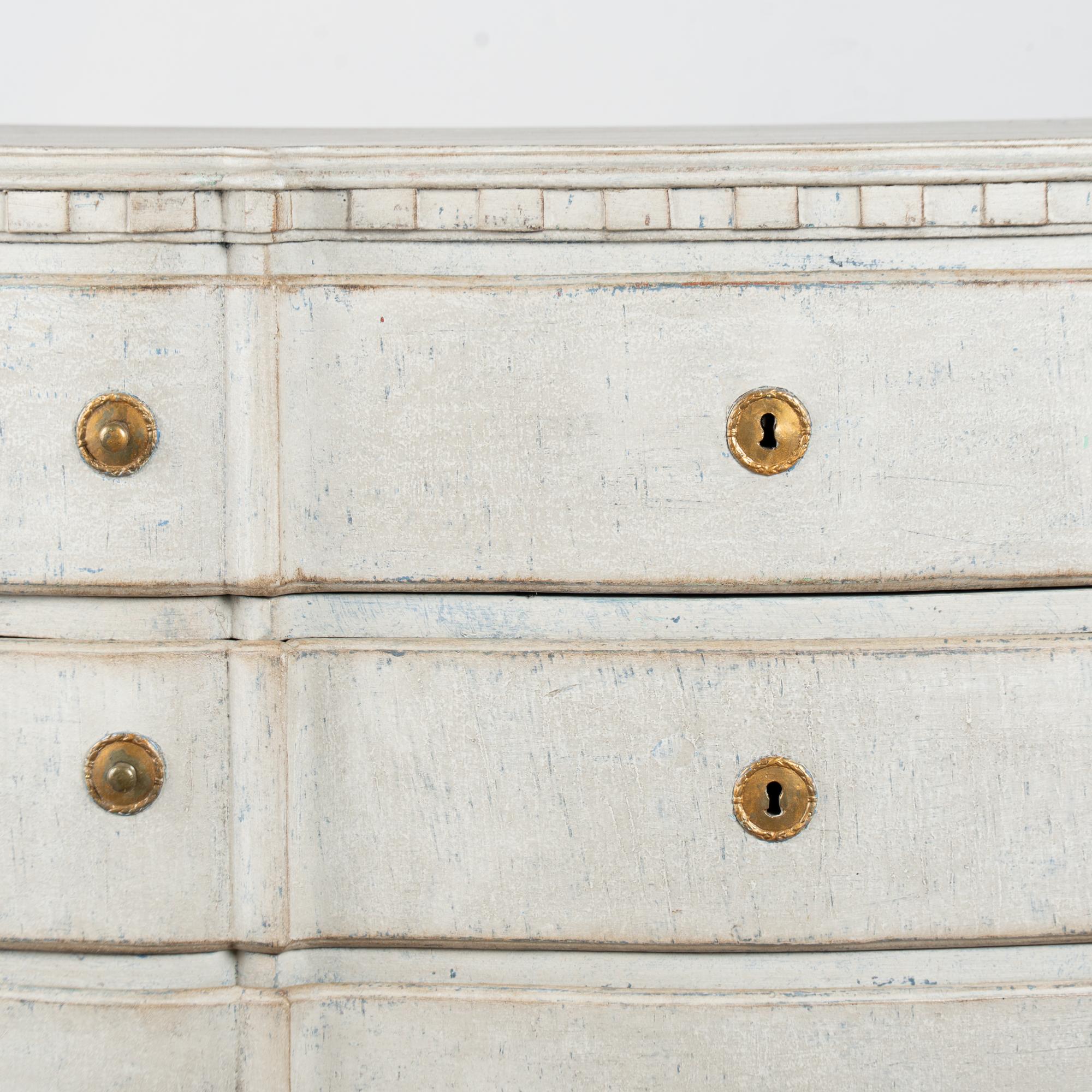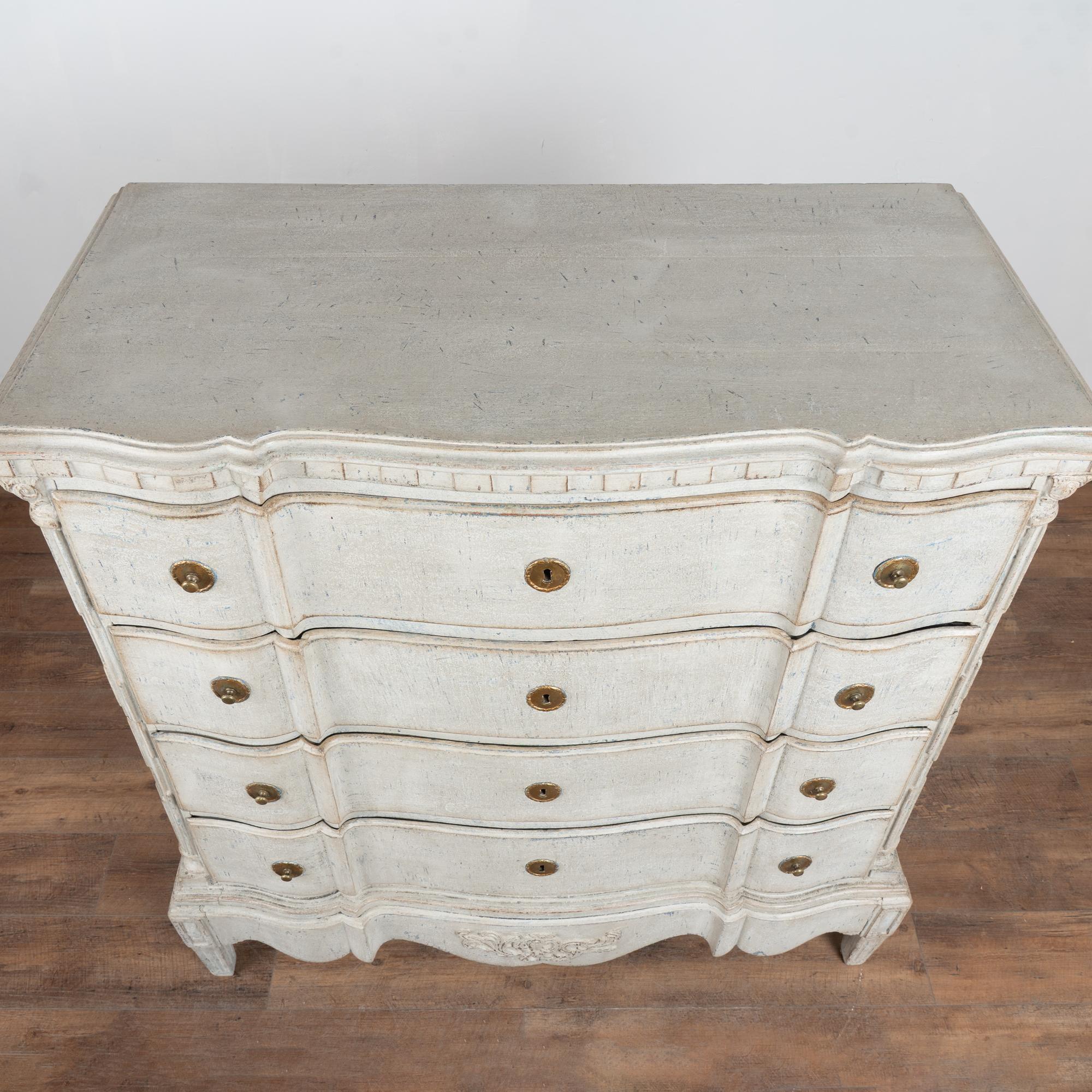 A newer professionally applied layered painted finish presents an overall antique white or light gray appearance with subtle blue undertones, chosen to complement the age, class, and form of the piece. Each drawer opens with two brass pulls; there are no locks or keys.