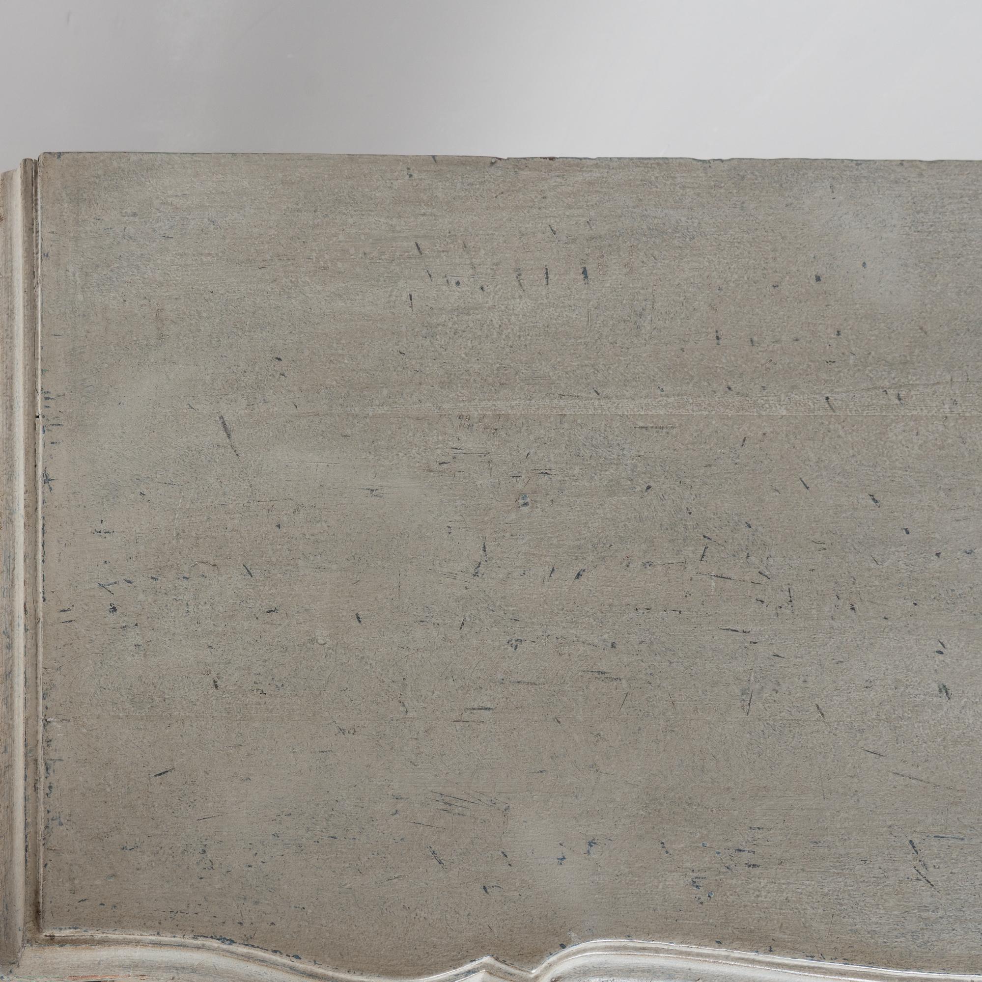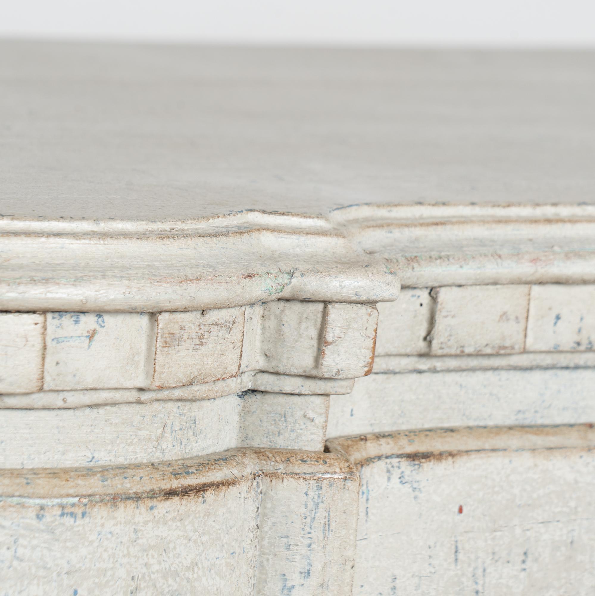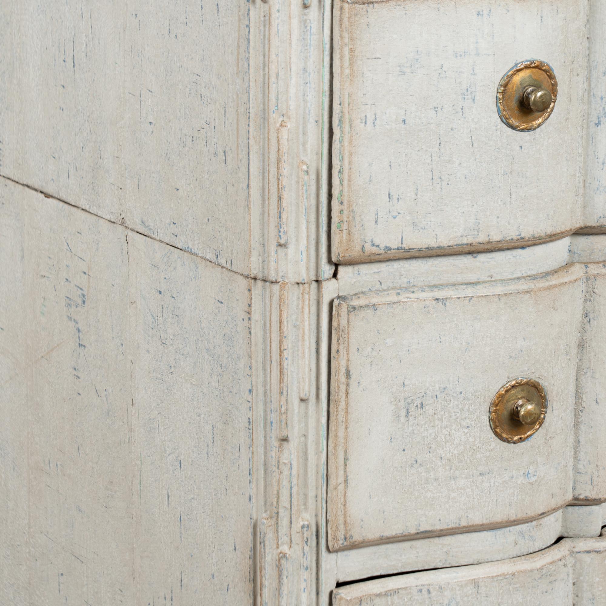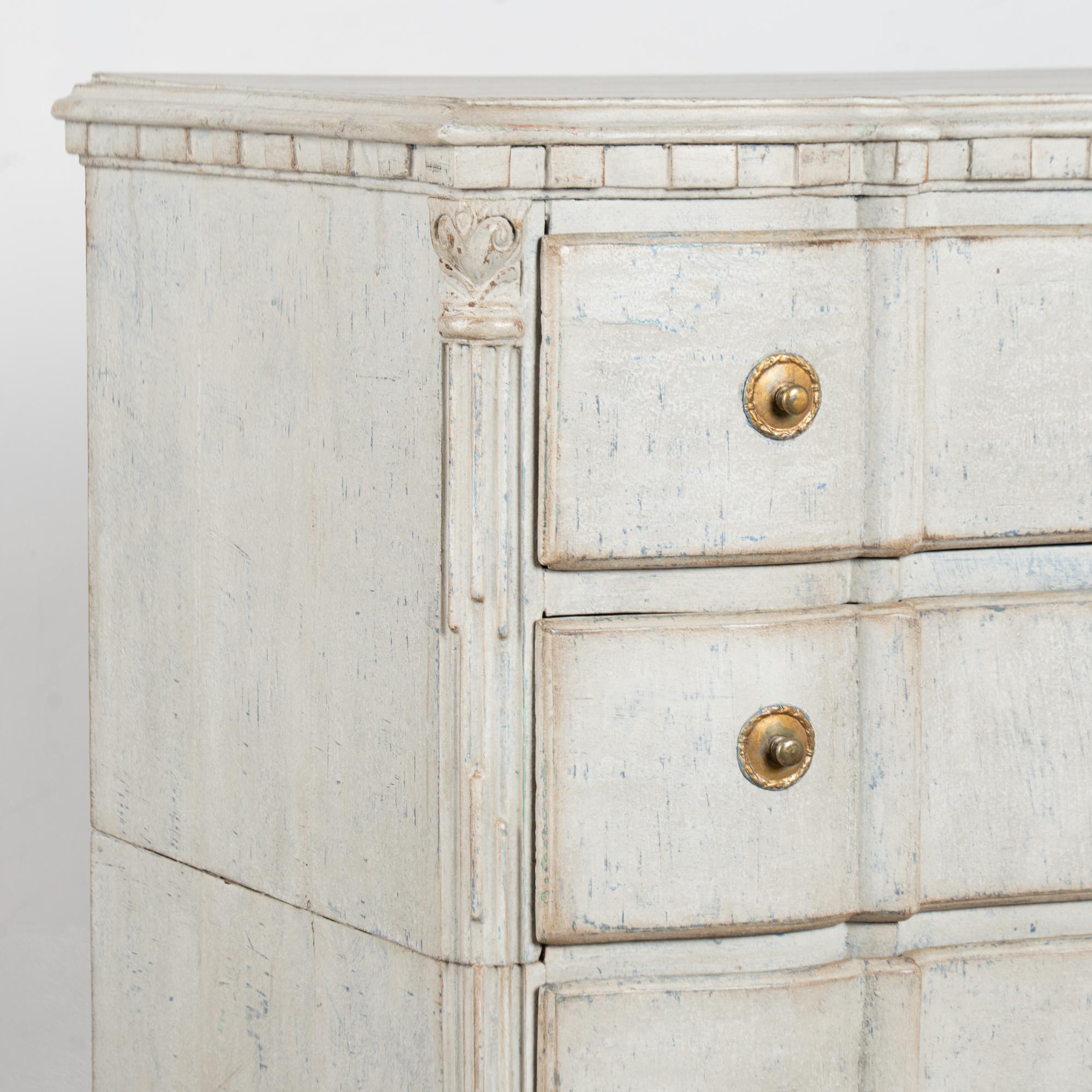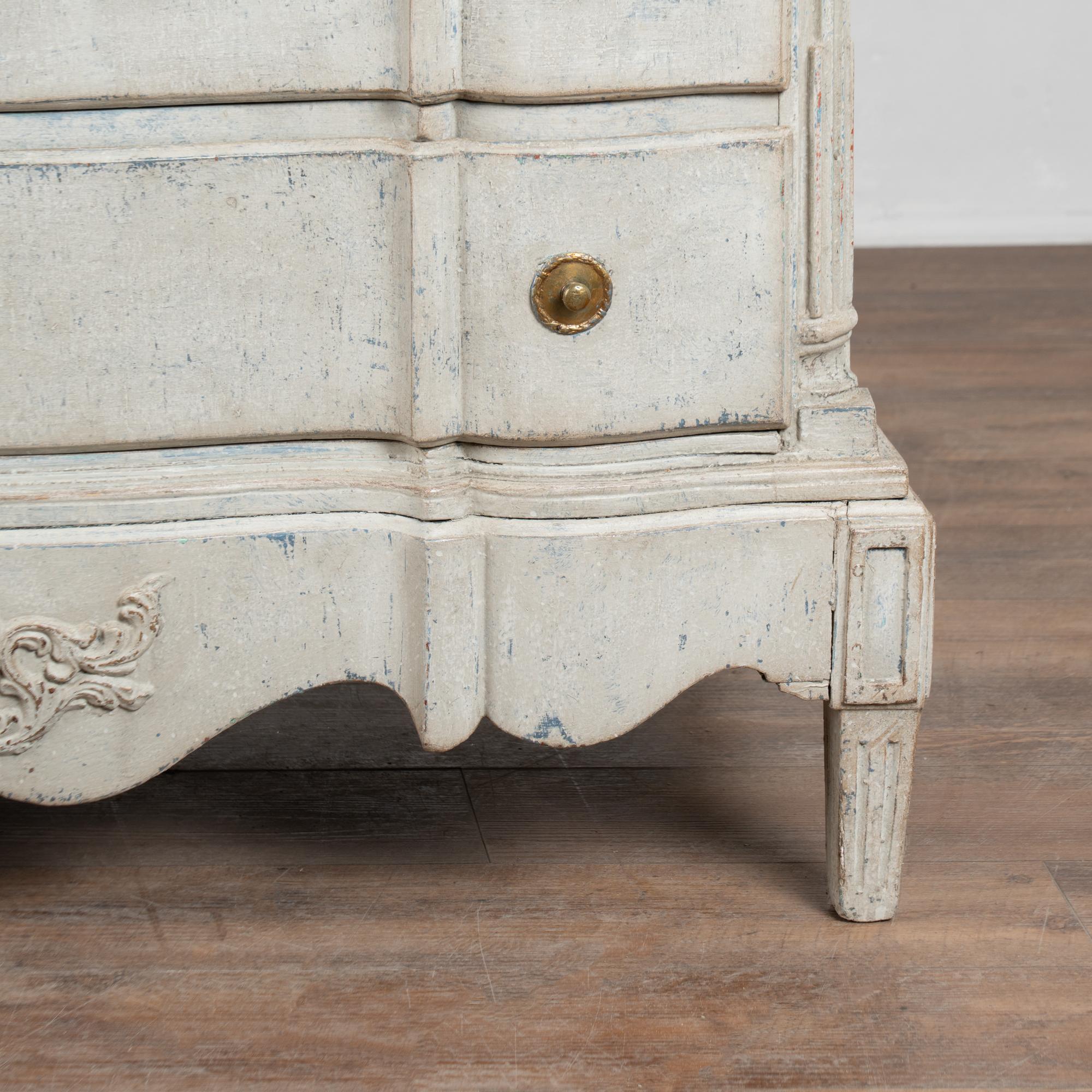 A newer professionally applied layered painted finish presents an overall antique white or light gray appearance with subtle blue undertones, chosen to complement the age, class, and form of the piece. Each drawer opens with two brass pulls; there are no locks or keys.
