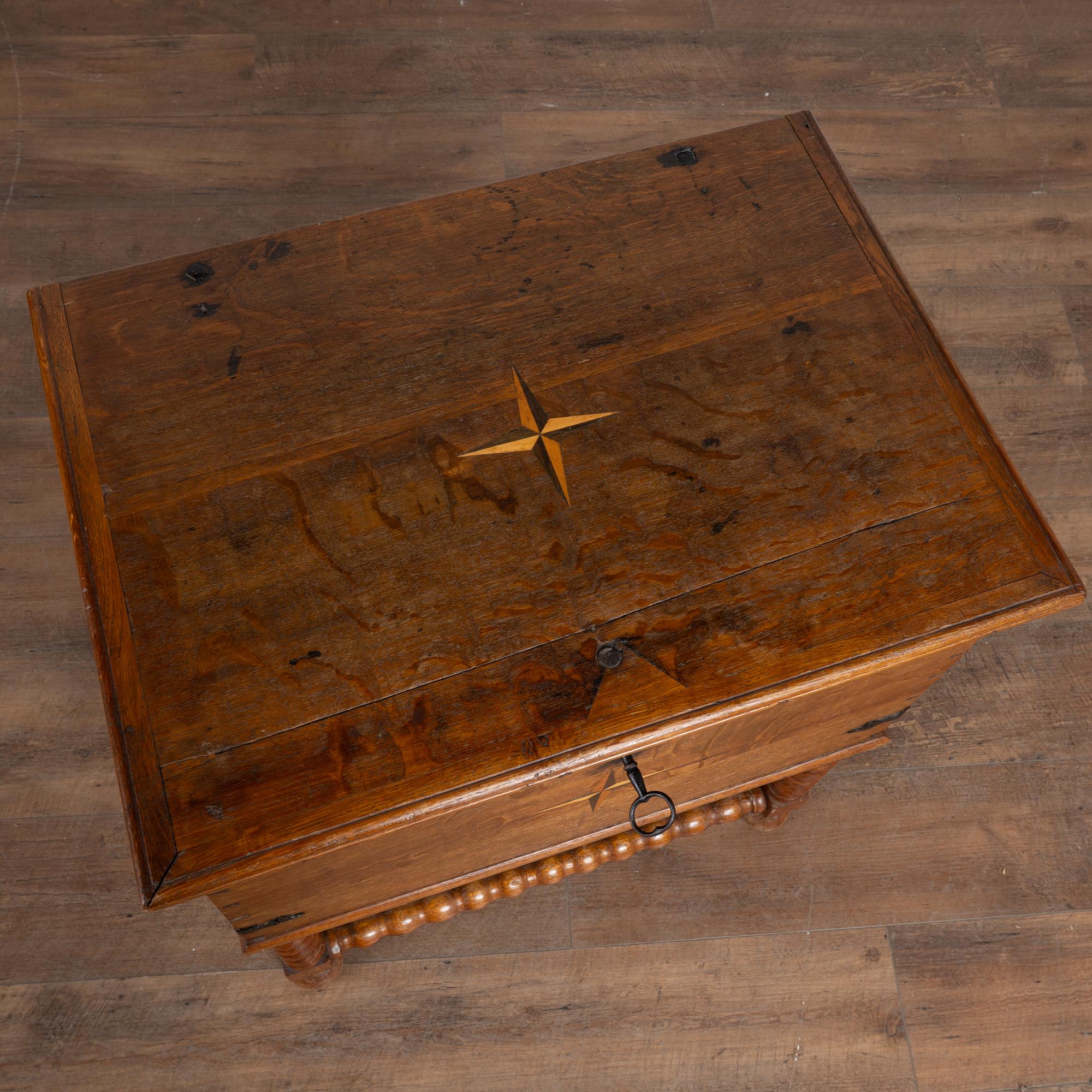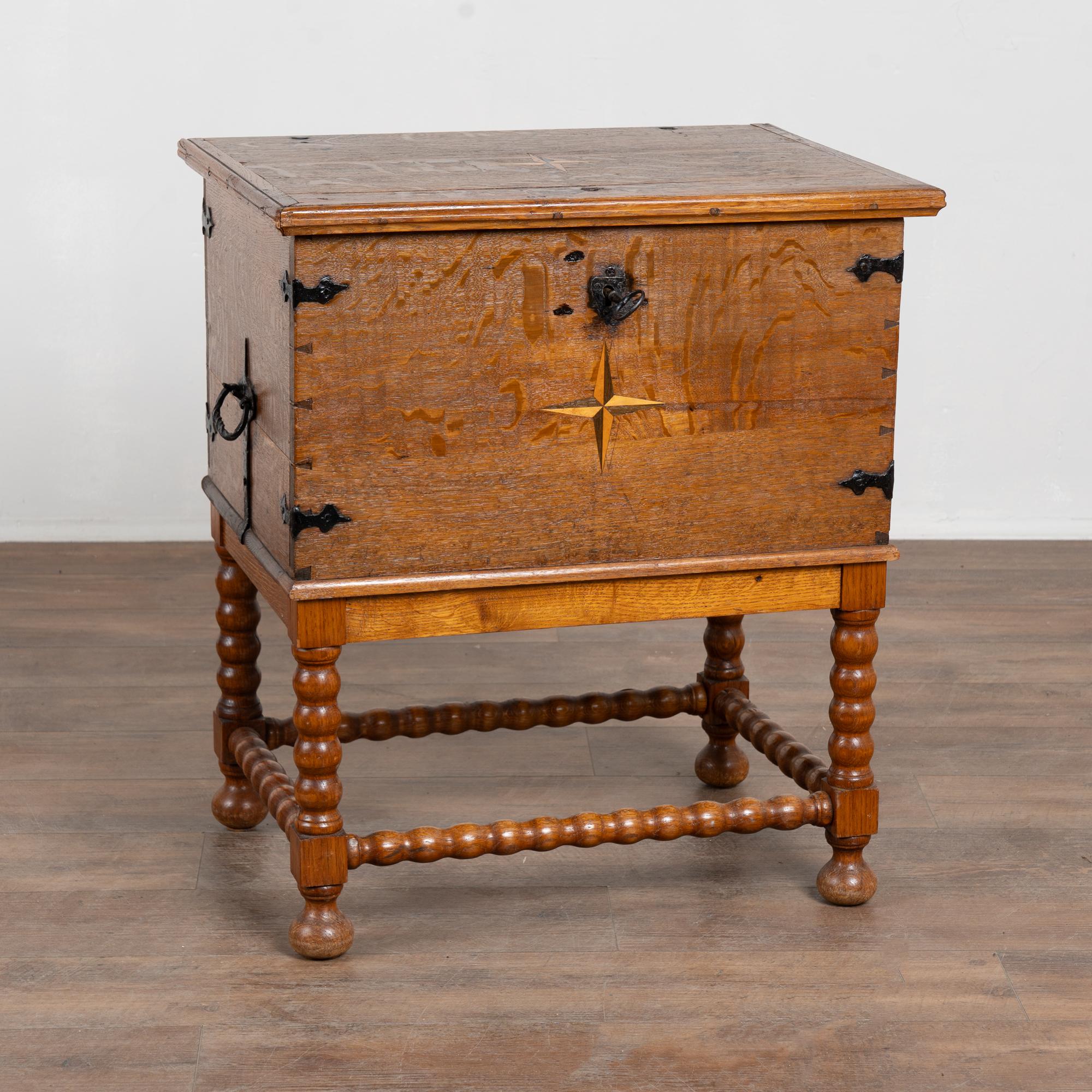 Early 19th-century oak trunk set on a later stand, now serving as a distinctive side table. The trunk features inlaid oak star motifs on both the top and front, complemented by hand-wrought iron corner brackets, side handles, and long iron hinges. The lock and key remain functional.