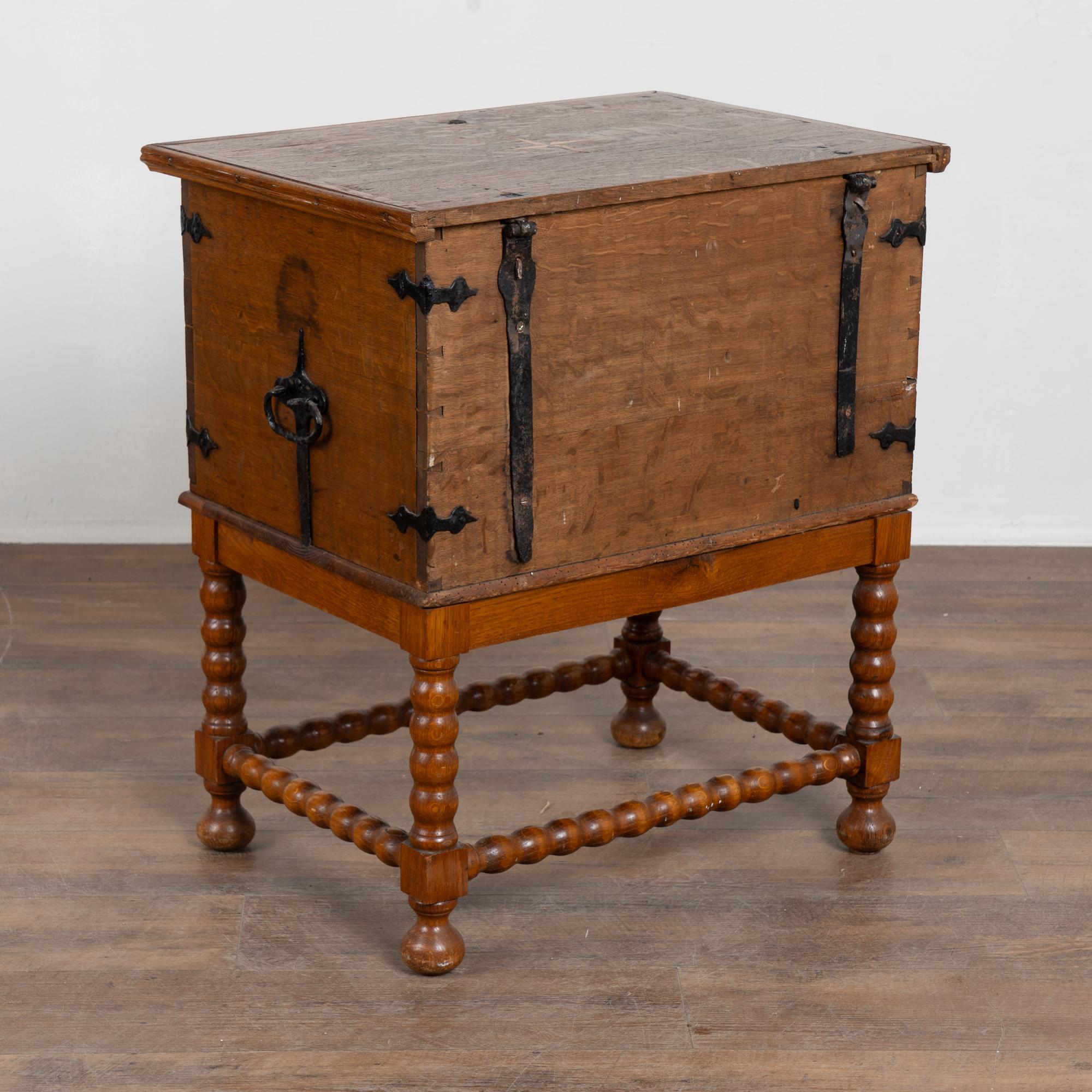 The stand beneath the trunk appears to have been created at a later date to elevate the piece for use as a side table. It features turned legs connected by a stretcher, adding balance and visual interest.