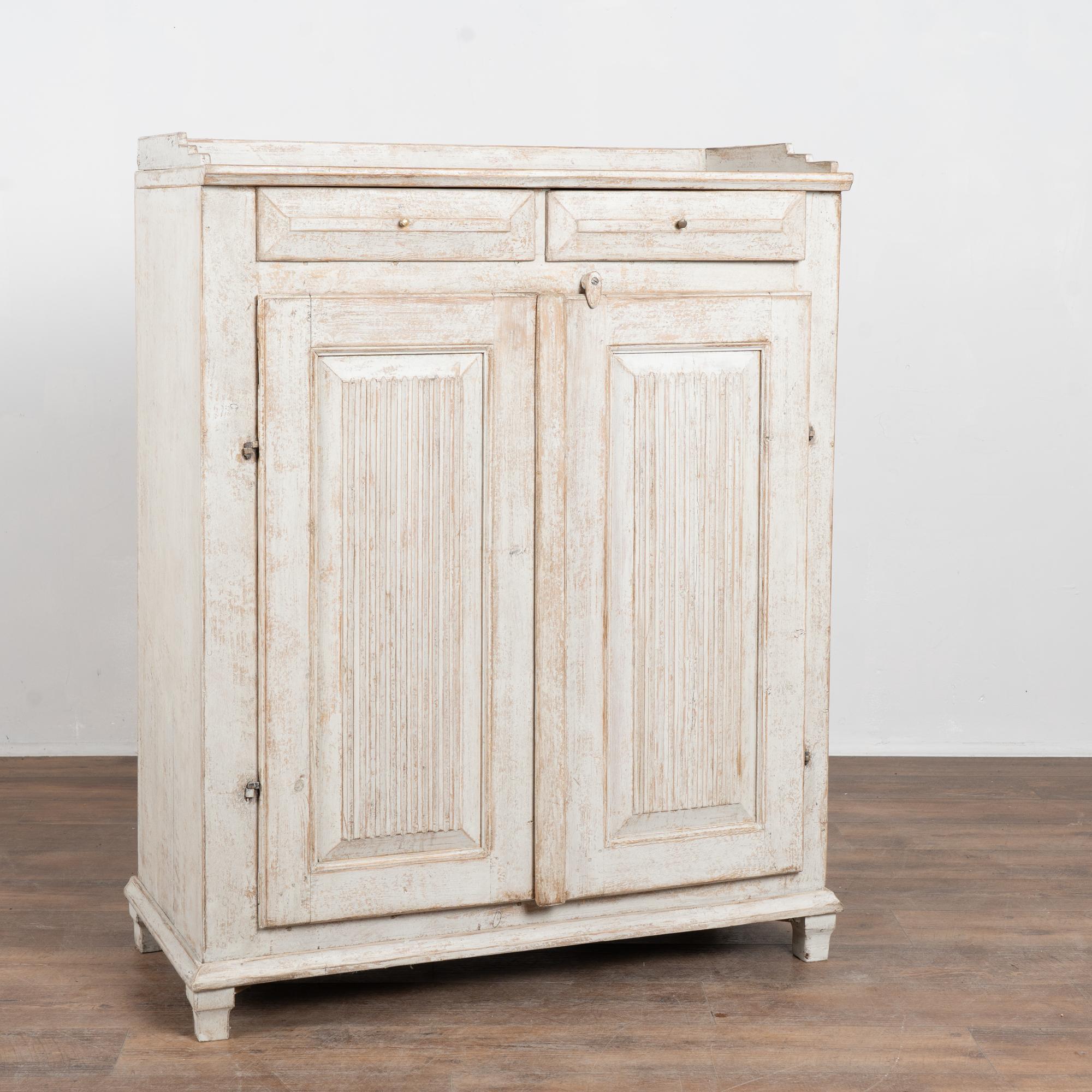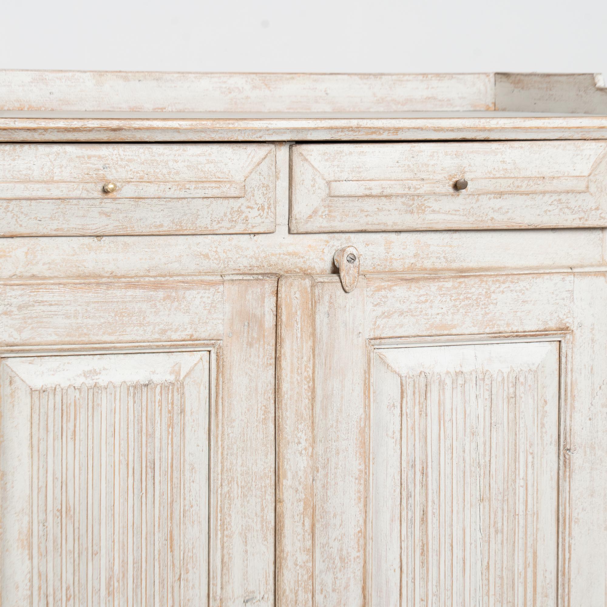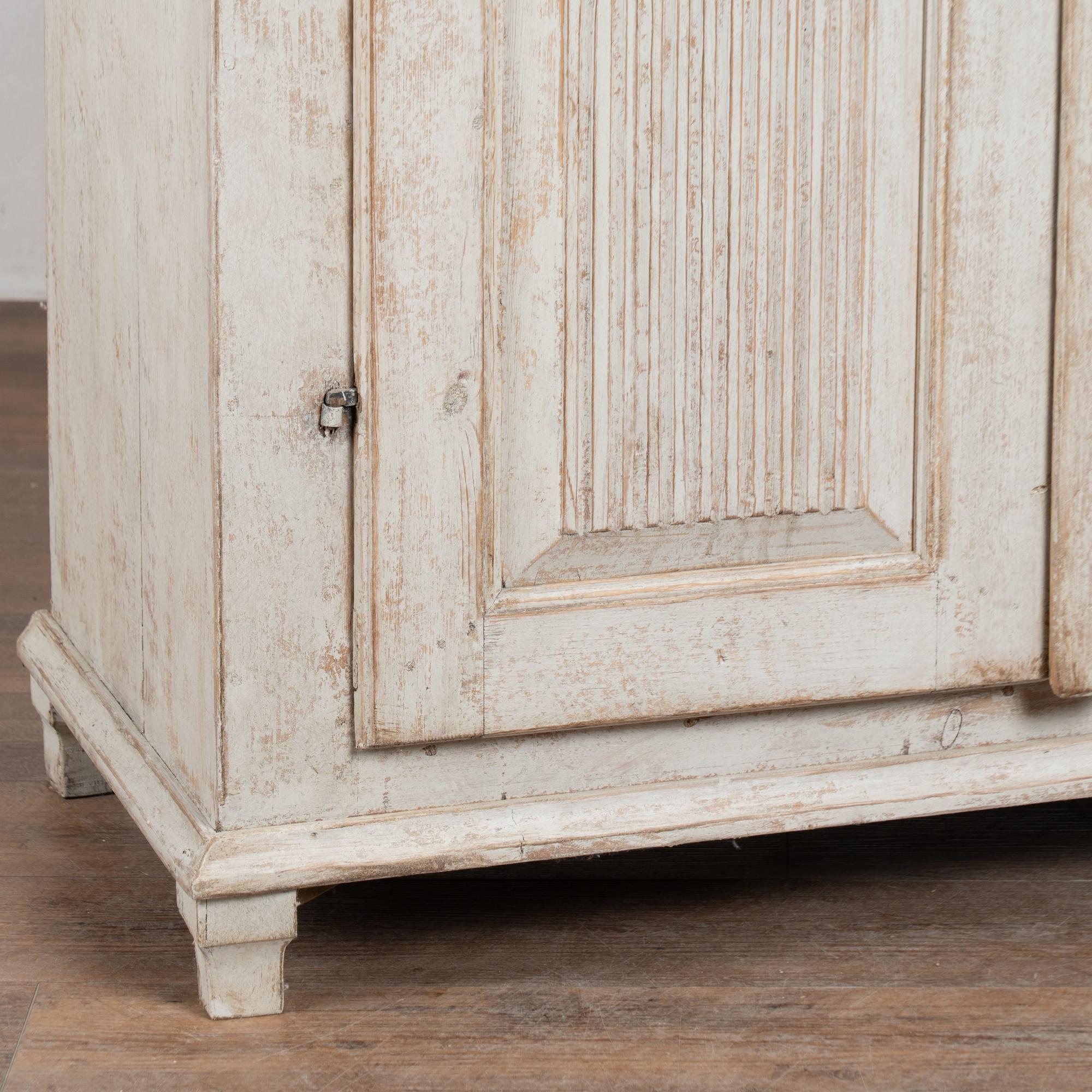 Swedish pine sideboard with fluted panel doors, painted finish in light gray with antique white undertones. The surface has been scraped and distressed, revealing the warm natural pine beneath and enhancing the piece’s aged character. The painted finish is old, but likely not original to the construction from the mid-1800's.