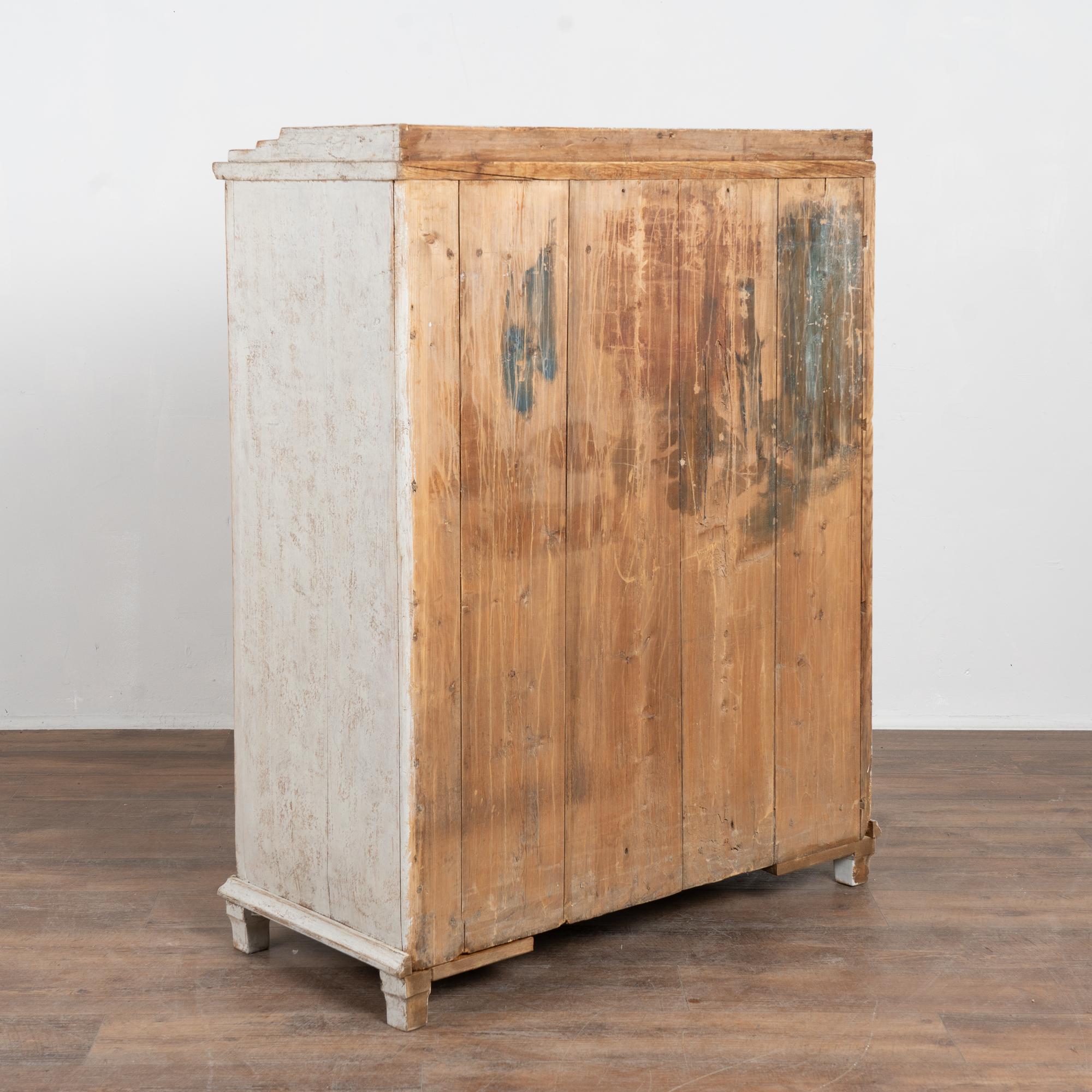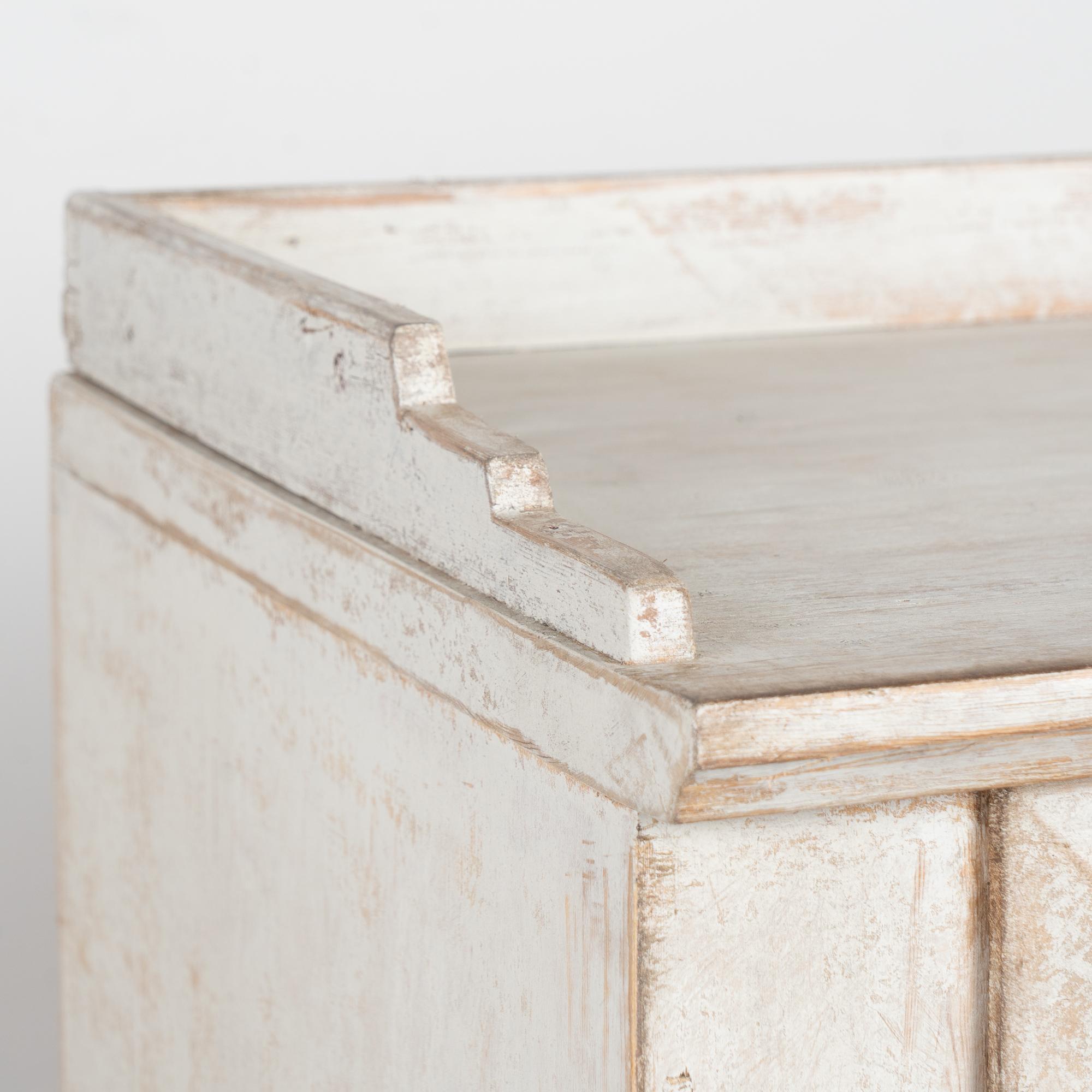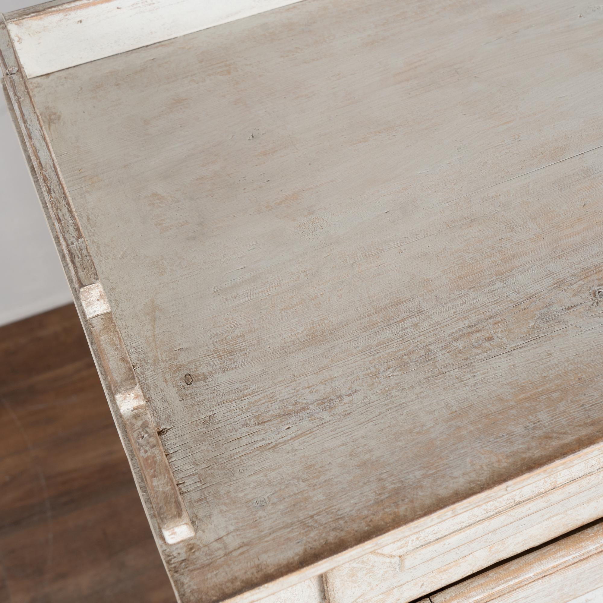 Swedish pine sideboard with fluted panel doors, painted finish in light gray with antique white undertones. The surface has been scraped and distressed, revealing the warm natural pine beneath and enhancing the piece’s aged character. The painted finish is old, but likely not original to the construction from the mid-1800's.