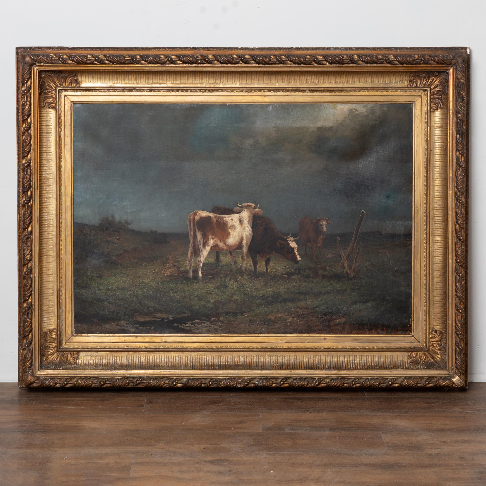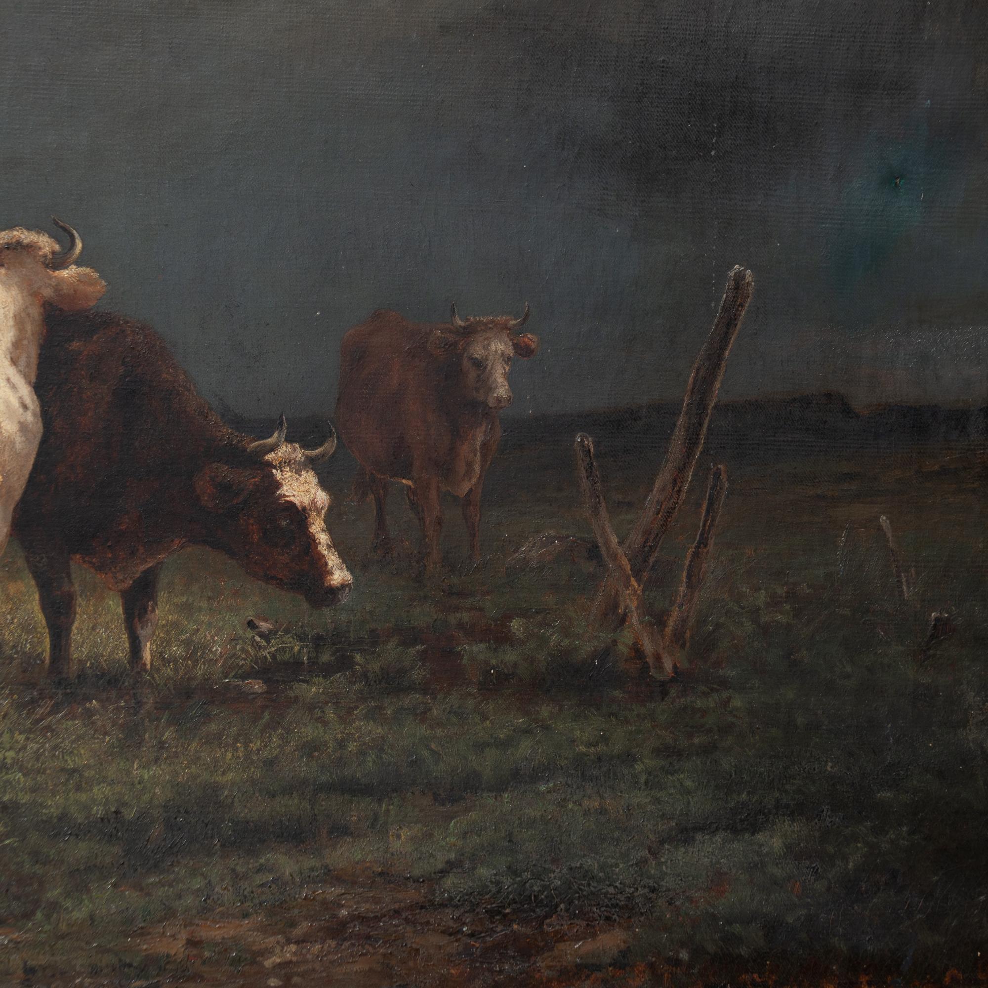 Large original 19th-century Swedish oil on canvas painting depicting three cows set within a moody European landscape. Dark clouds and dramatic skies frame the scene, with sliver of water visible in the foreground, adding depth and atmosphere.