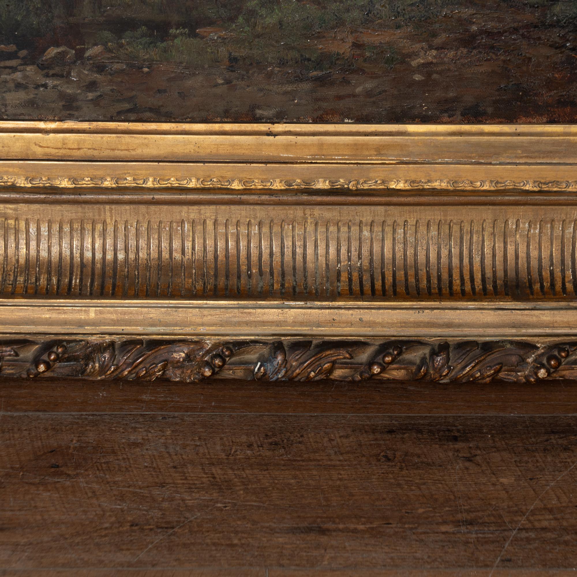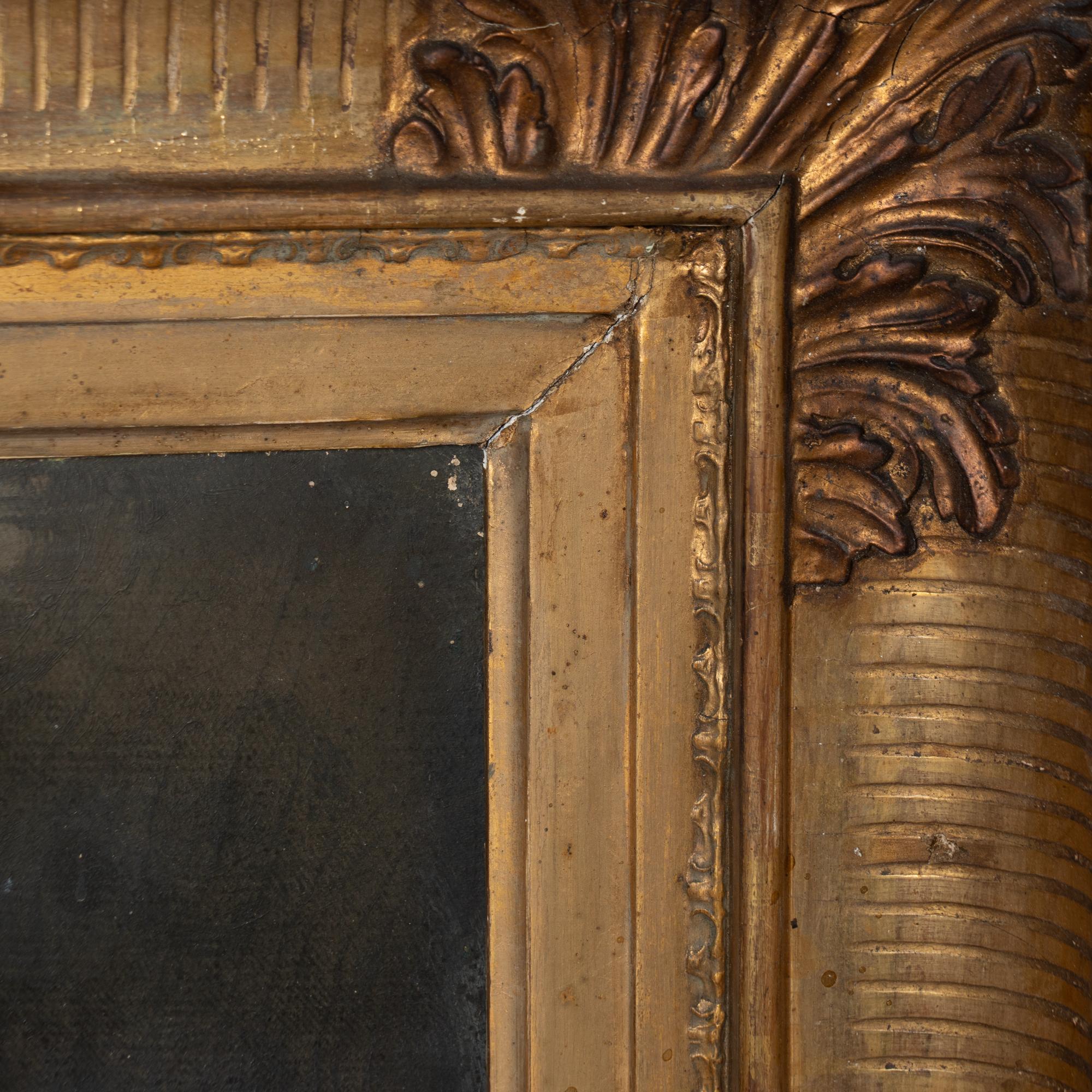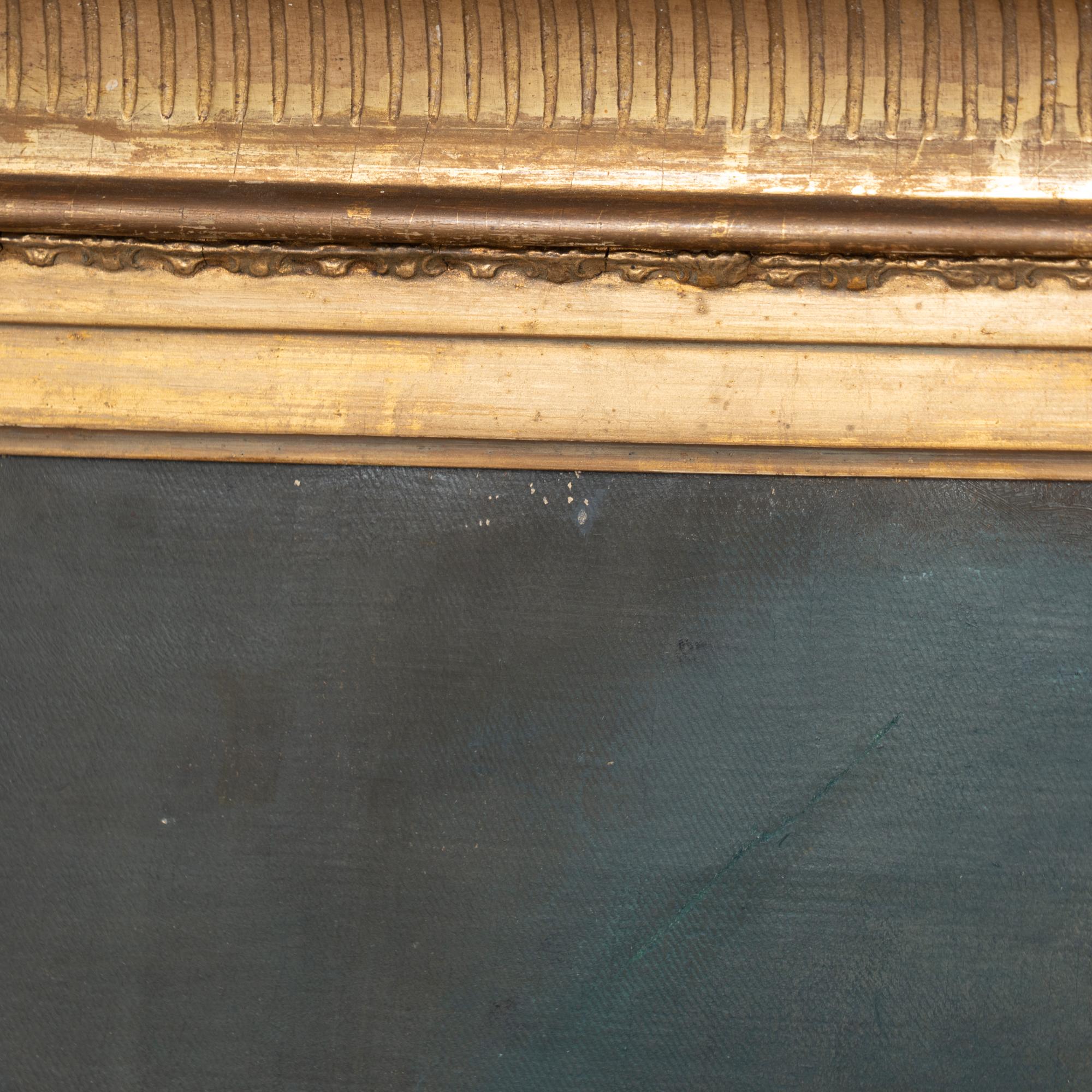 The painting is housed in its original large and ornate carved gold gilt frame, over 5 inches thick, giving this painting strong visual presence. The canvas shows age-related wear including old repairs, scattered scuffs, stains and one puncture. The frame also shows nicks, scuffs, age-related separation and losses, particularly at the corners.