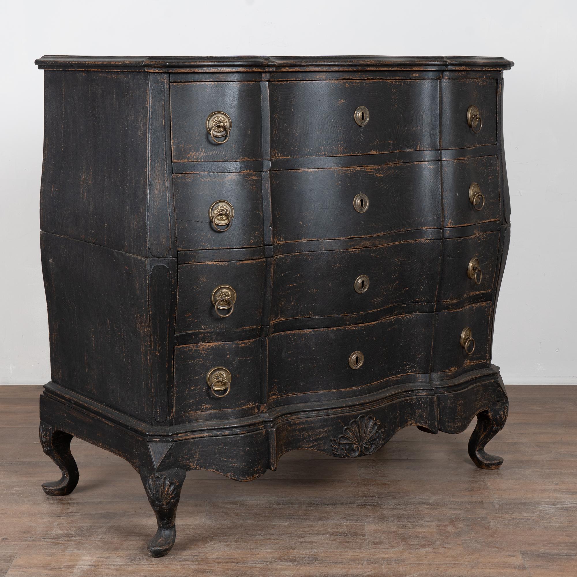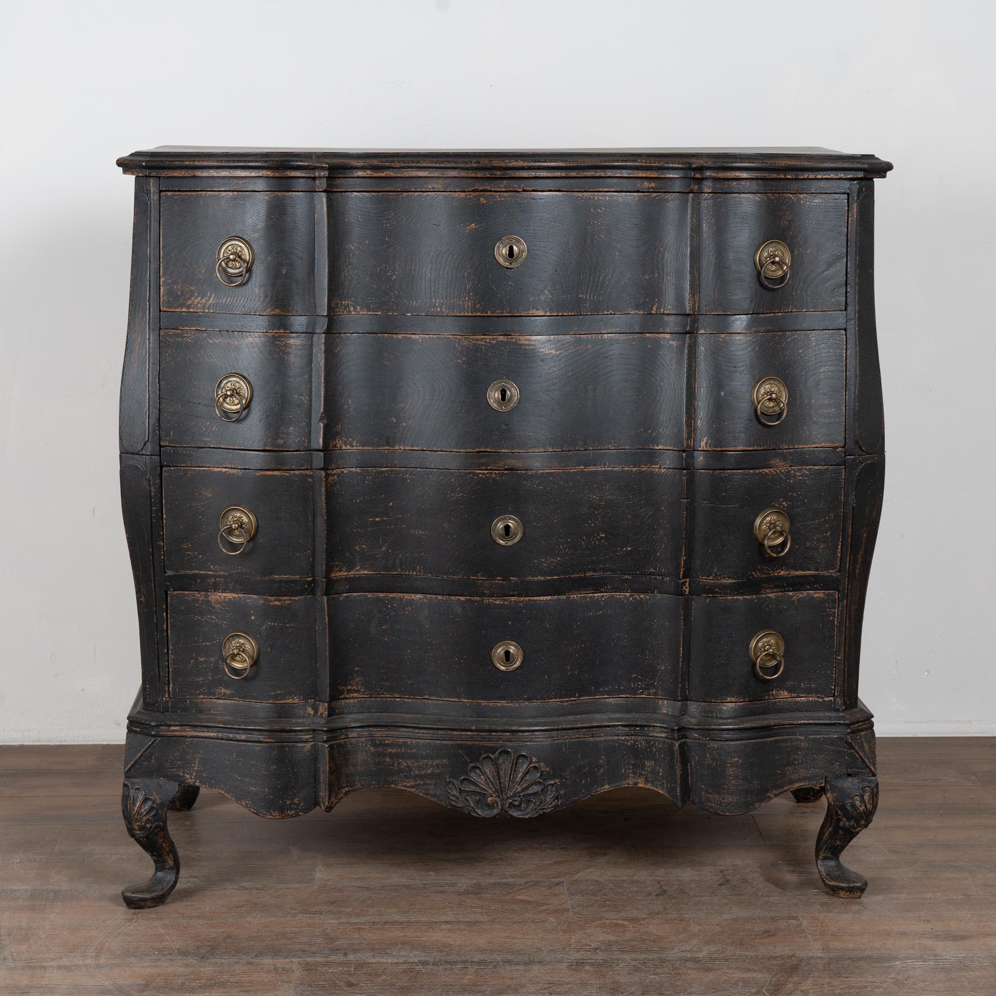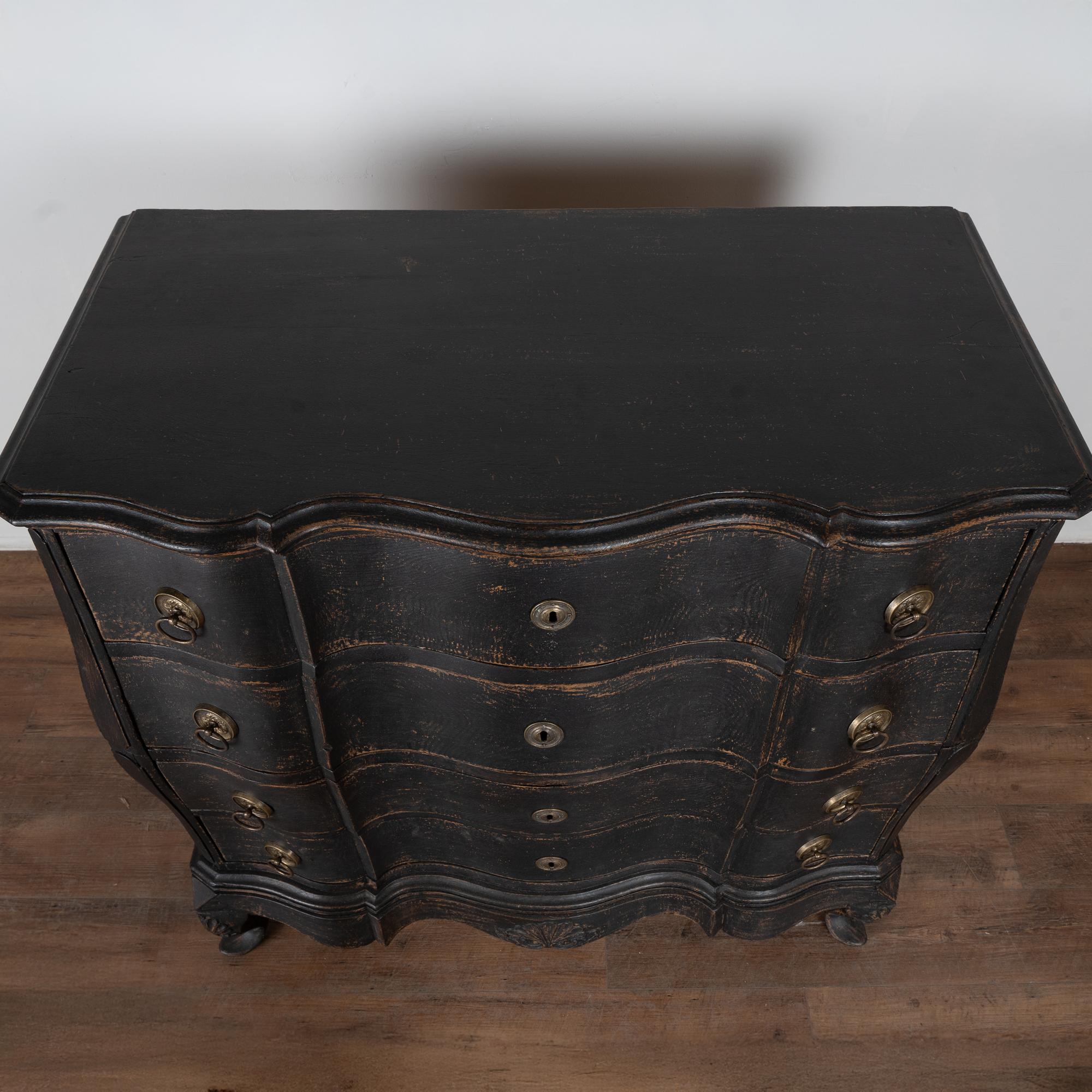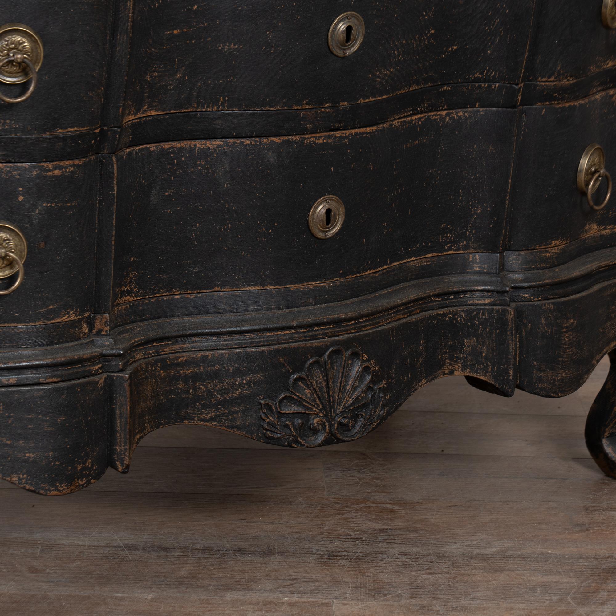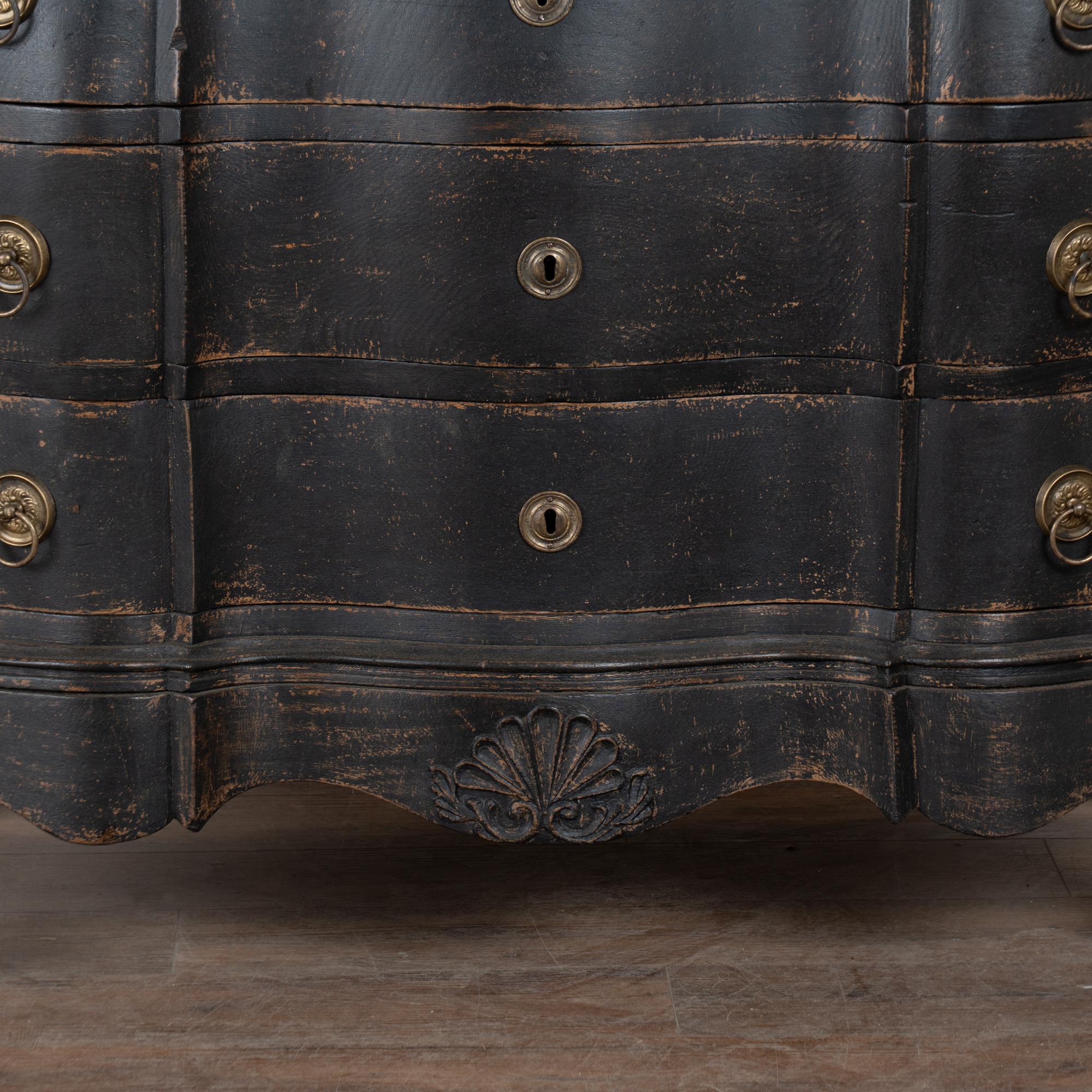 Large 18th-century Danish oak chest of drawers featuring a dramatic rococo serpentine front and substantial proportions. The chest has a newer professionally applied layered black painted finish, lightly distressed to reveal natural oak beneath and suit the aged character of this early piece. It rests on a carved scalloped skirt with curvaceous feet, adding strong visual presence.