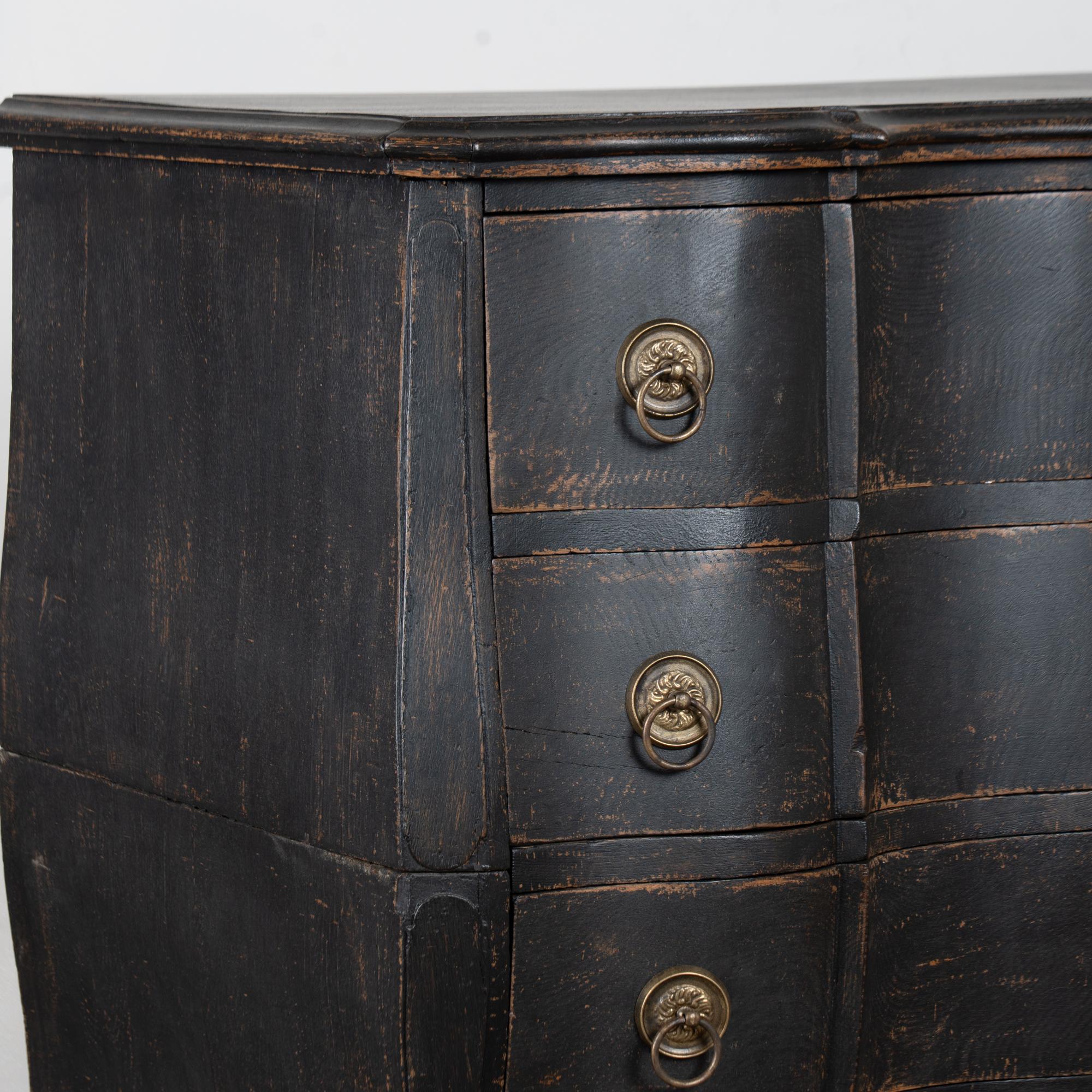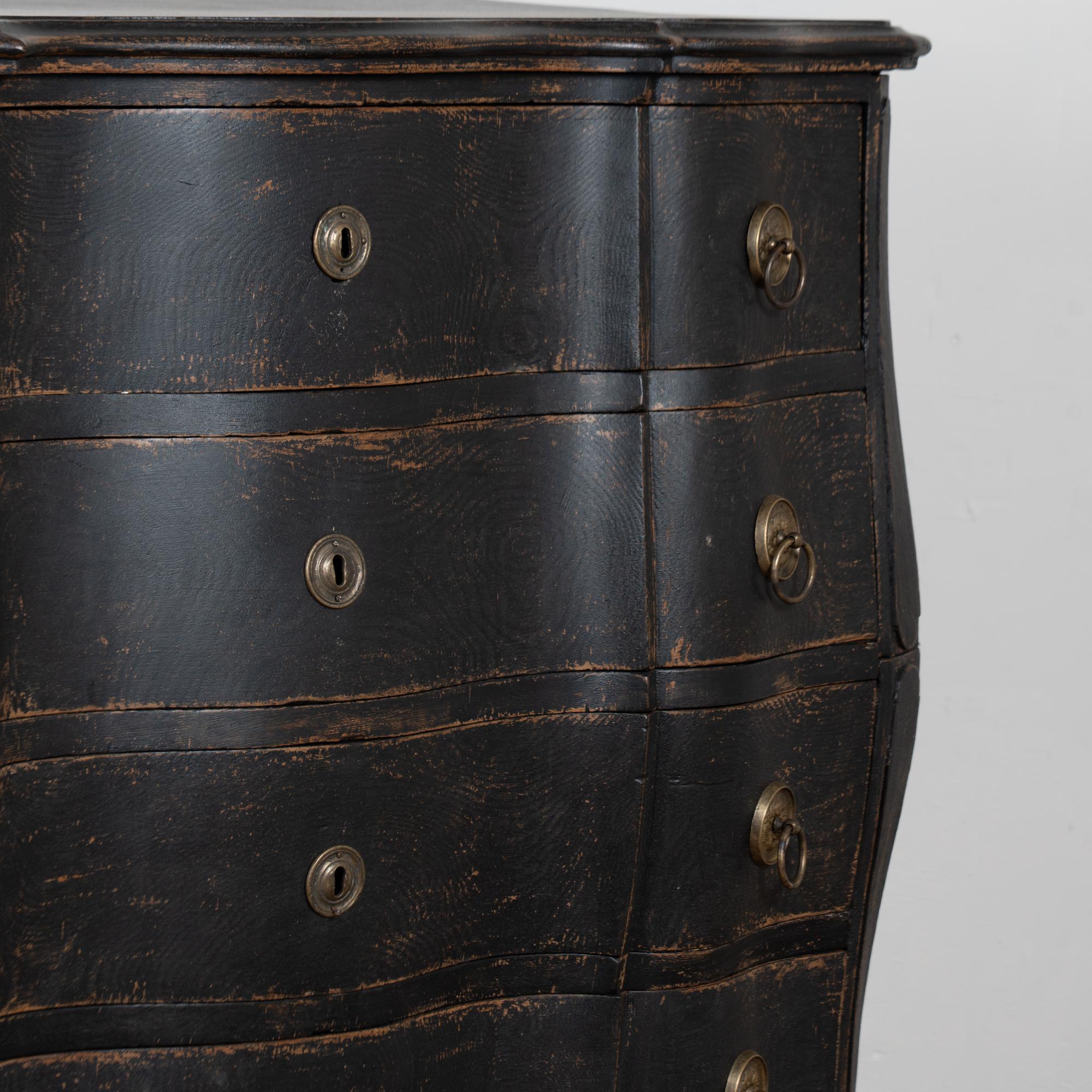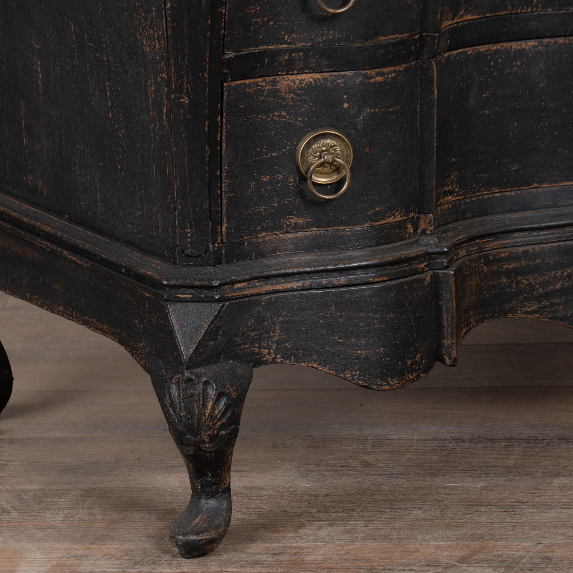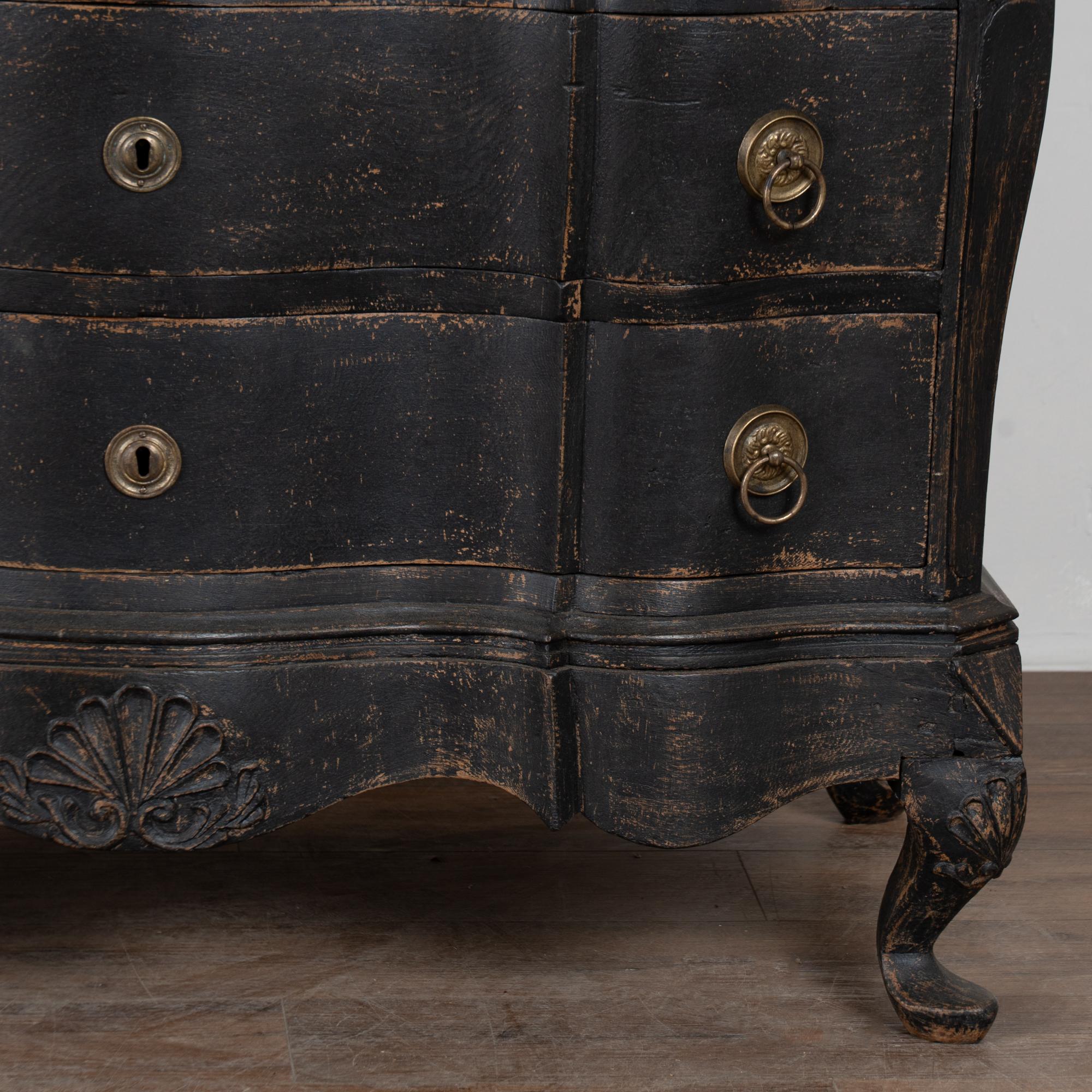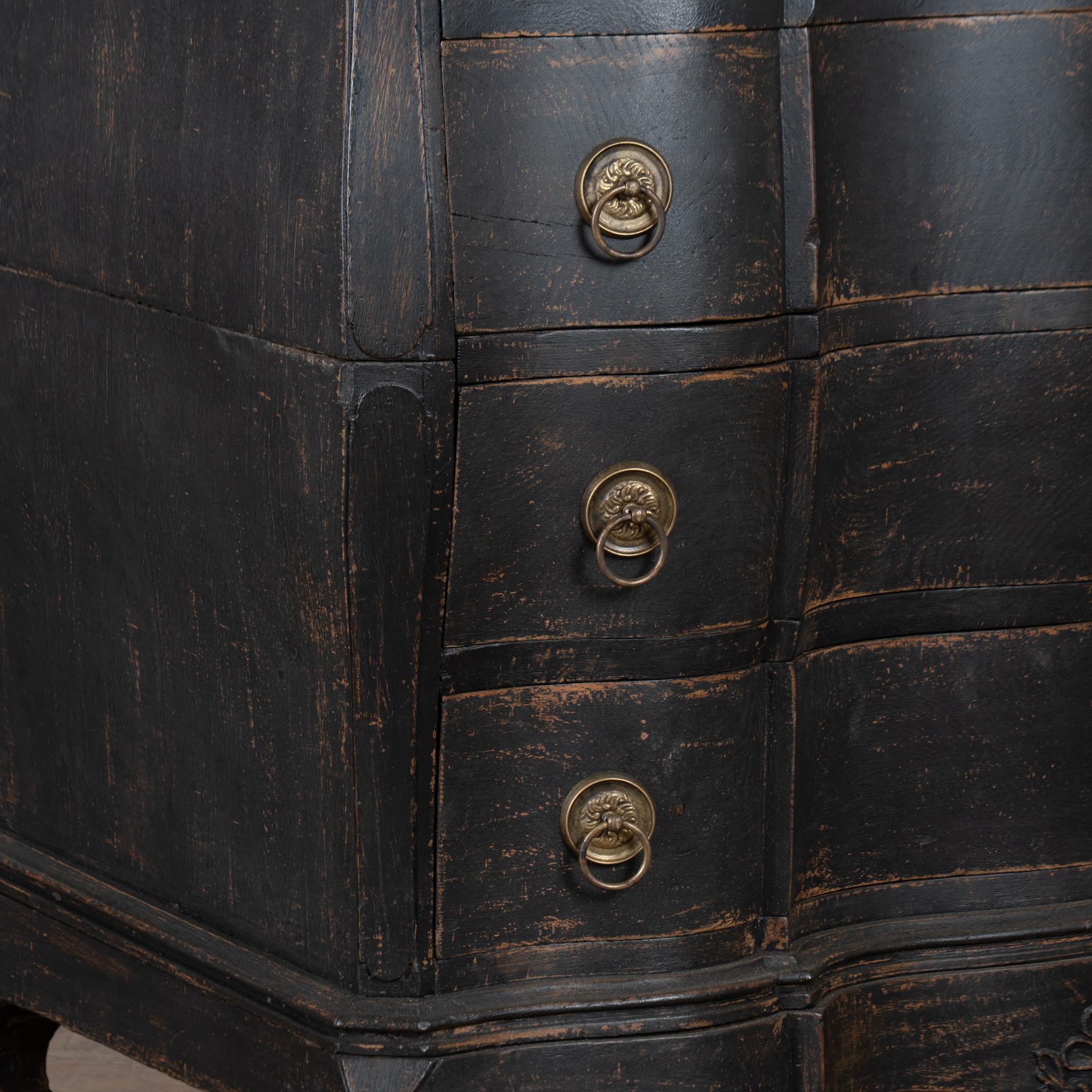 Large 18th-century Danish oak chest of drawers featuring a dramatic rococo serpentine front and substantial proportions. The chest has a newer professionally applied layered black painted finish, lightly distressed to reveal natural oak beneath and suit the aged character of this early piece. It rests on a carved scalloped skirt with curvaceous feet, adding strong visual presence.