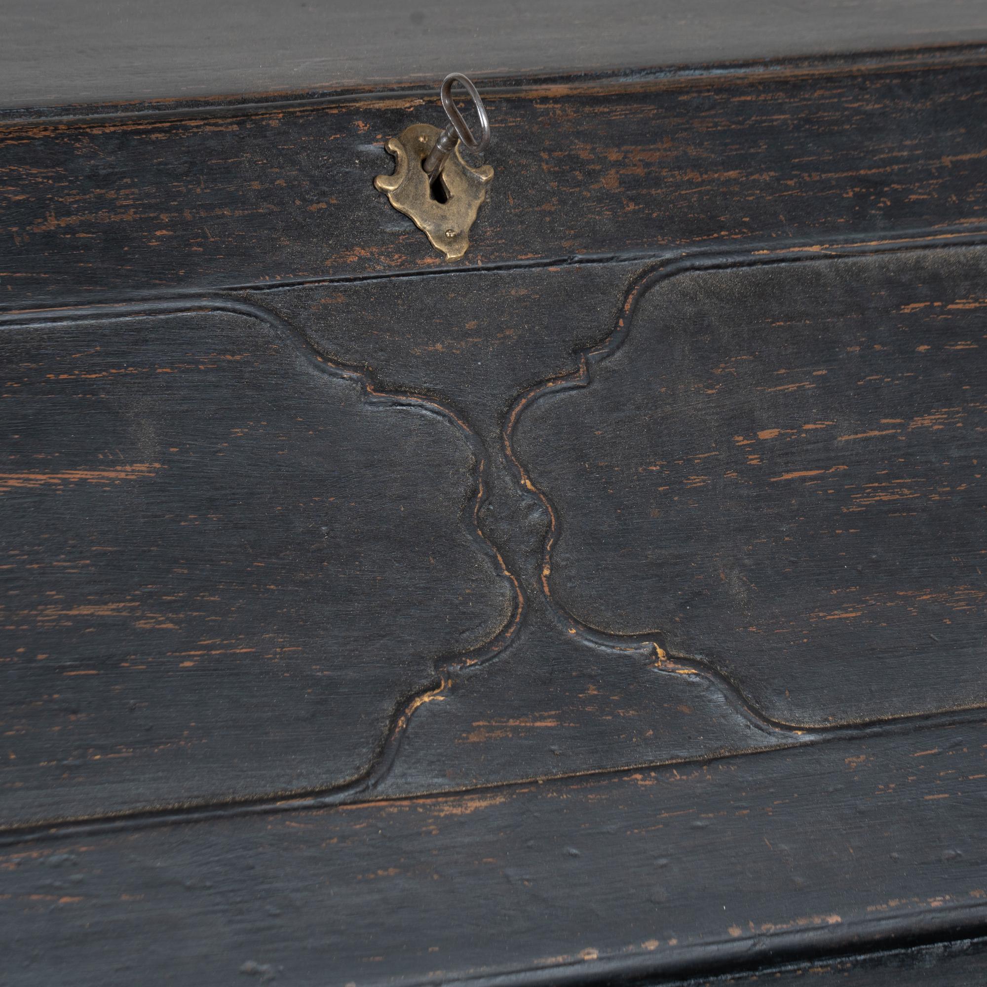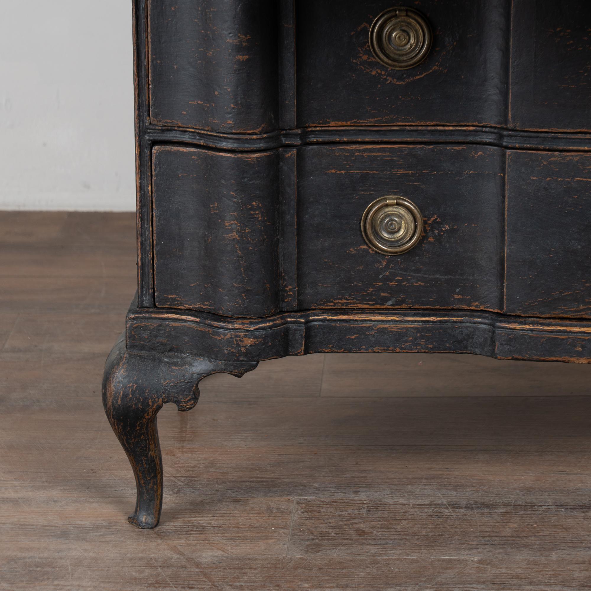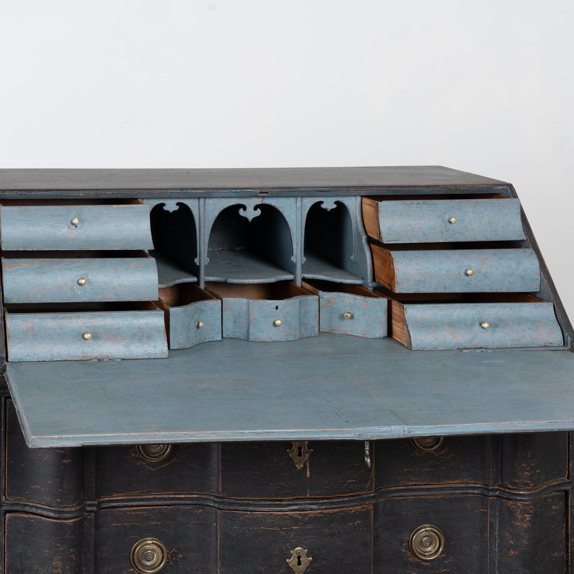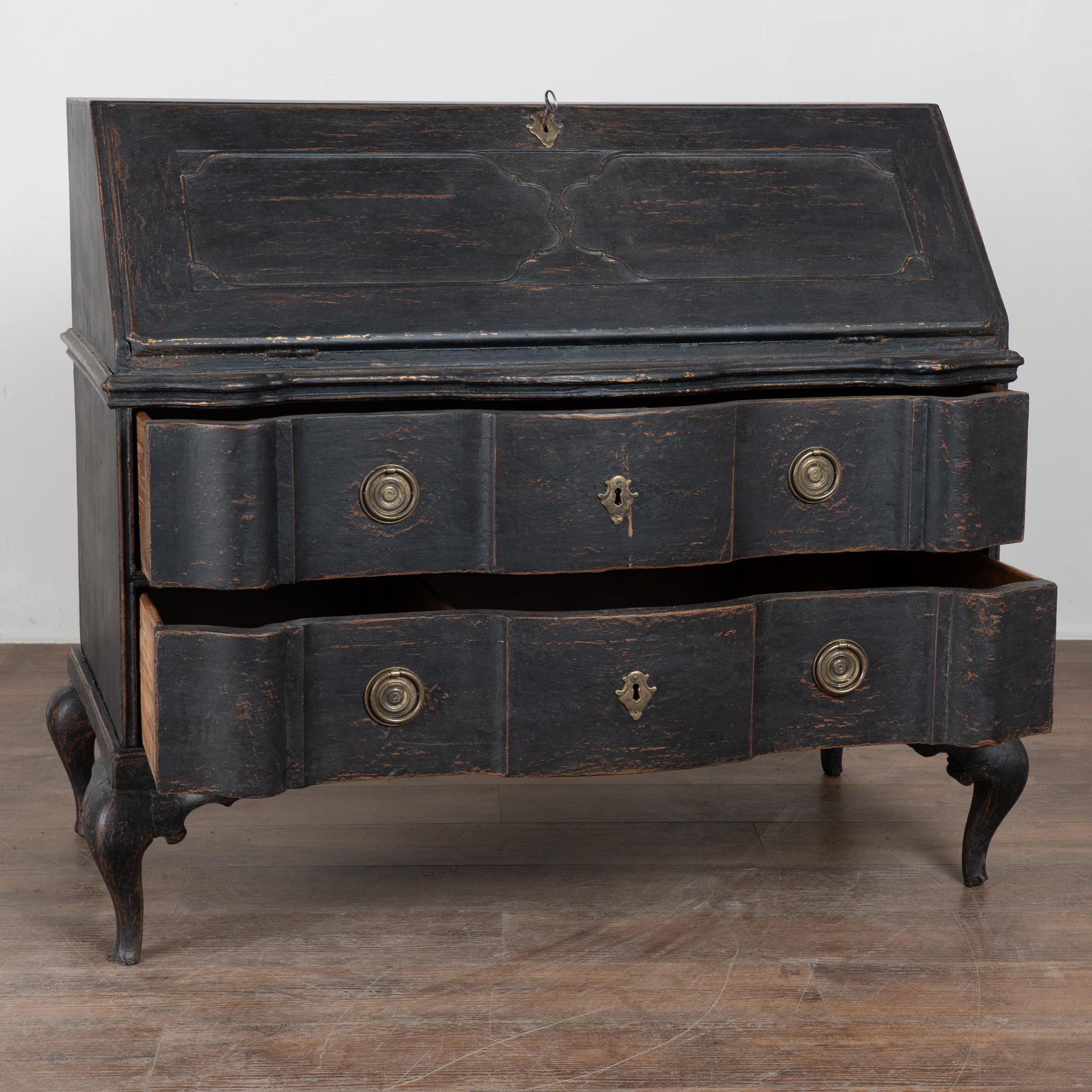 Early 19th-century Danish pine secretary bureau with a newer professionally applied layered black painted finish, selected to suit the age and style of the piece. The lower drawers feature a serpentine front that adds a graceful, romantic profile, with the lowest drawer divided into three interior sections. Drawer bottoms show typical age-related cracks and separation.