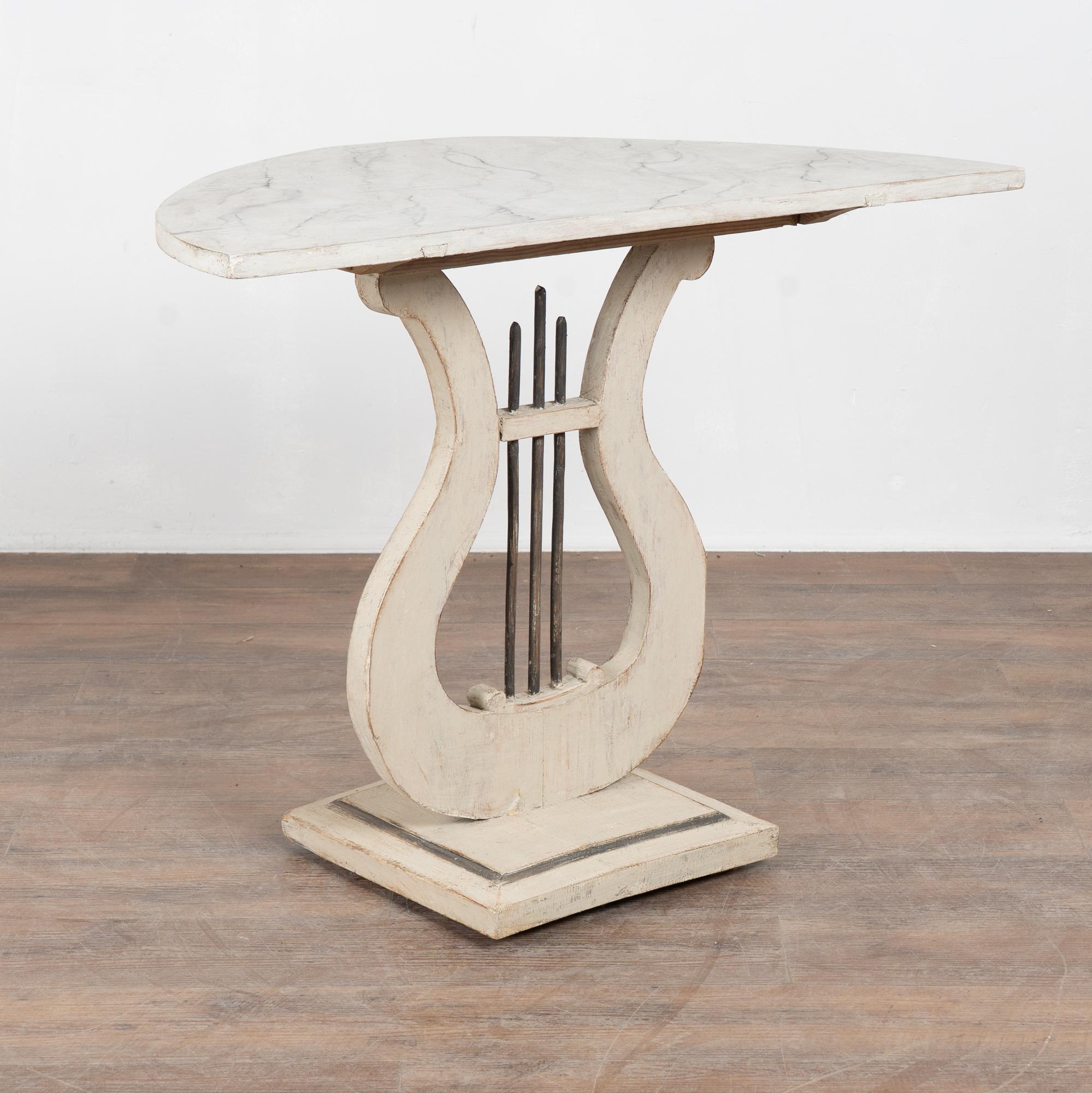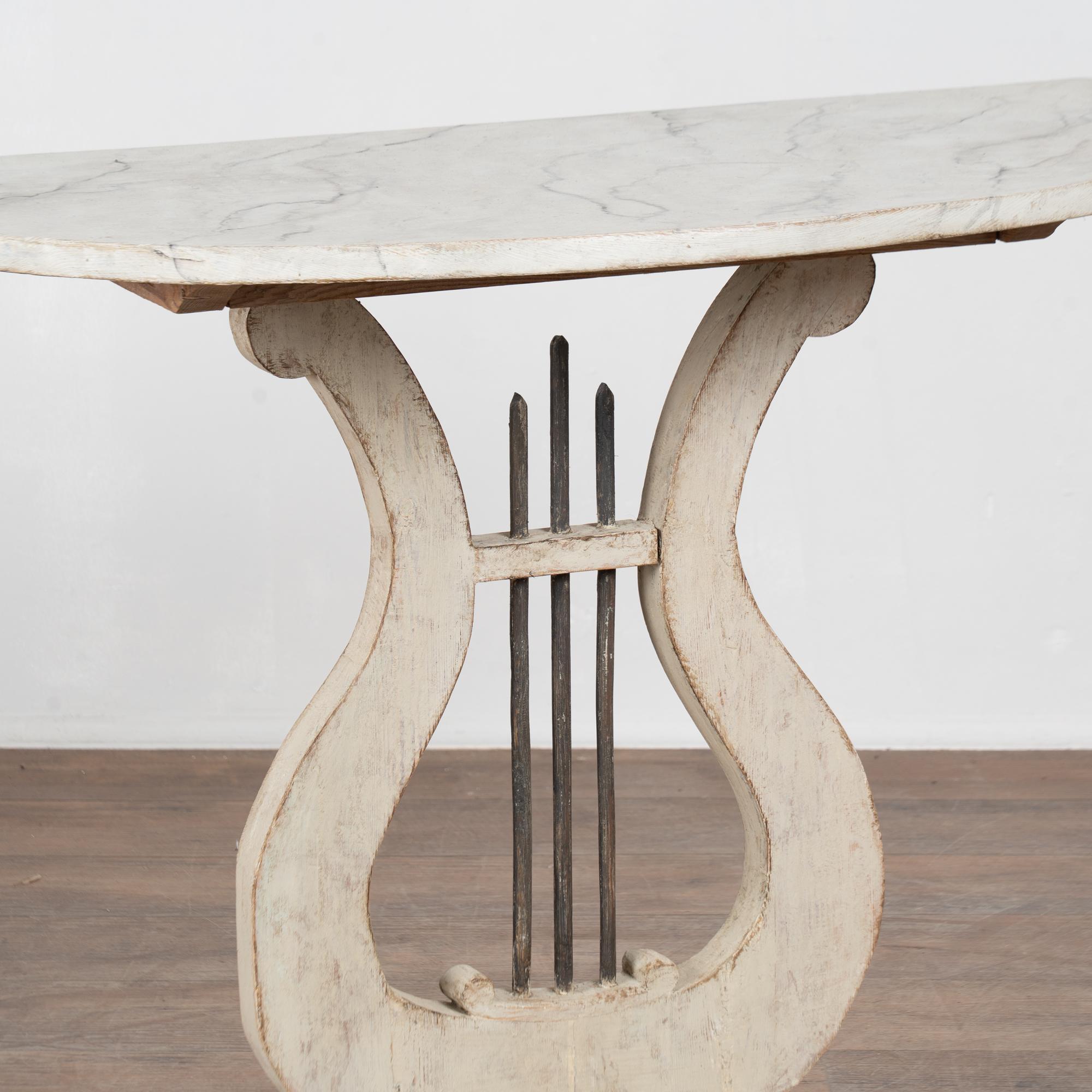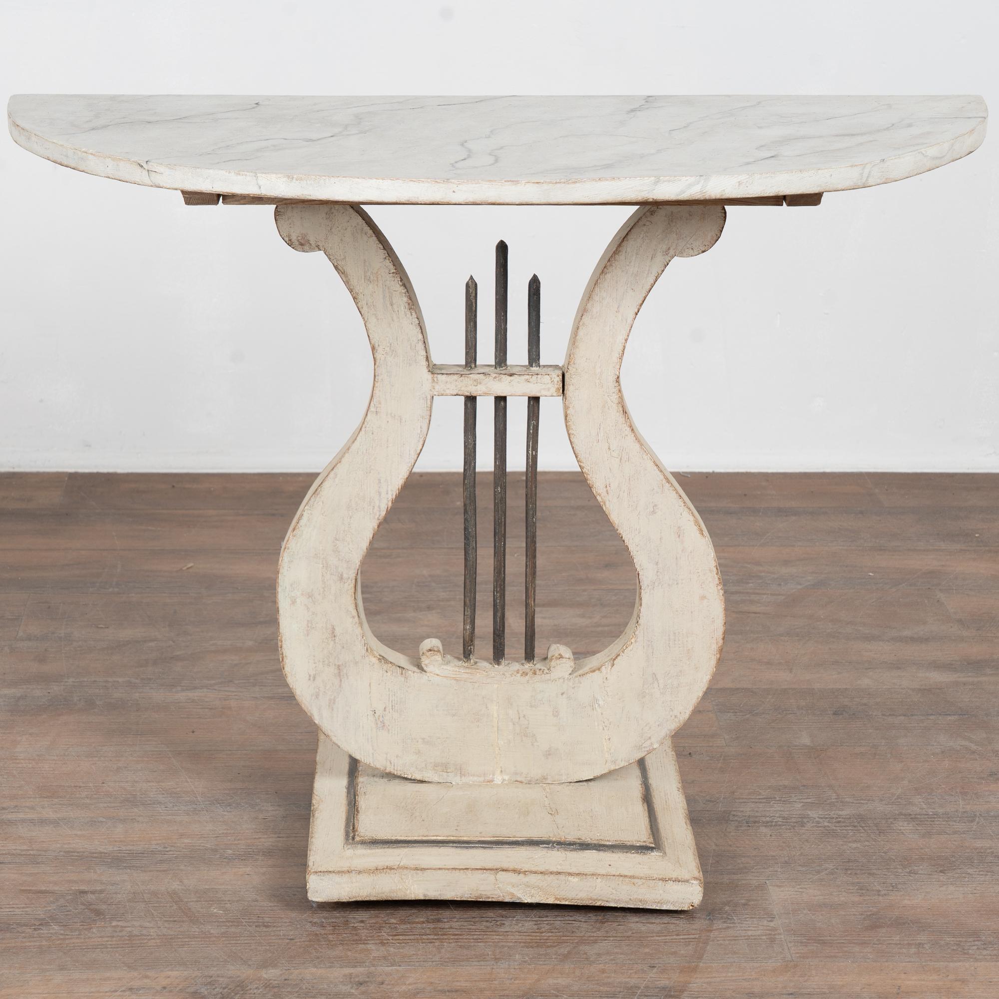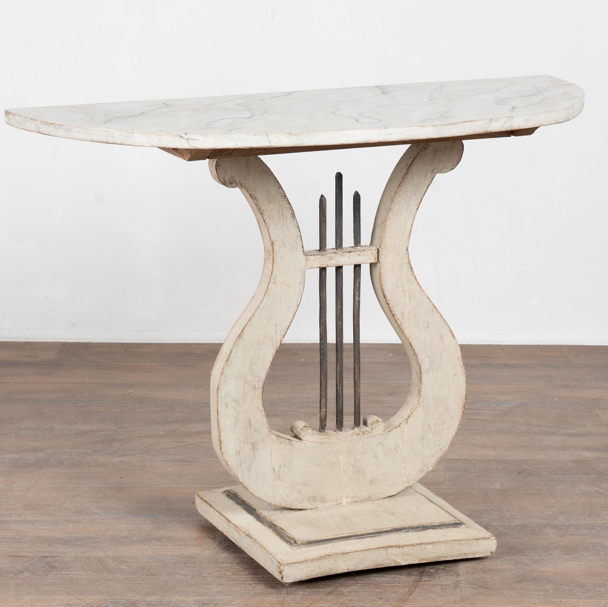 19th-century Swedish pine console table in a demilune, or half-circle form with a harp-shaped base. The table retains an antique white painted finish (while old, not original to the piece) with a contrasting traditional painted faux marble top, together presenting an overall soft gray tone. The base is accented with faded black trim, adding contrast to the painted surface.