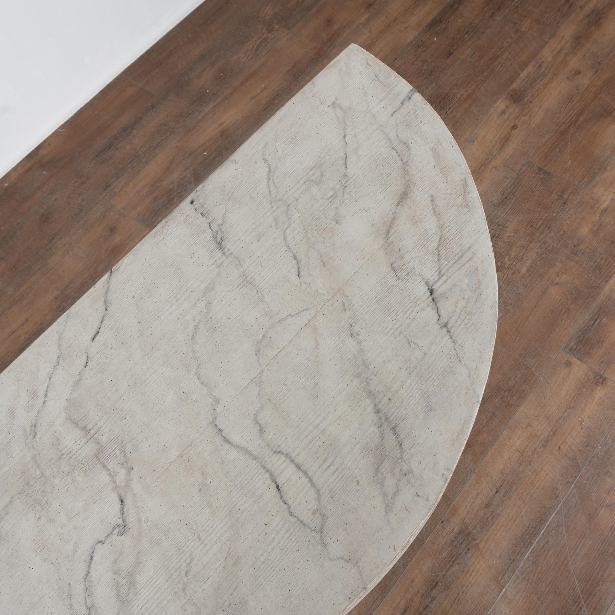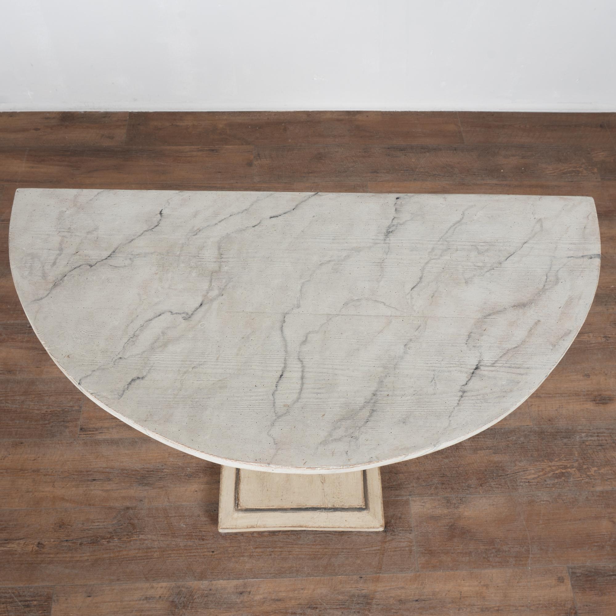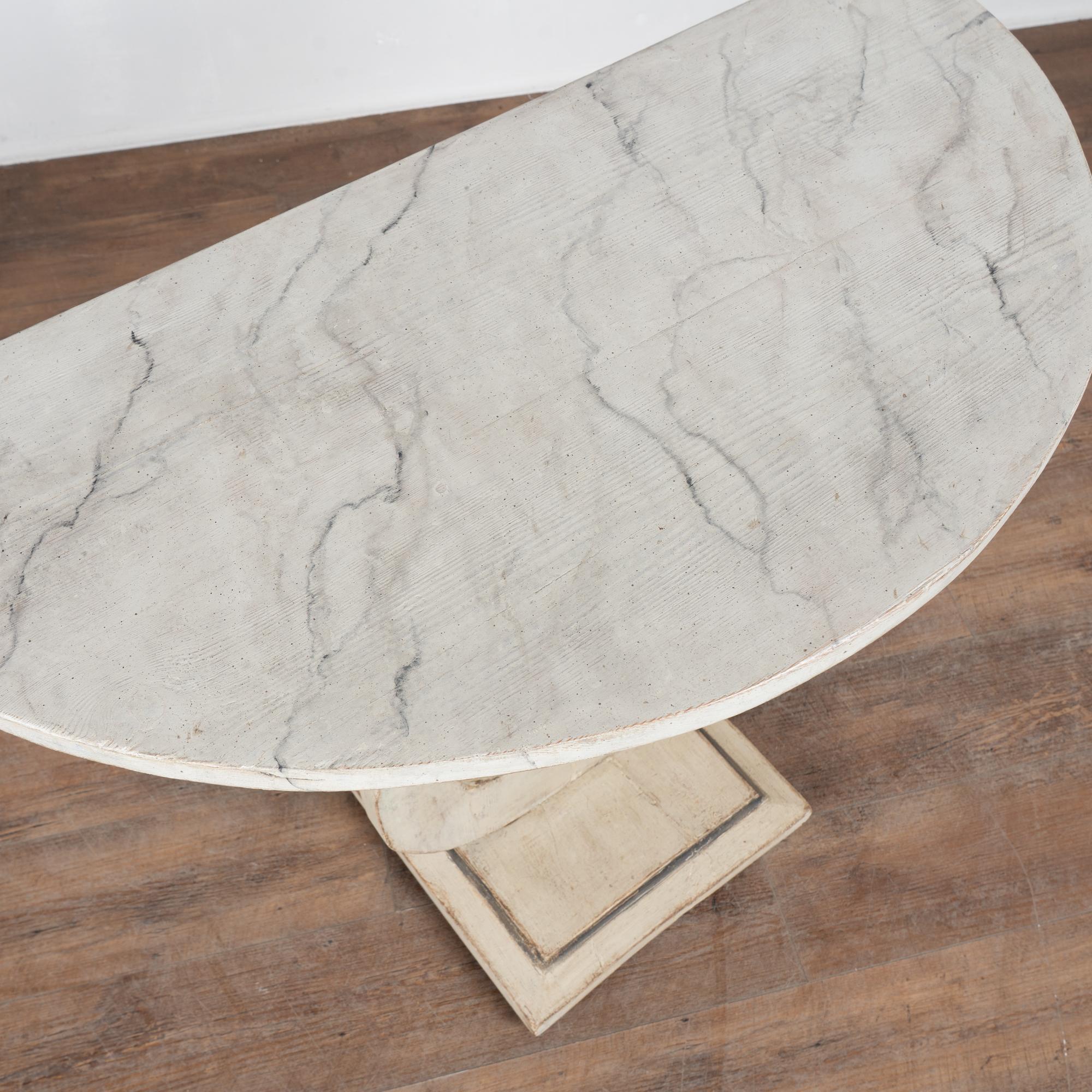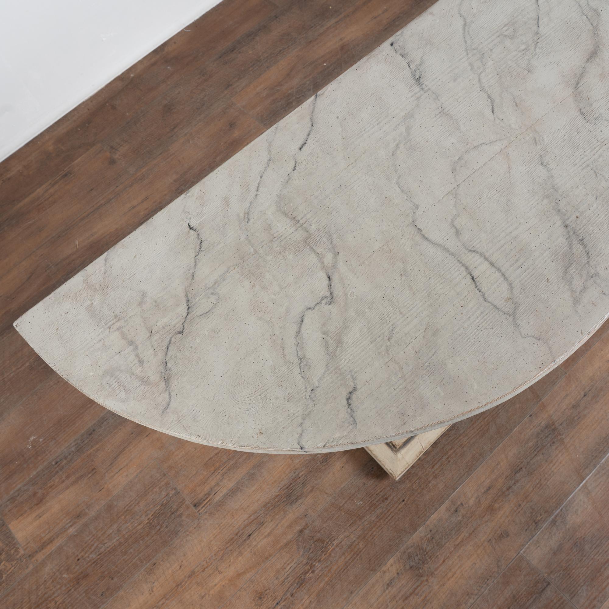 19th-century Swedish pine console table in a demilune, or half-circle form with a harp-shaped base. The table retains an antique white painted finish (while old, not original to the piece) with a contrasting traditional painted faux marble top, together presenting an overall soft gray tone. The base is accented with faded black trim, adding contrast to the painted surface.