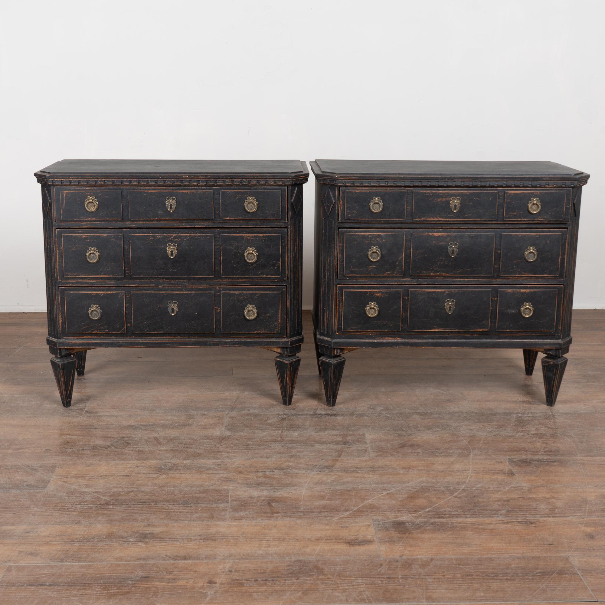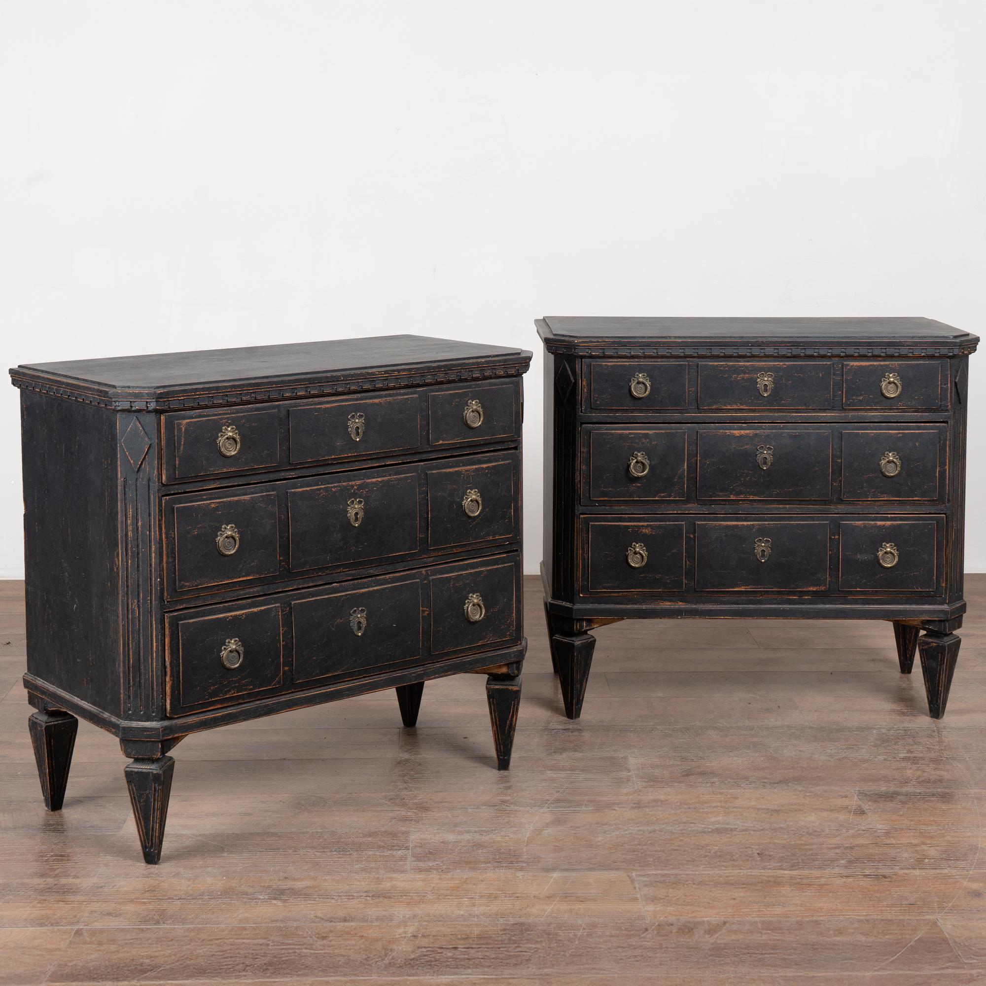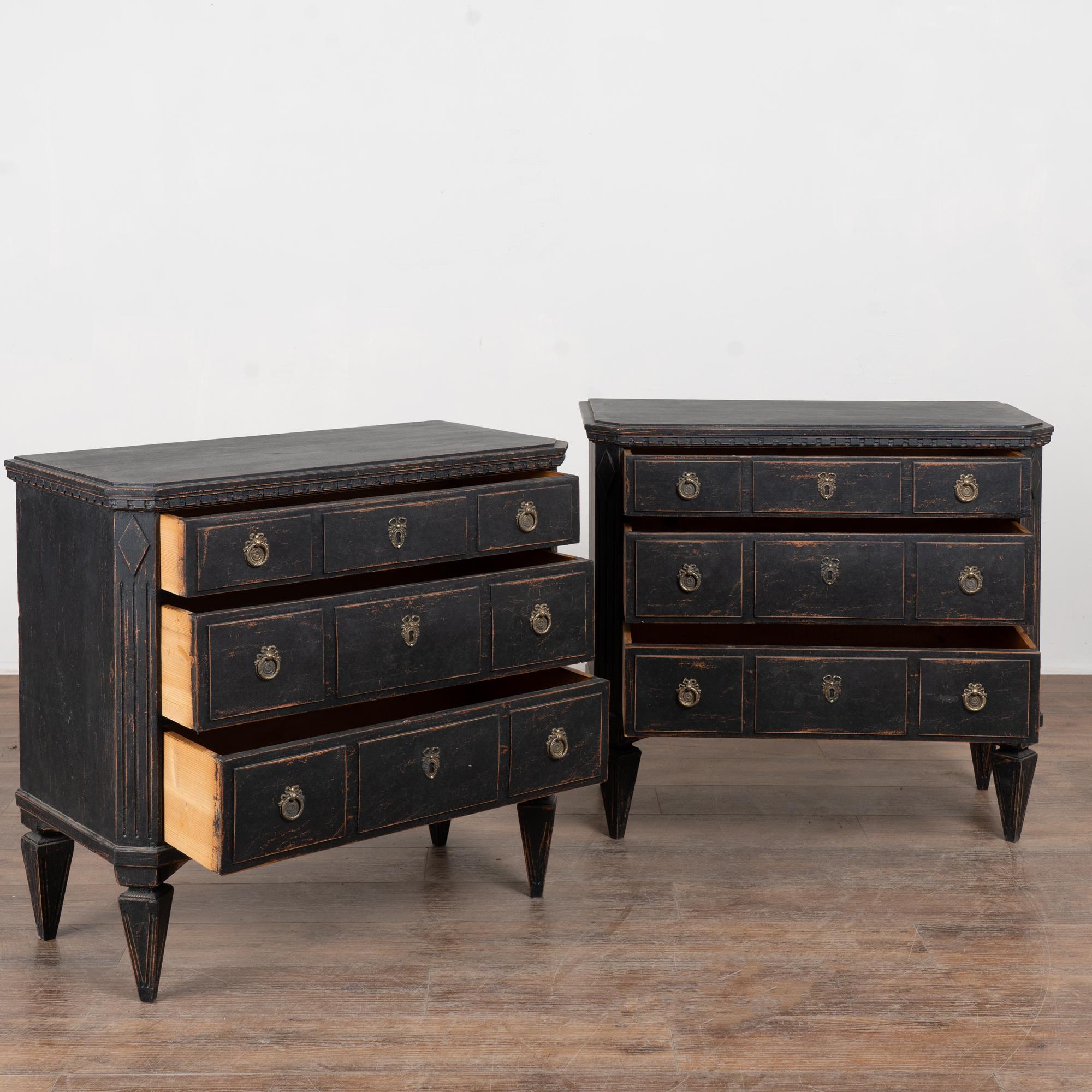 Pair of 19th-century Swedish Gustavian chests of drawers crafted in pine with newer professionally applied layered black painted finish. The paint has been lightly distressed to reveal natural pine beneath, complementing the age of the pieces.
