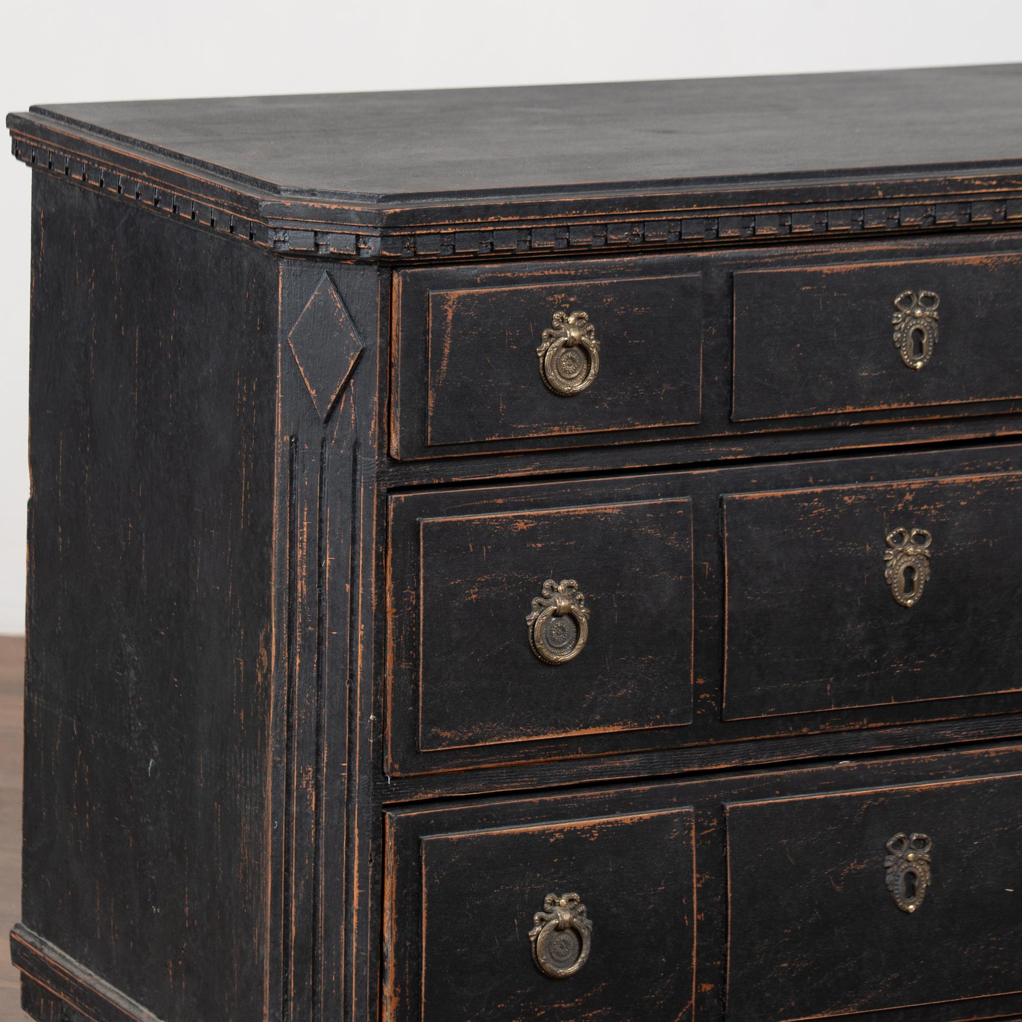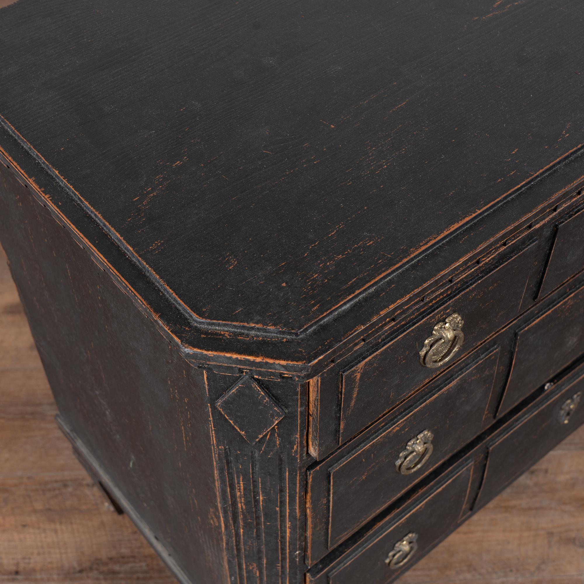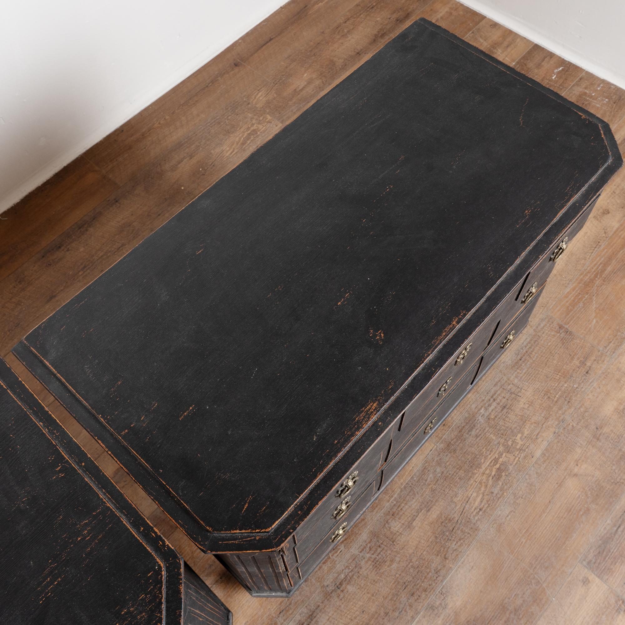 Pair of 19th-century Swedish Gustavian chests of drawers crafted in pine with newer professionally applied layered black painted finish. The paint has been lightly distressed to reveal natural pine beneath, complementing the age of the pieces.