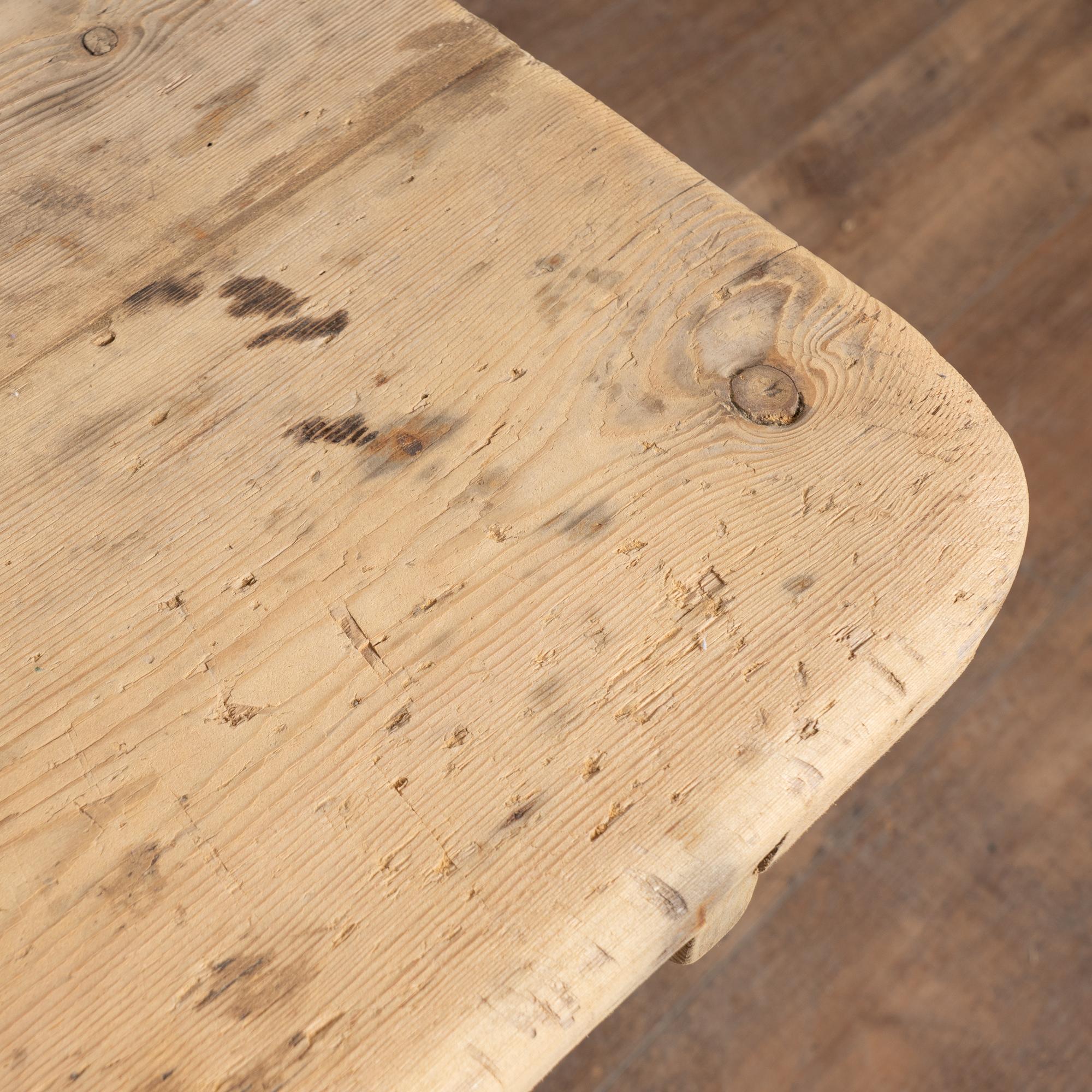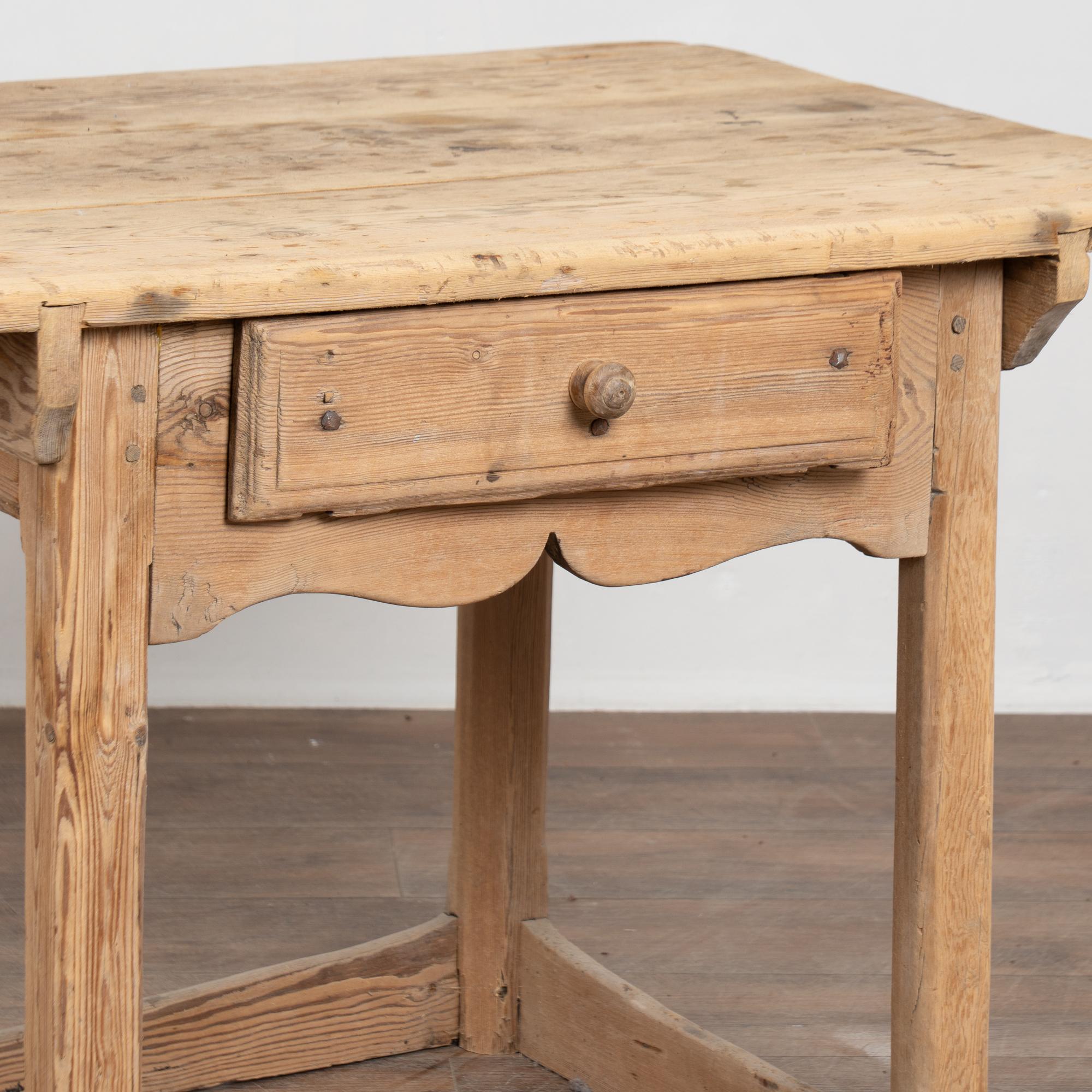 19th century rustic pine side table constructed of pine with a single drawer and wooden pull. The table rests on a square stretcher base and features a slightly scalloped apron with simple carved trim beneath the drawer. The wood has been left raw, contributing to an organic and utilitarian appearance. Evidence of prior use suggests it may have functioned as a work table, reflected in surface wear to the top including stains, gouges, nicks, and general wear. Age-related cracks are present along areas of the base and legs. The piece has been restored, is structurally strong, stable, and ready for use.
