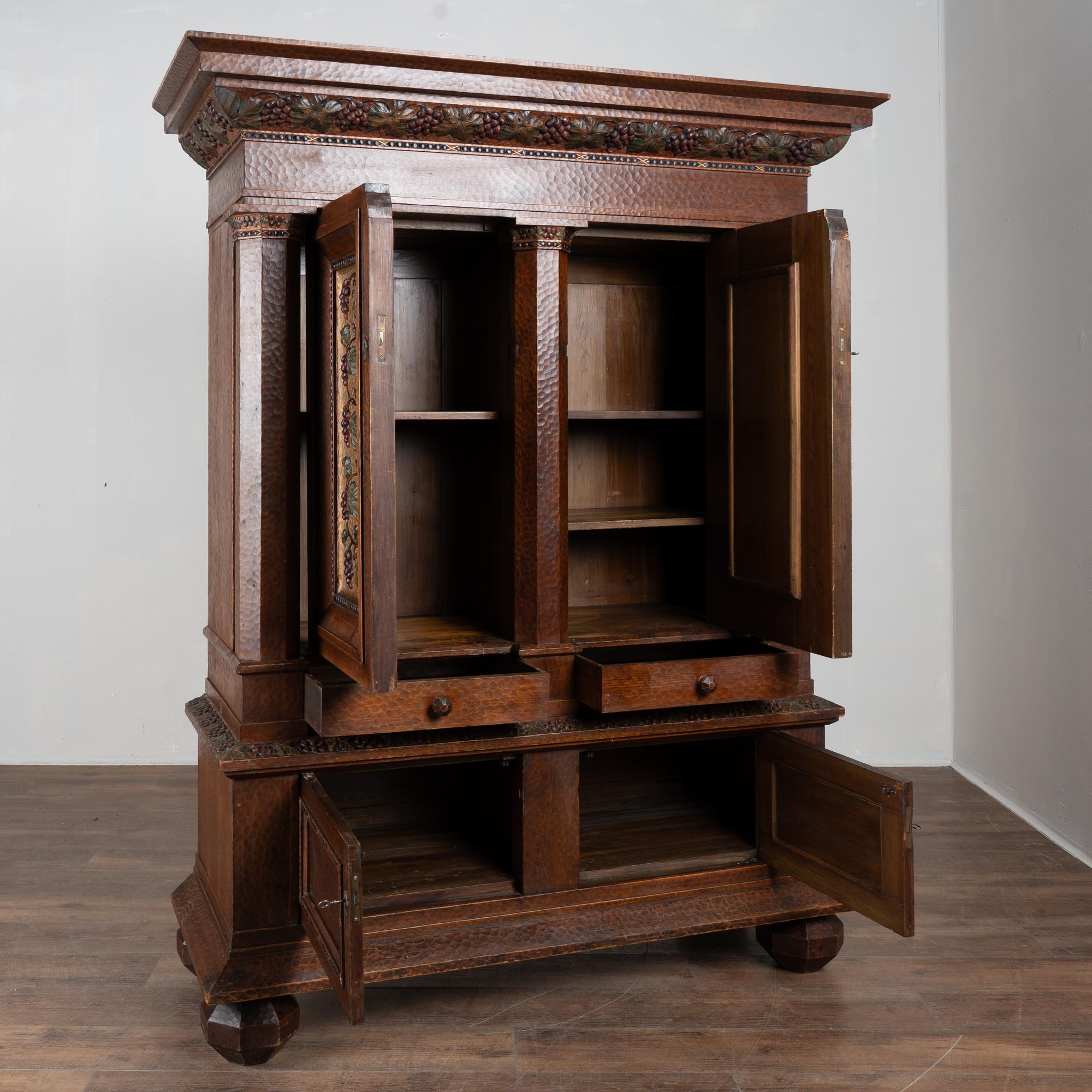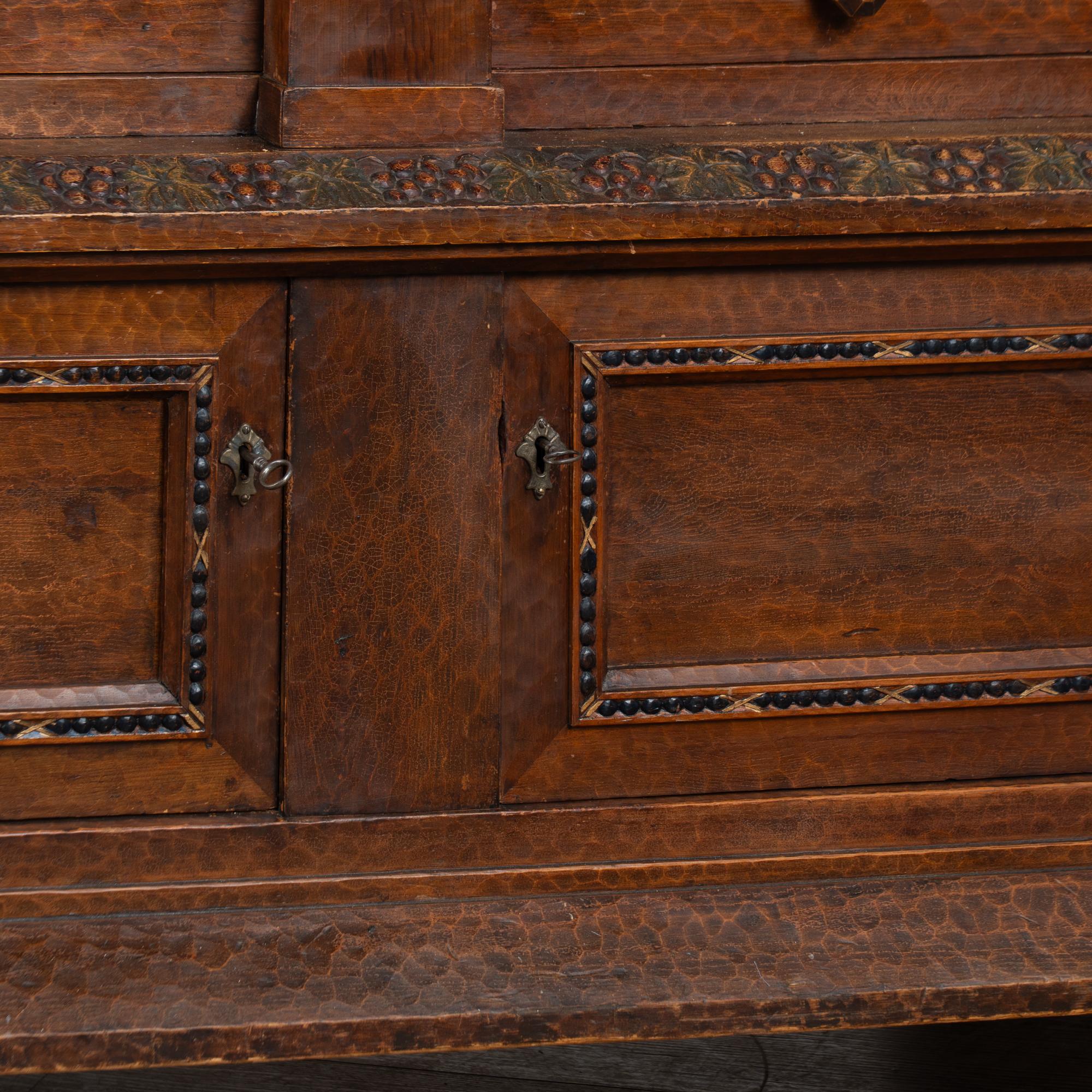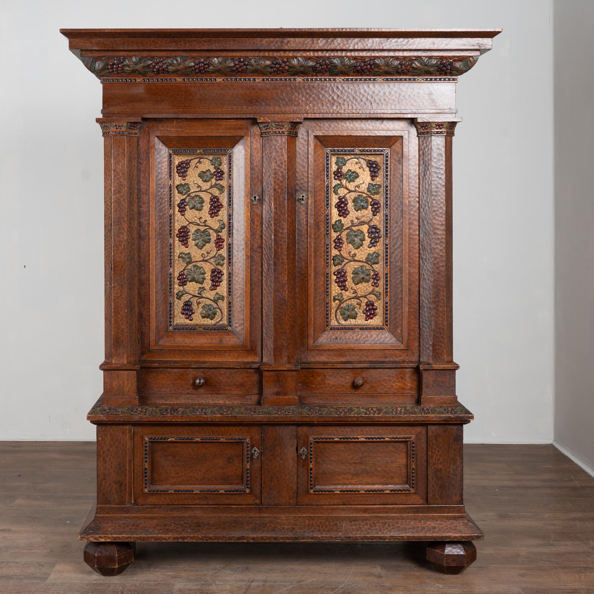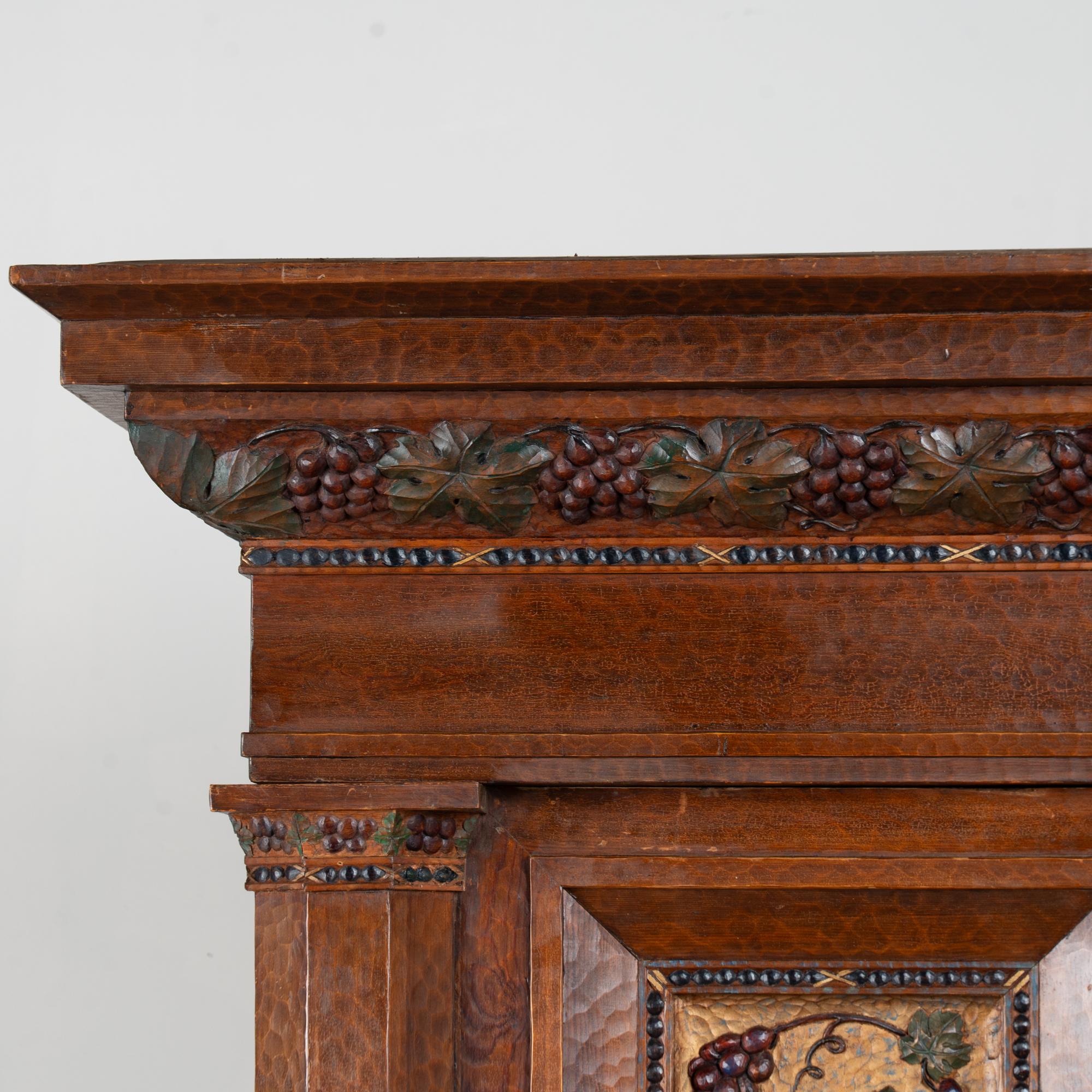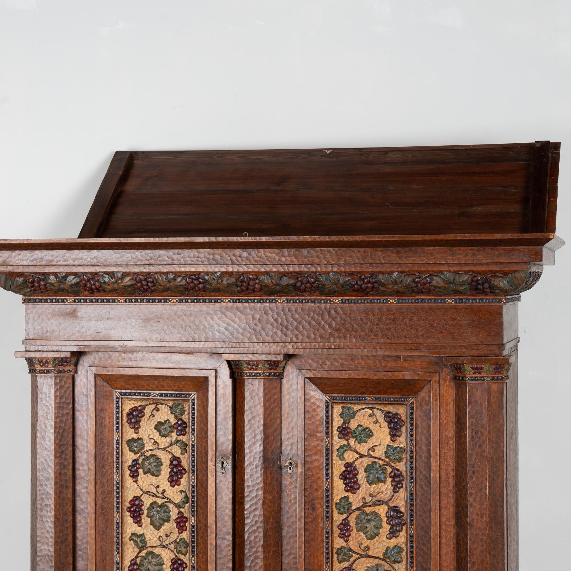 19th-century Swedish pine cabinet richly decorated with extensive hand carving throughout. Grape and vine motifs appear across the paneled doors, crown, and central details, with deeply carved surfaces showing the marks of hand tools and resulting organic texture. Panels feature a gold painted background with green leaves and deep purple-red grapes. This may serve as impressive storage as liquor cabinet or for wine, cocktail and glassware.