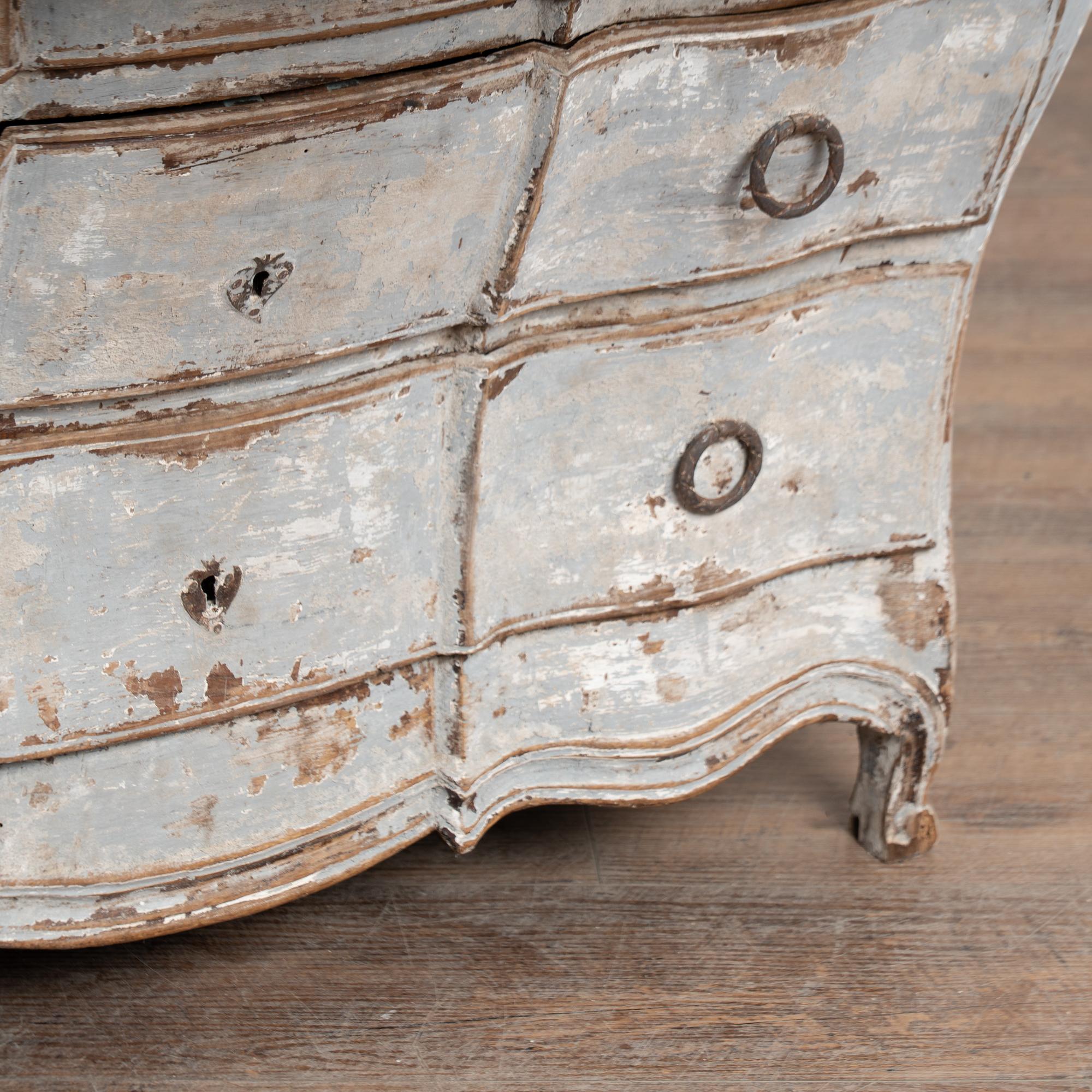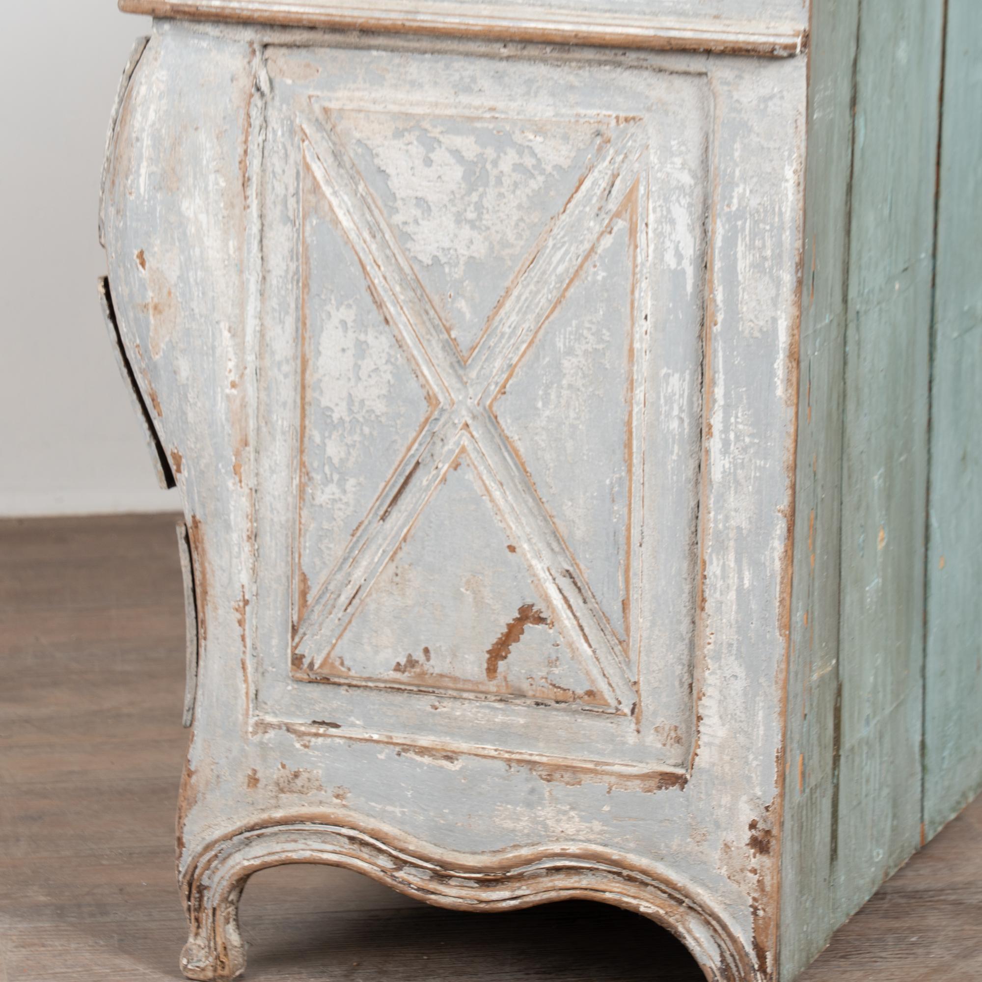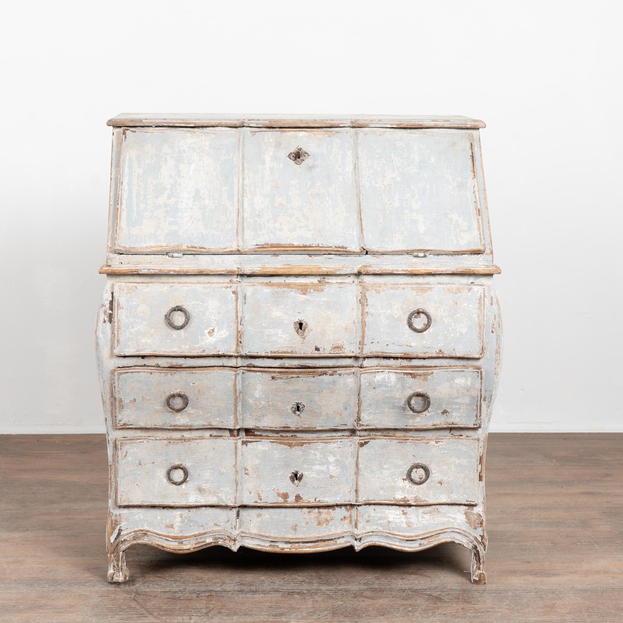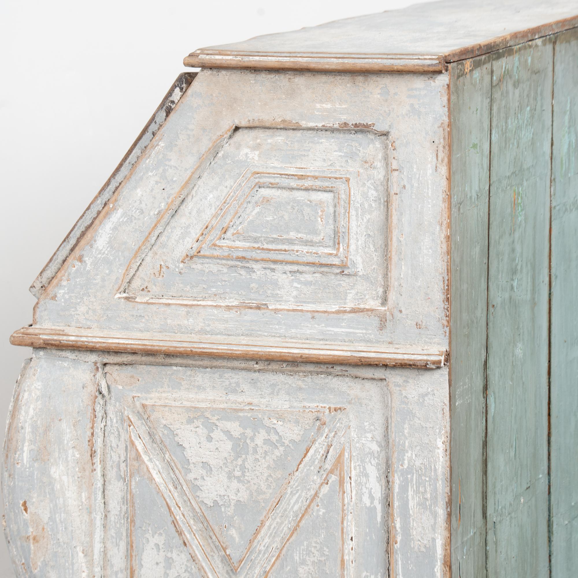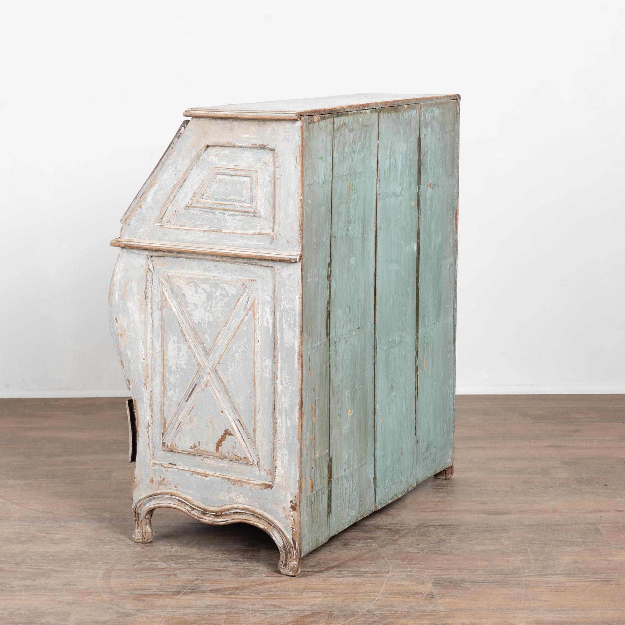Swedish oak ladies’ writing desk or secretary featuring a Bombay-curved lower chest with three drawers. The side panels are carved with an X motif, and the case rests on a scalloped skirt with shaped feet. An earlier blue-gray painted finish was later painted white and subsequently scraped, revealing layered paint surfaces, exposed oak, and signs of long use.