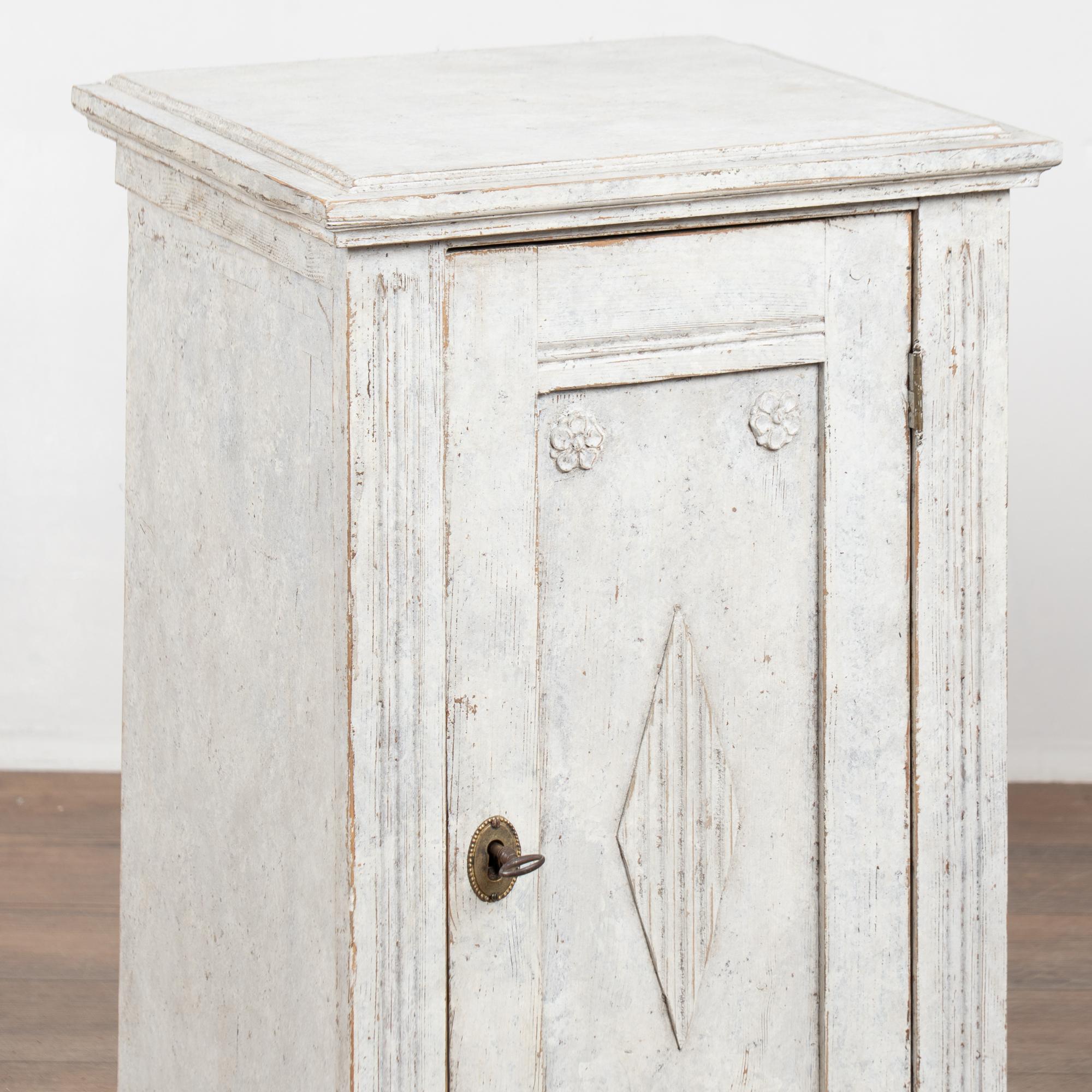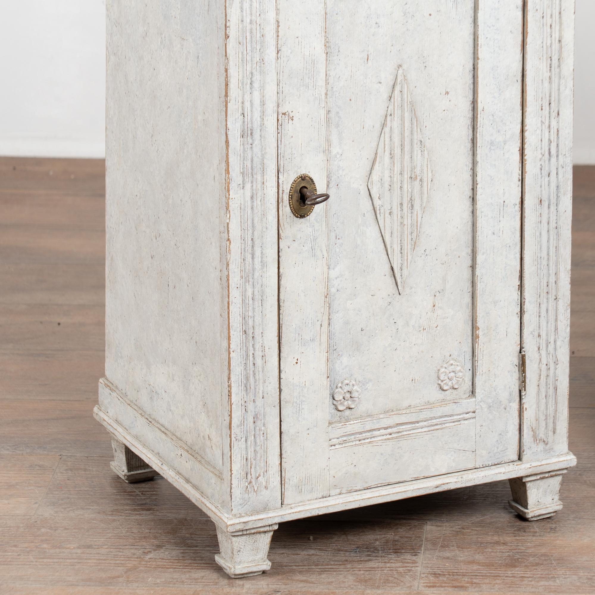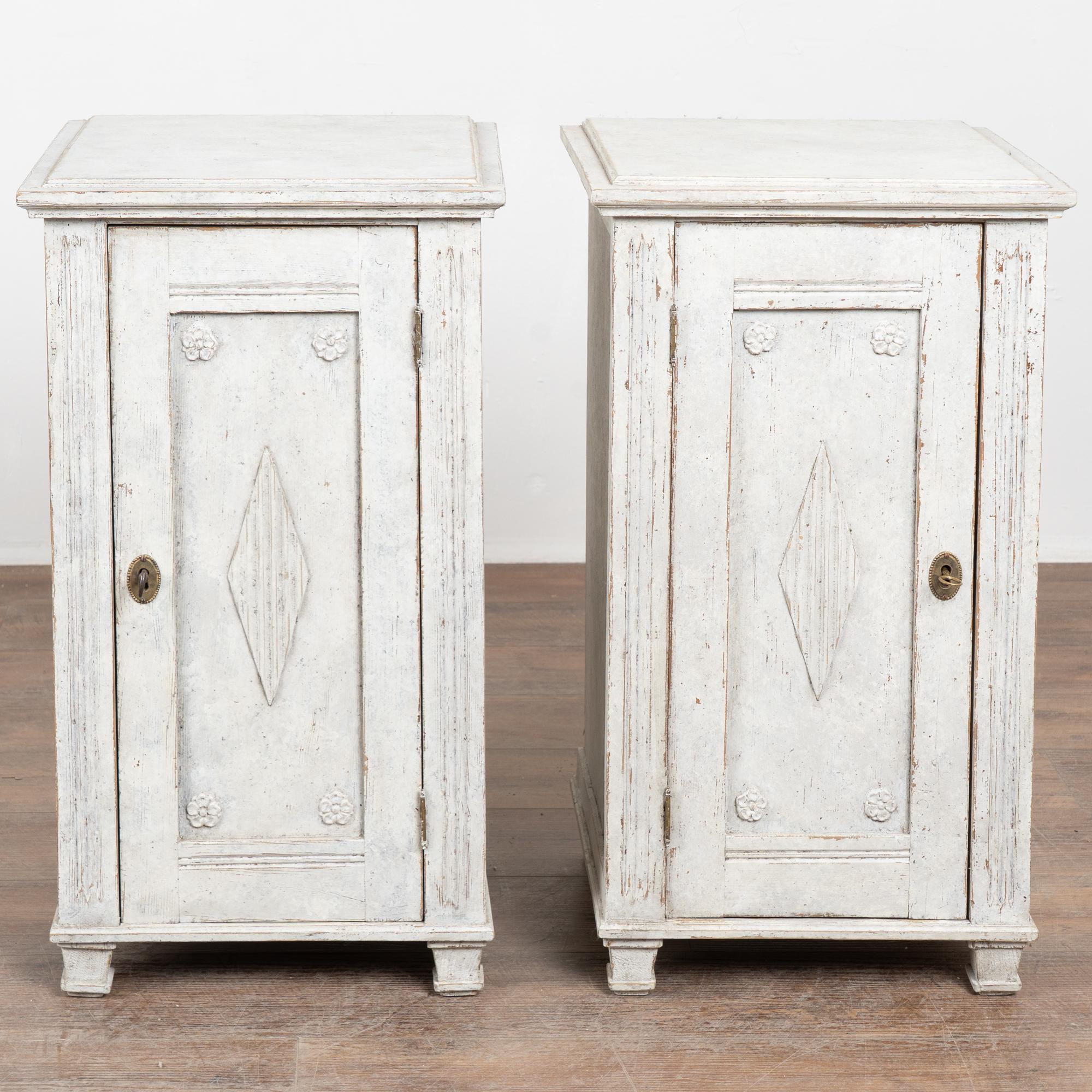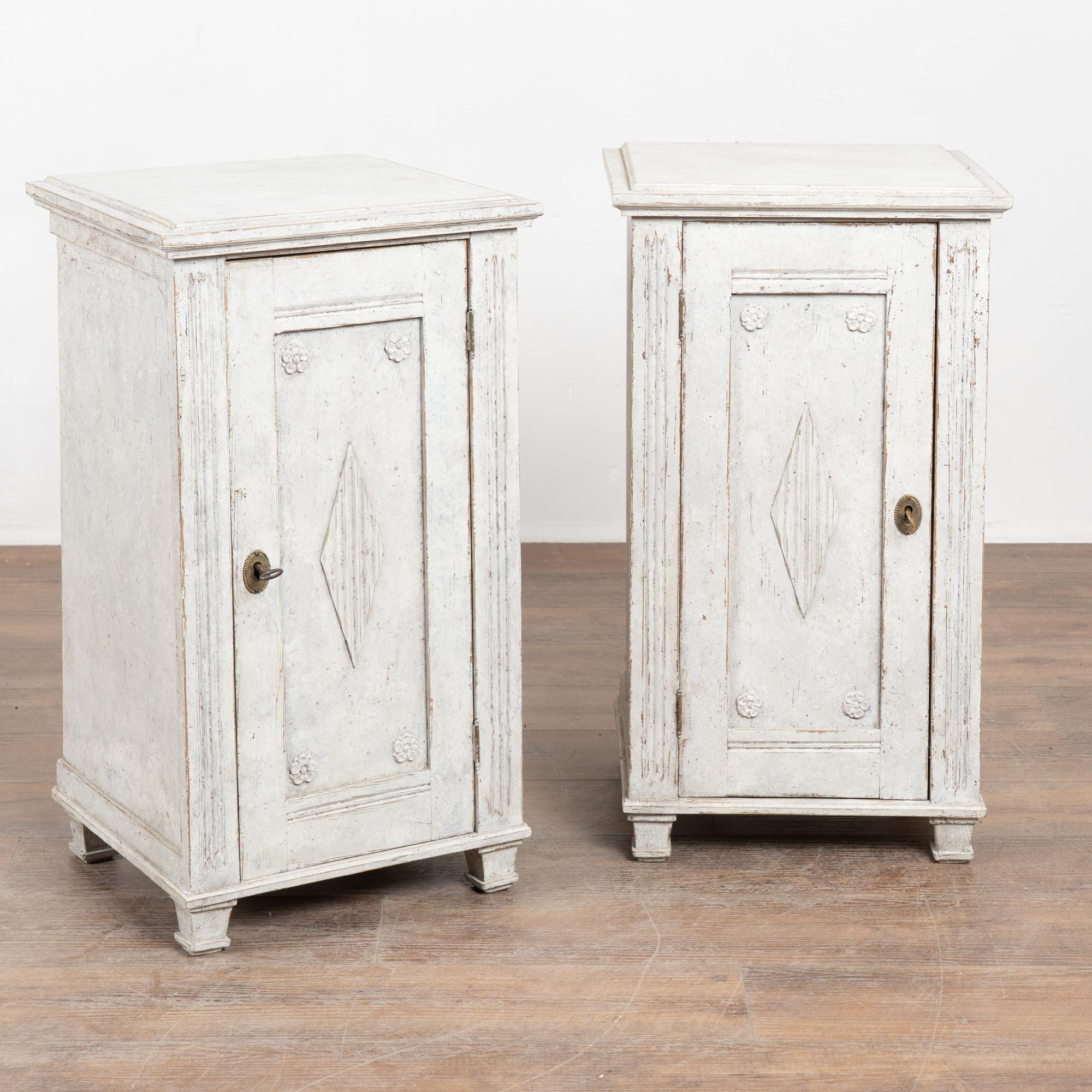 19th-century Swedish Gustavian pair of narrow pine cabinets, well suited for use as nightstands or small storage pieces. Each cabinet opens to a single interior shelf and retains an old key and functioning lock, though operation is slightly stiff.